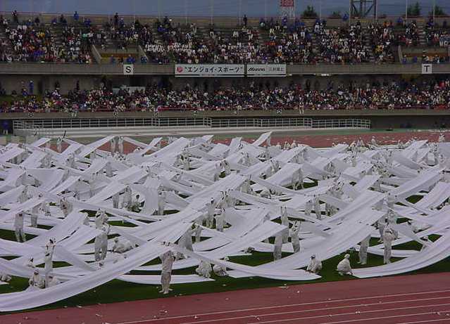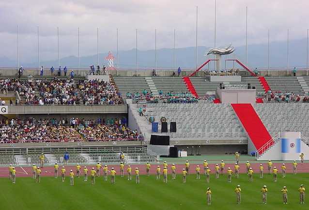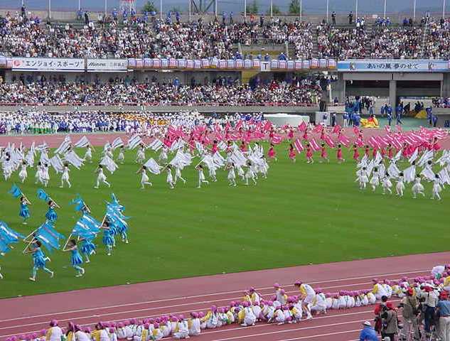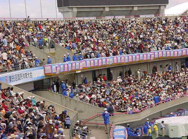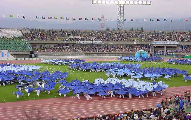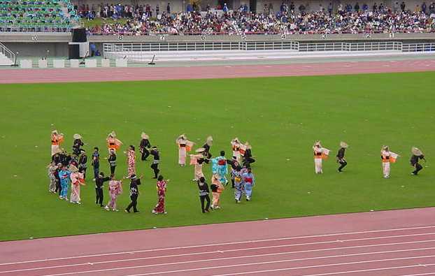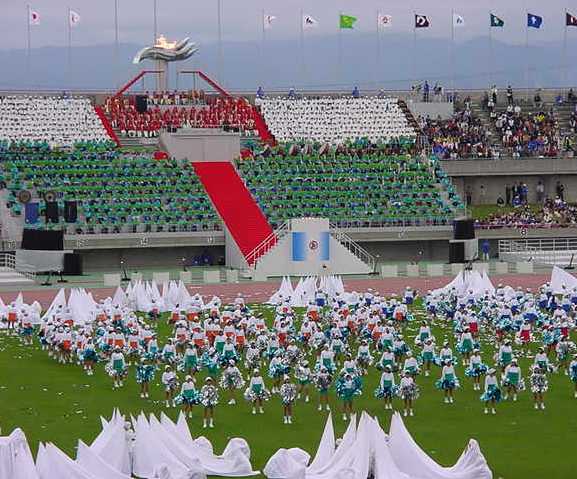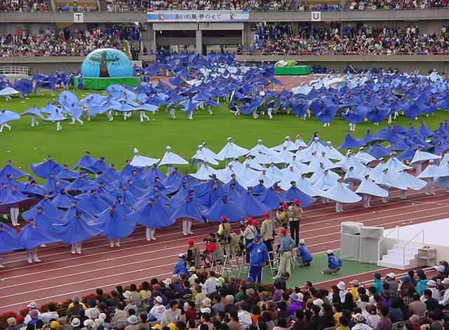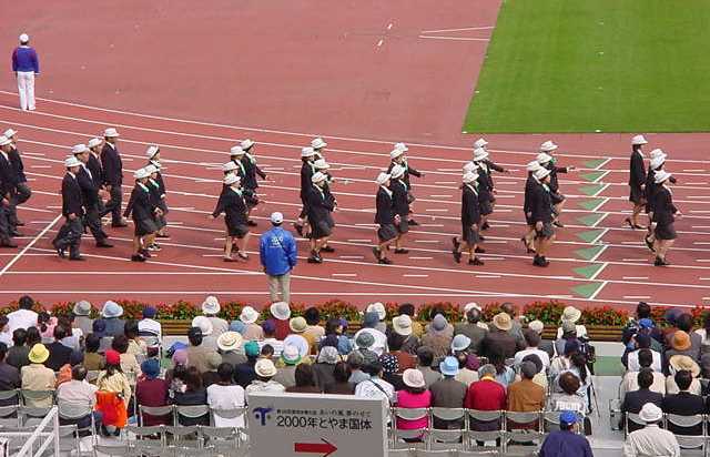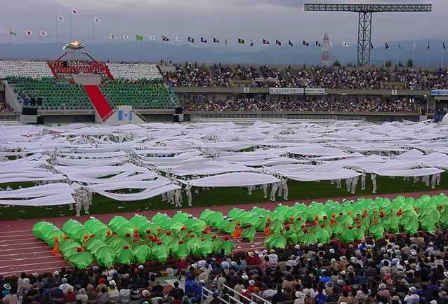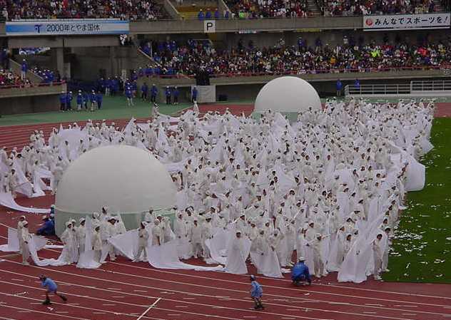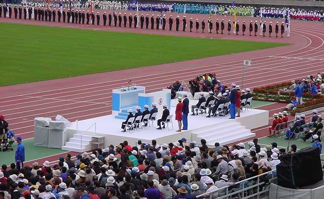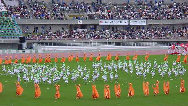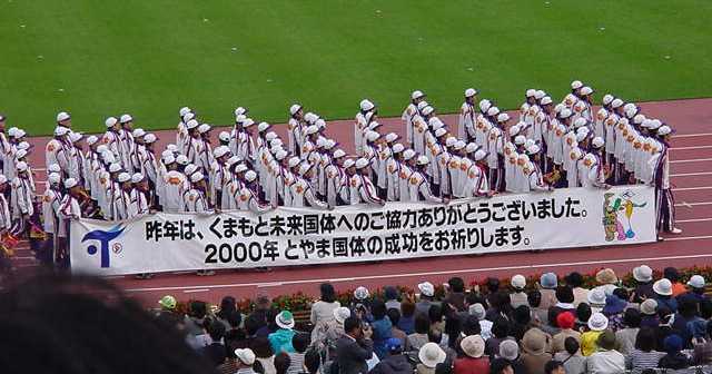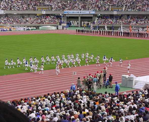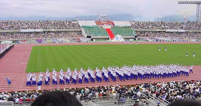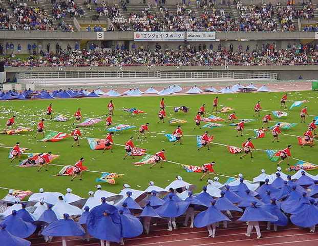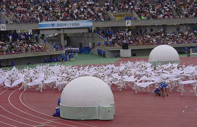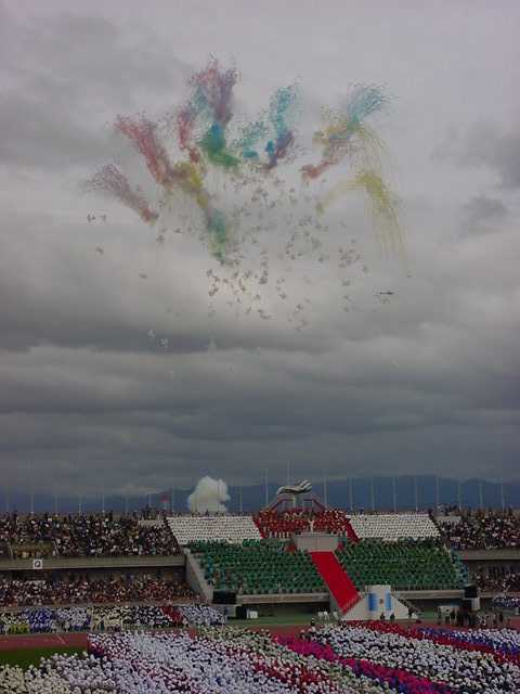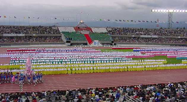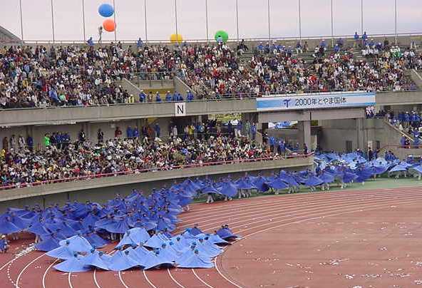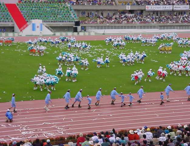 これまでの国体では、ここで天皇皇后が退席して、そのあとで やや閑散としたフィールドで「式典後演技」が行われると いうことでしたが、富山国体では初めて、いったん退席した 天皇皇后が再び席に着いて、そこで「式典後演技」を見る、 という画期的なことになりました。以下はその模様です。