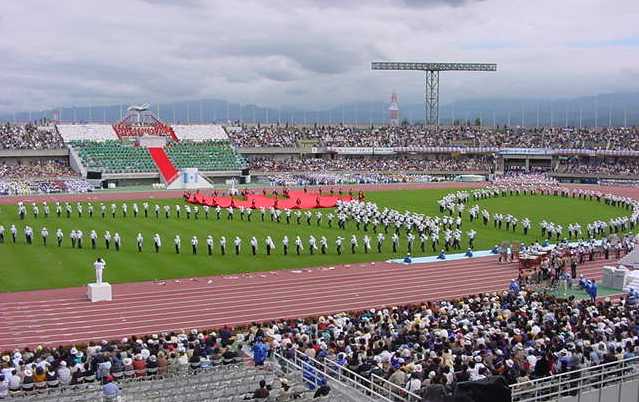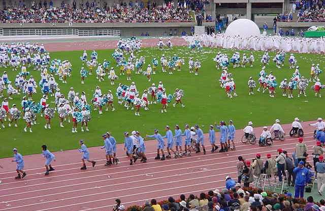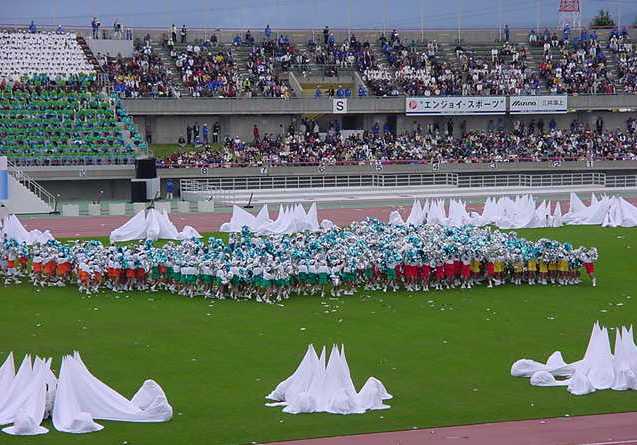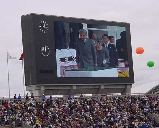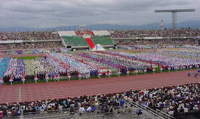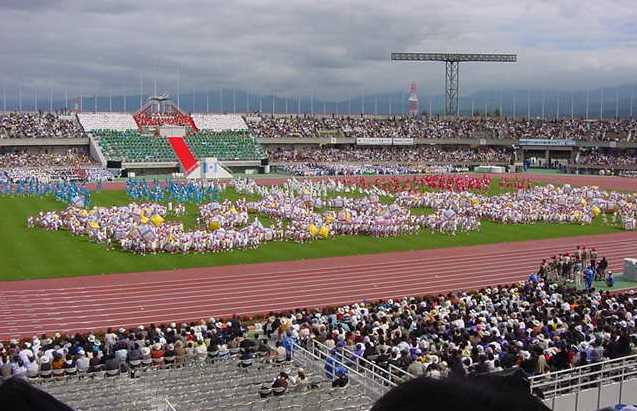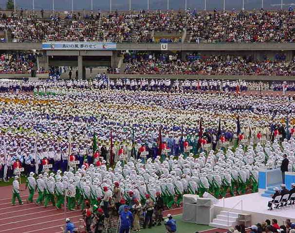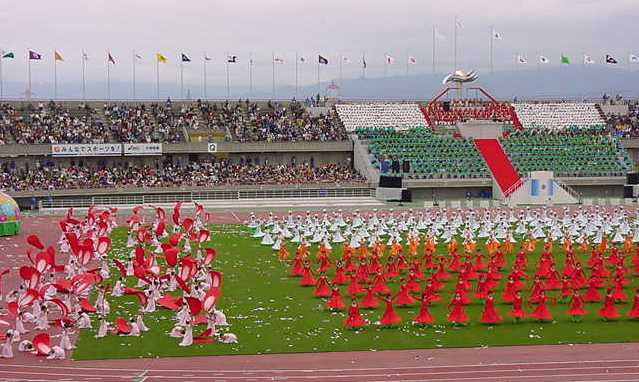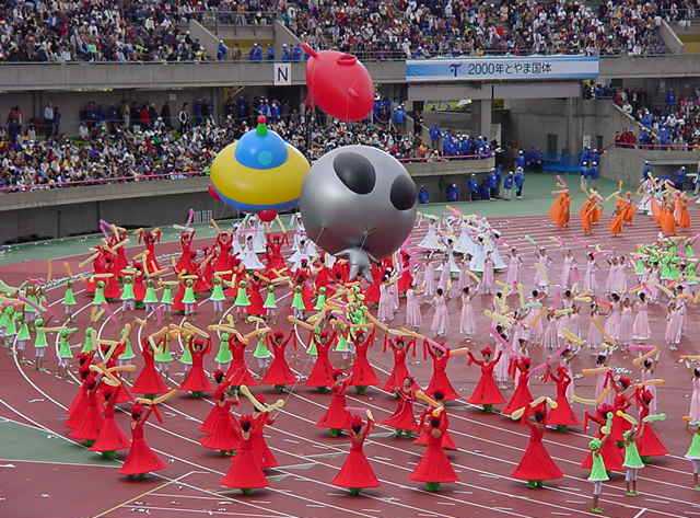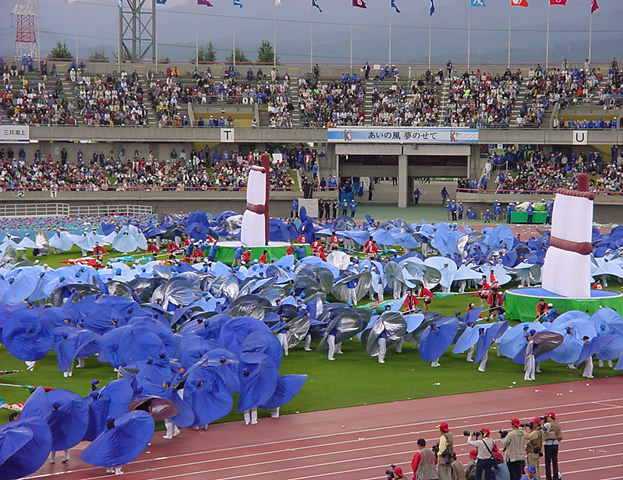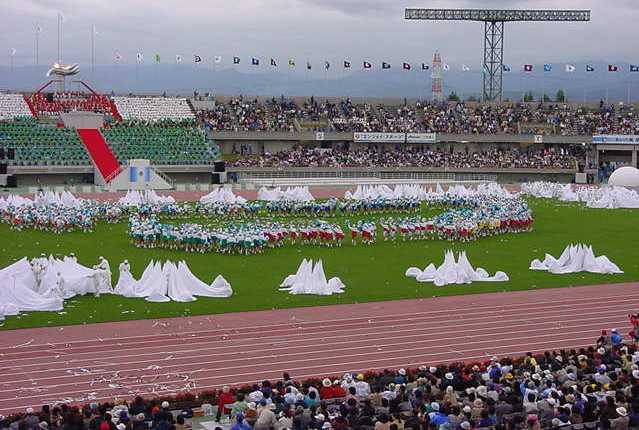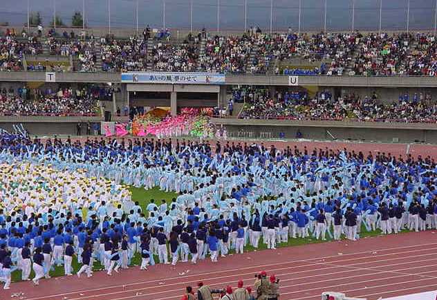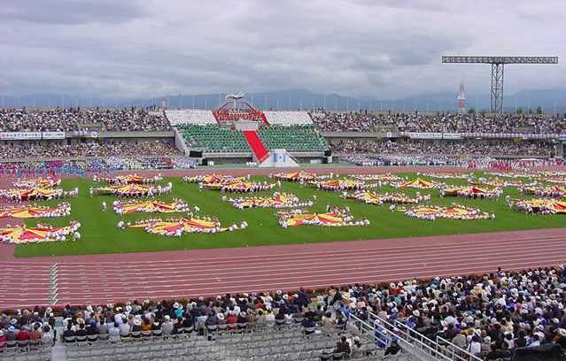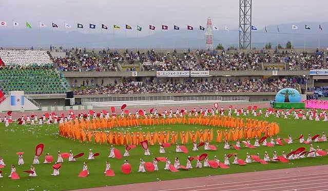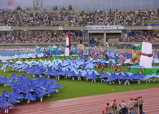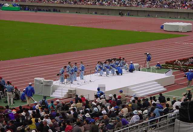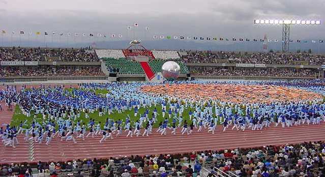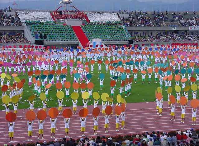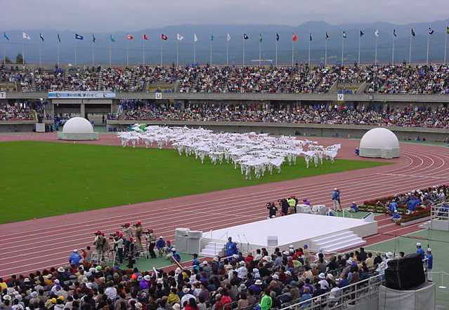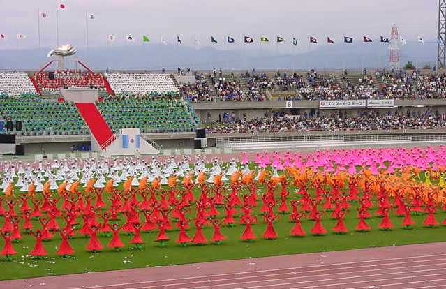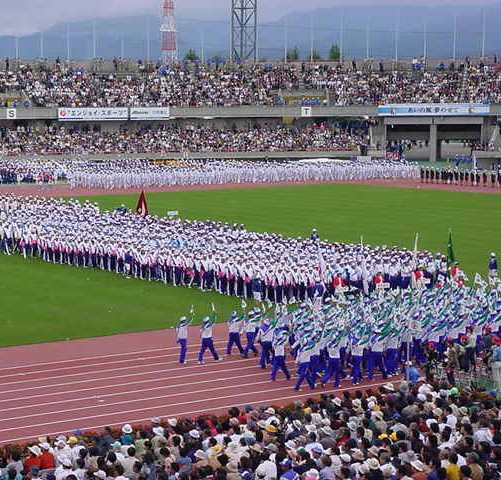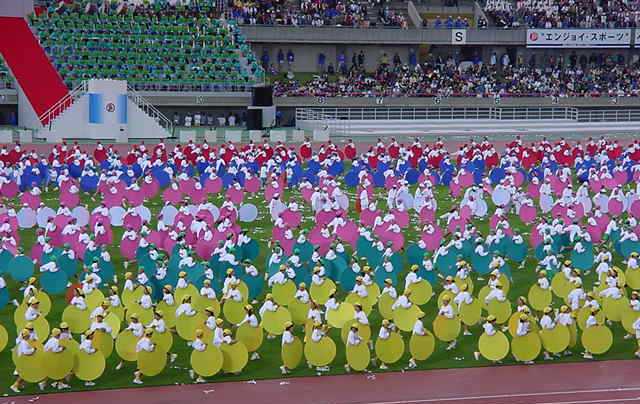 これまでの国体では、ここで天皇皇后が退席して、そのあとで やや閑散としたフィールドで「式典後演技」が行われると いうことでしたが、富山国体では初めて、いったん退席した 天皇皇后が再び席に着いて、そこで「式典後演技」を見る、 という画期的なことになりました。以下はその模様です。