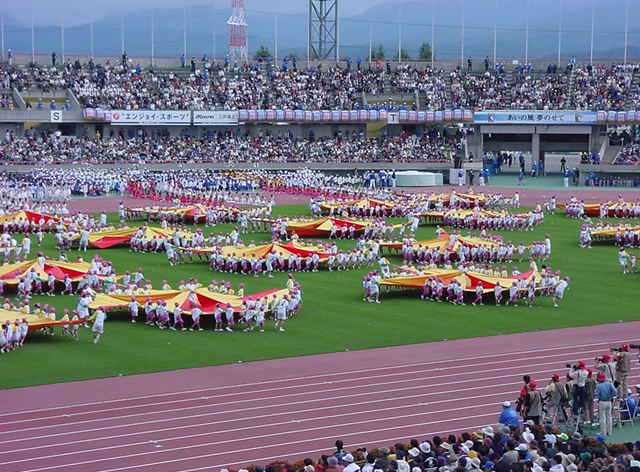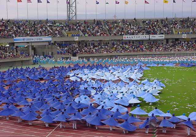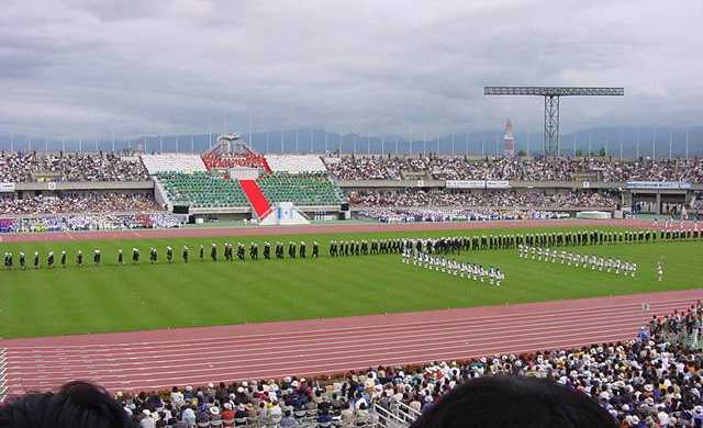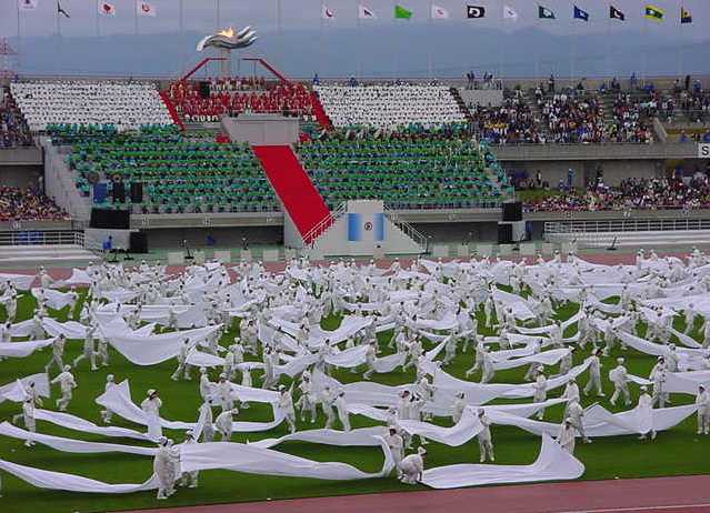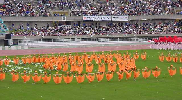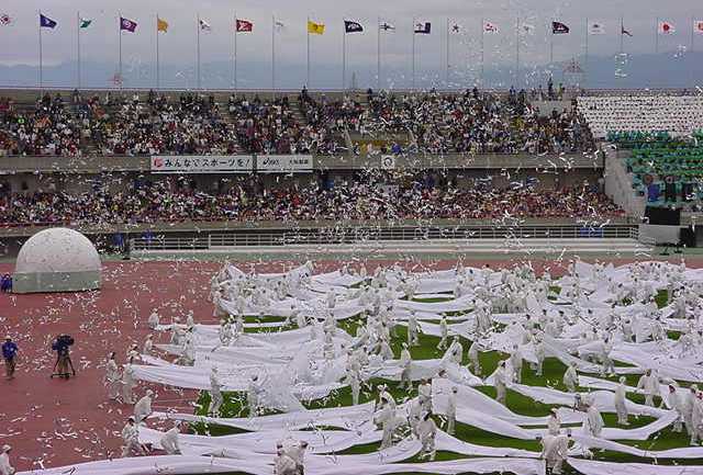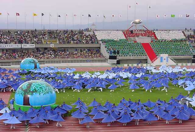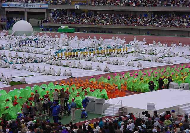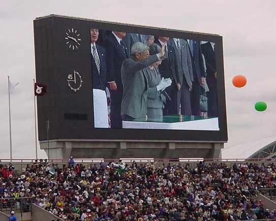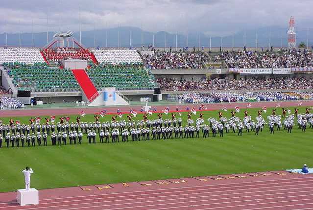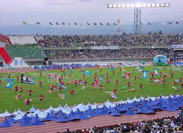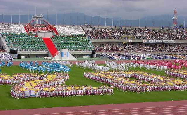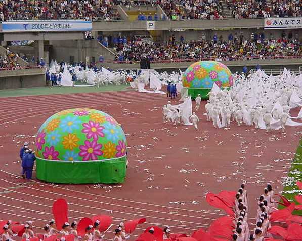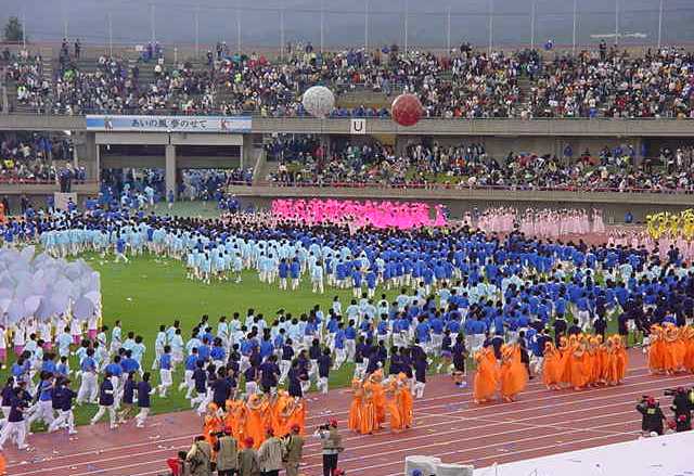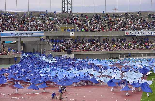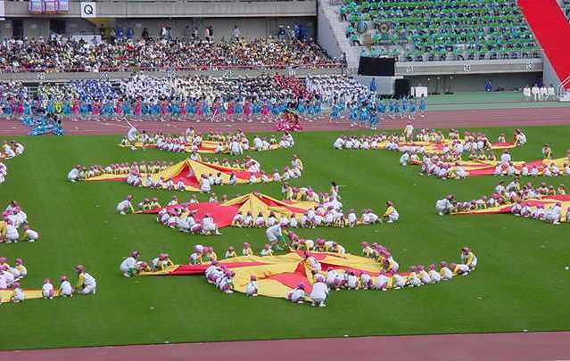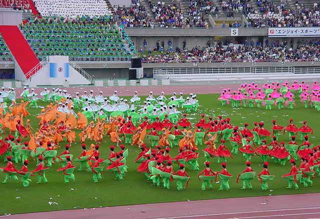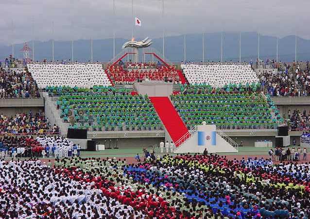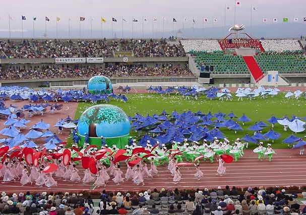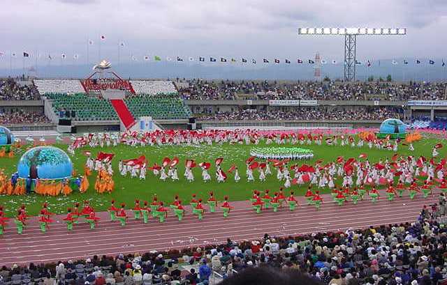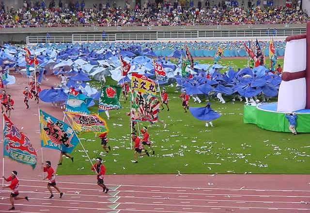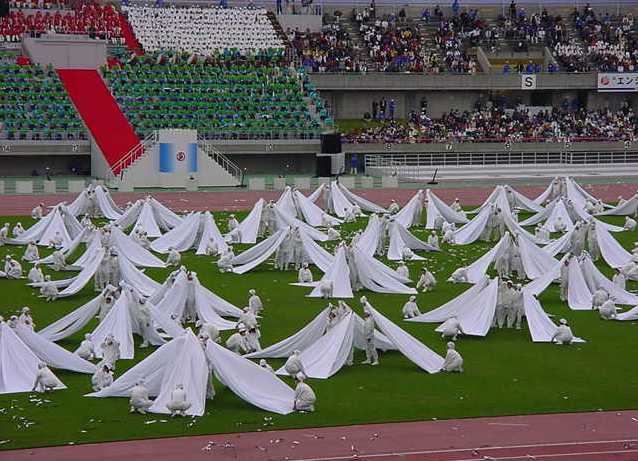 これまでの国体では、ここで天皇皇后が退席して、そのあとで やや閑散としたフィールドで「式典後演技」が行われると いうことでしたが、富山国体では初めて、いったん退席した 天皇皇后が再び席に着いて、そこで「式典後演技」を見る、 という画期的なことになりました。以下はその模様です。