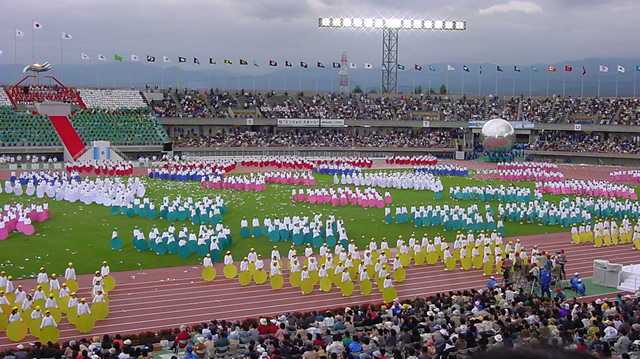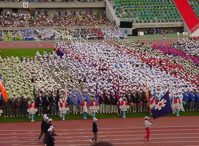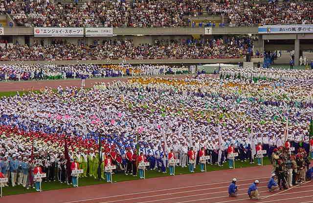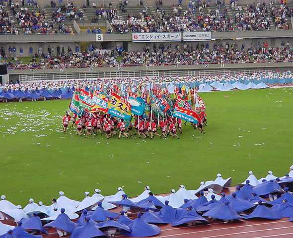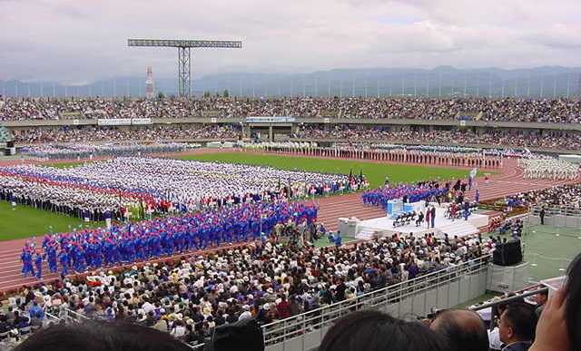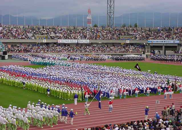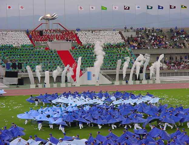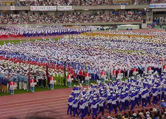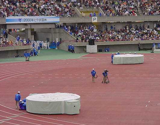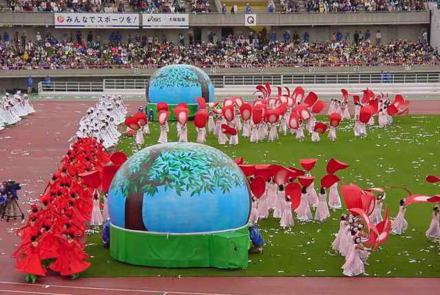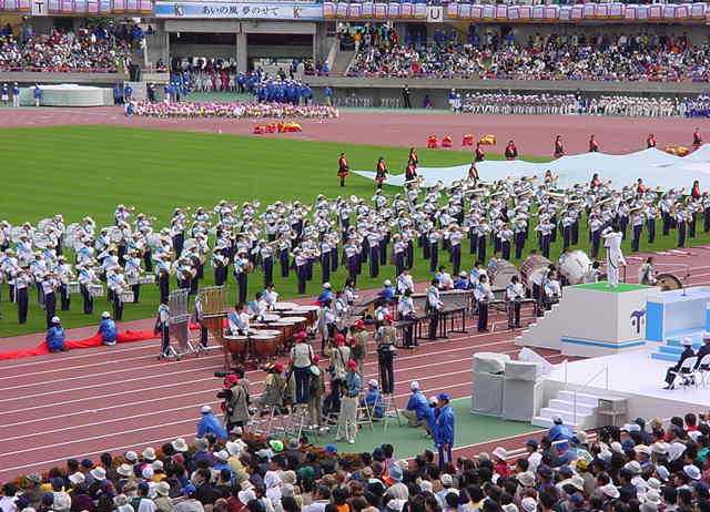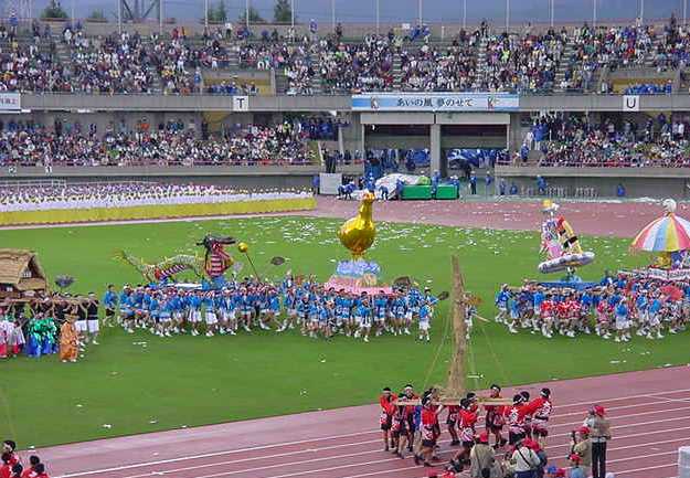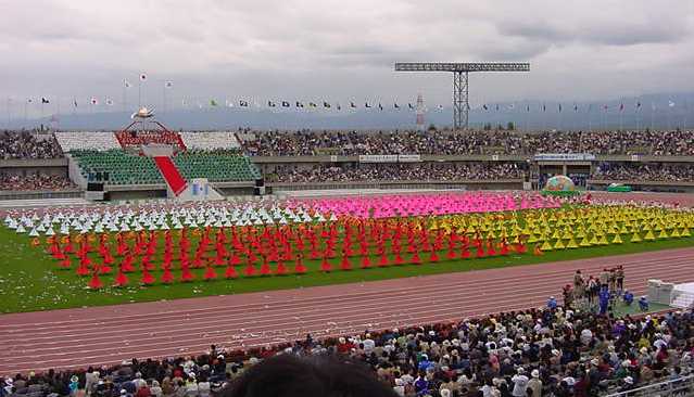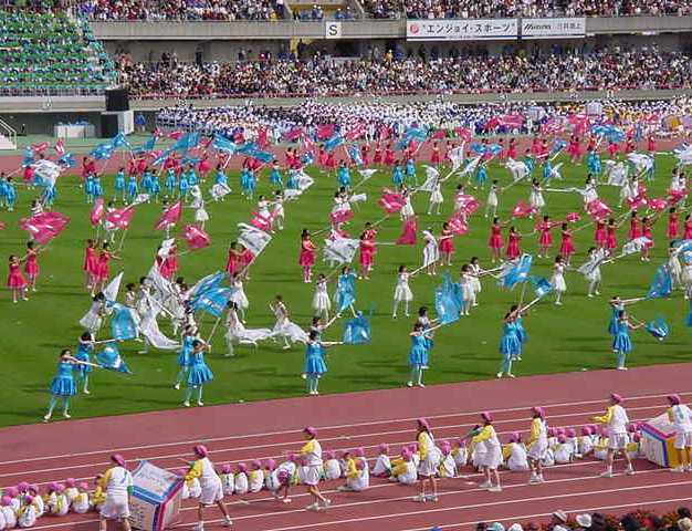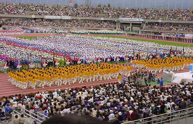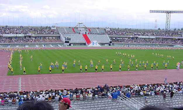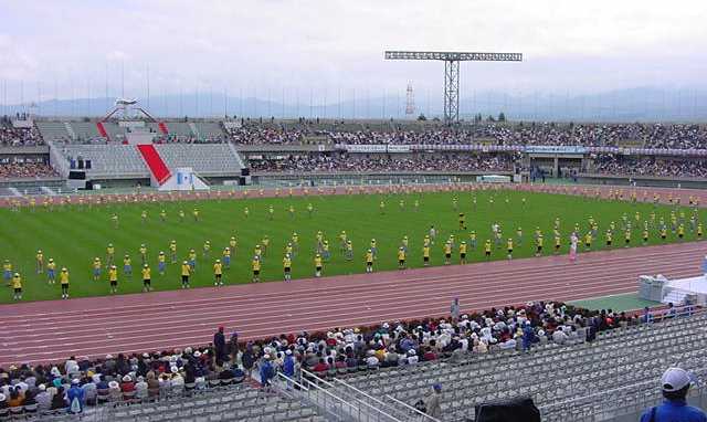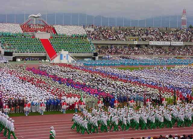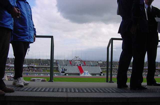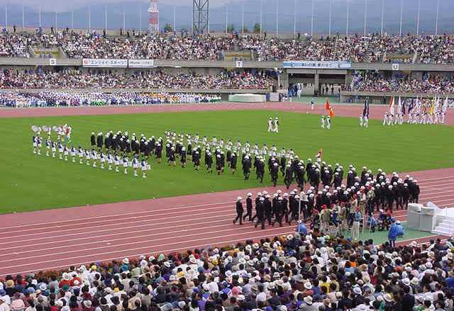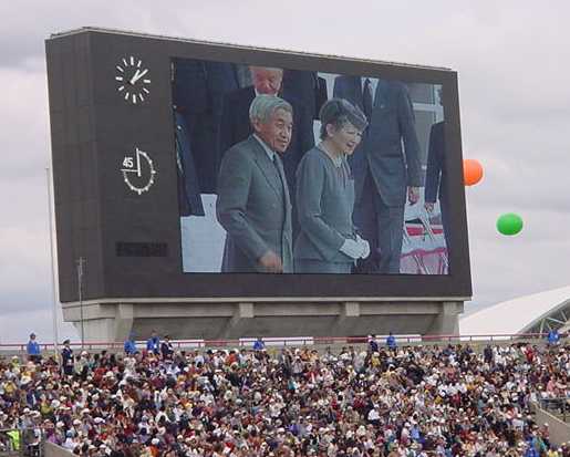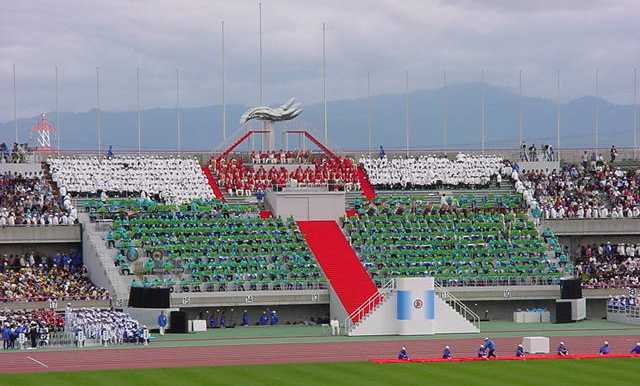 これまでの国体では、ここで天皇皇后が退席して、そのあとで やや閑散としたフィールドで「式典後演技」が行われると いうことでしたが、富山国体では初めて、いったん退席した 天皇皇后が再び席に着いて、そこで「式典後演技」を見る、 という画期的なことになりました。以下はその模様です。