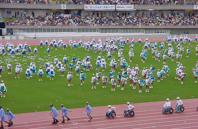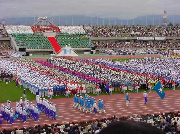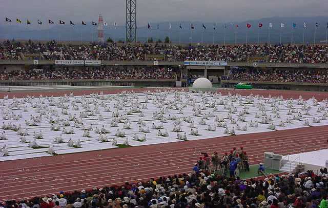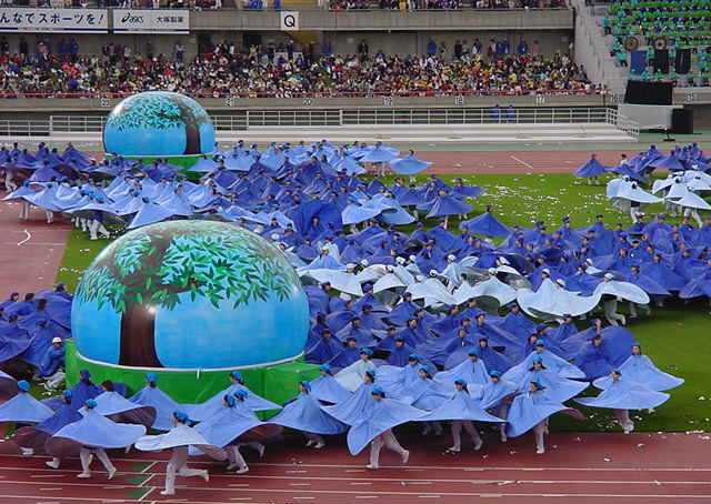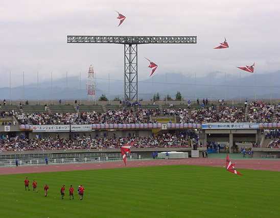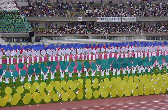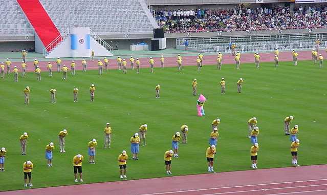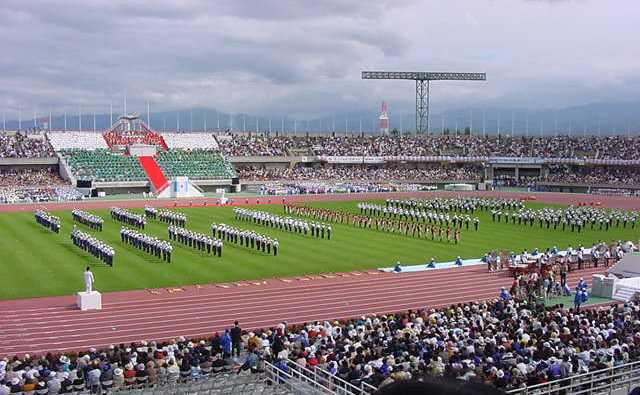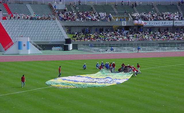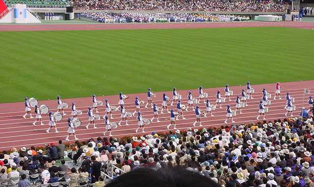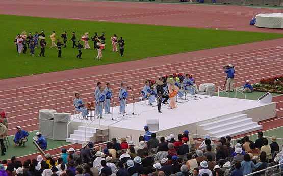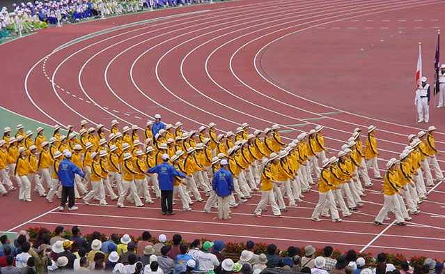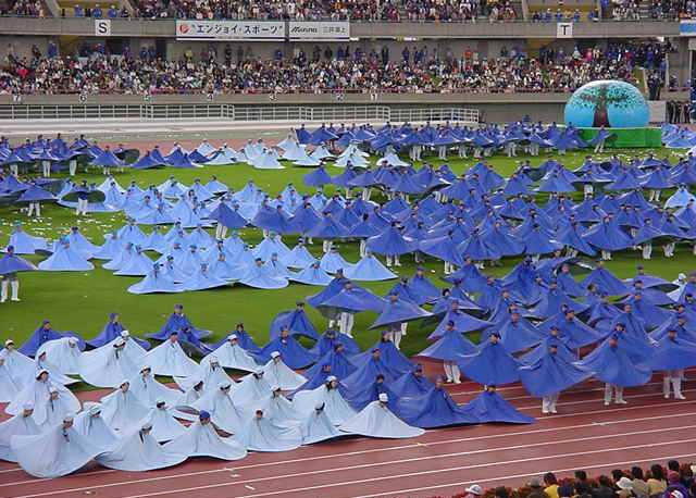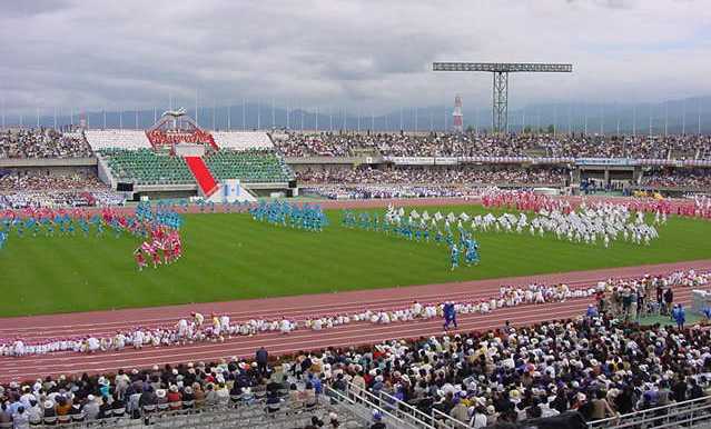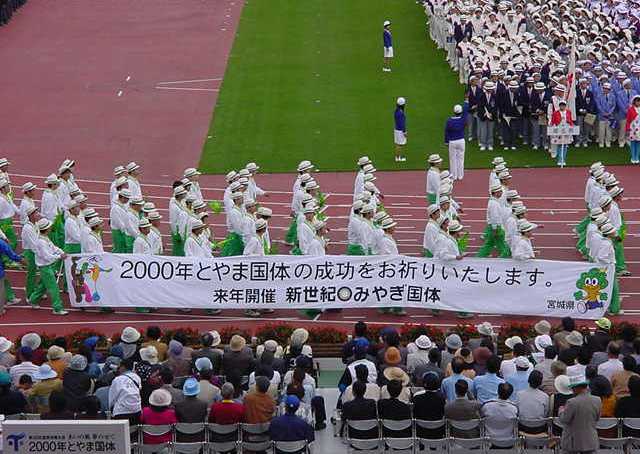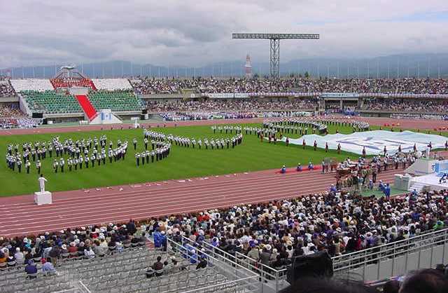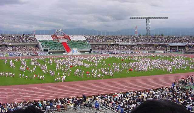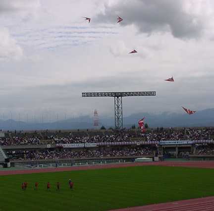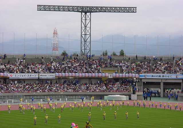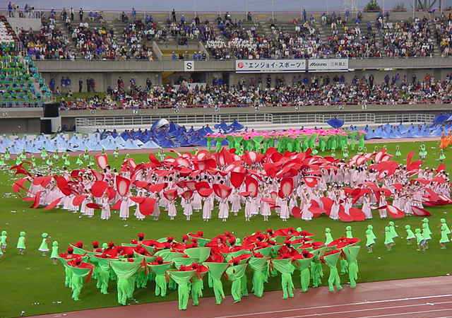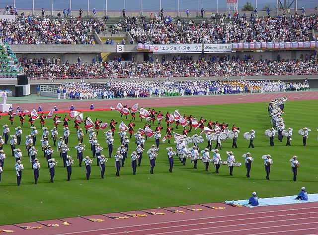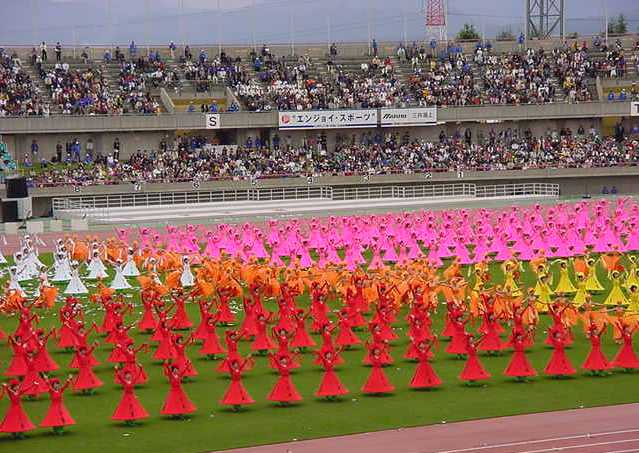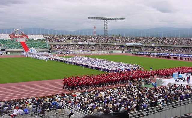 これまでの国体では、ここで天皇皇后が退席して、そのあとで やや閑散としたフィールドで「式典後演技」が行われると いうことでしたが、富山国体では初めて、いったん退席した 天皇皇后が再び席に着いて、そこで「式典後演技」を見る、 という画期的なことになりました。以下はその模様です。