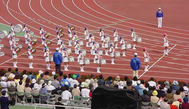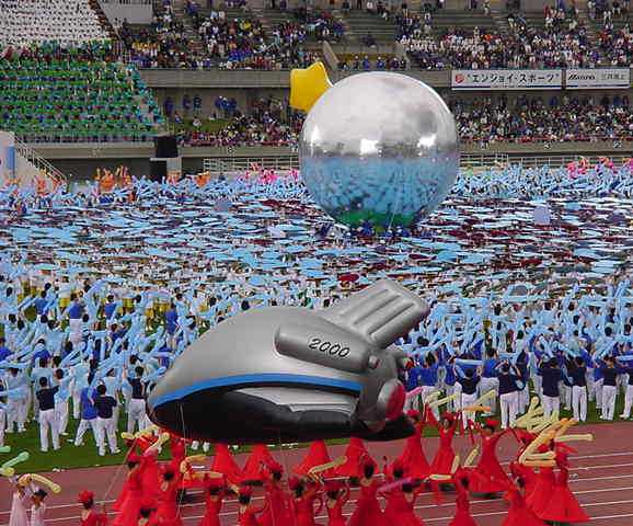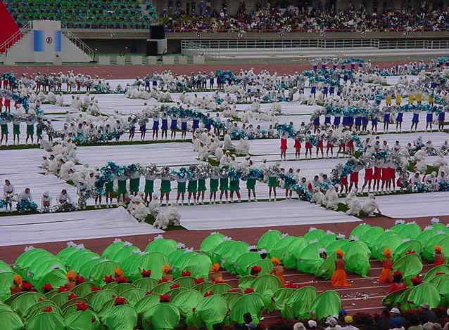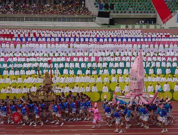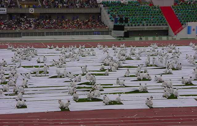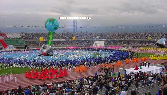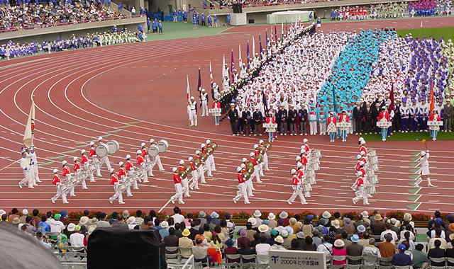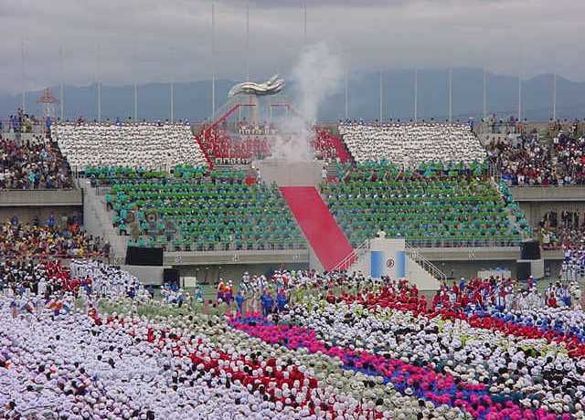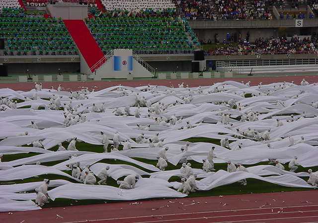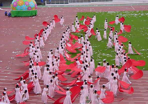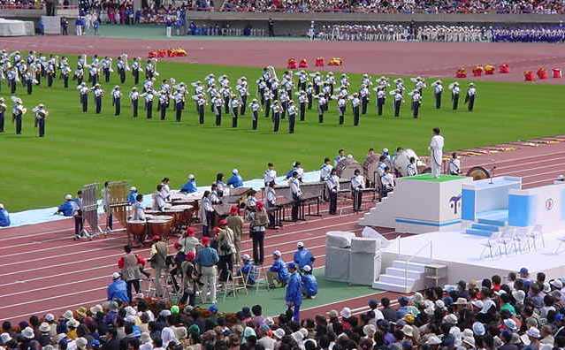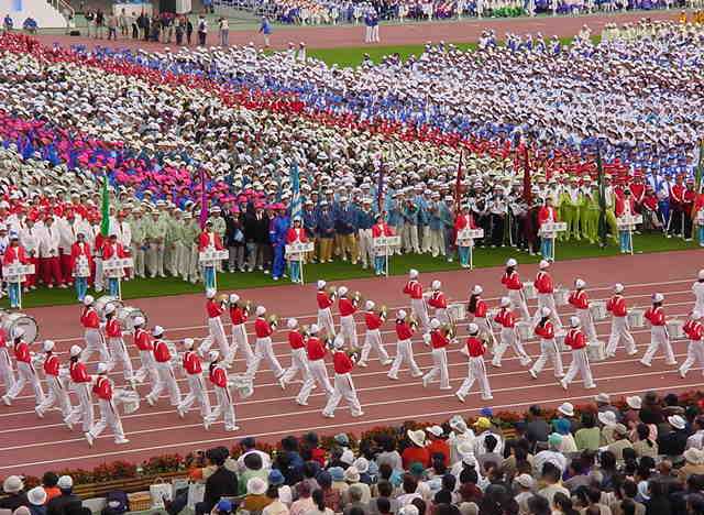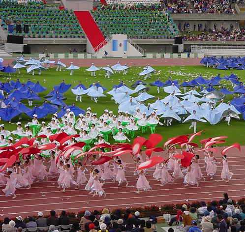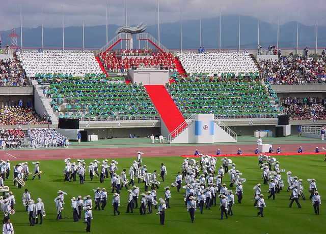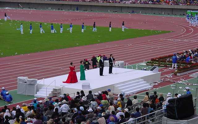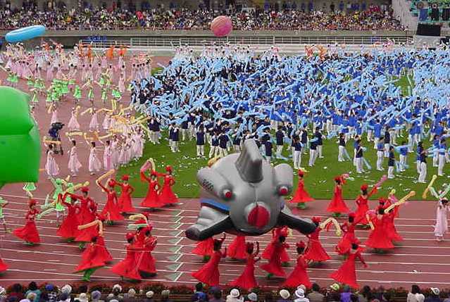 さて、警備上の理由から「入場締め切り」となった12:00、 いよいよ「式典前演技」となりました。ブラスバンドの マーチングなど、アリガチなマスゲームが整然と 繰り広げられました。
