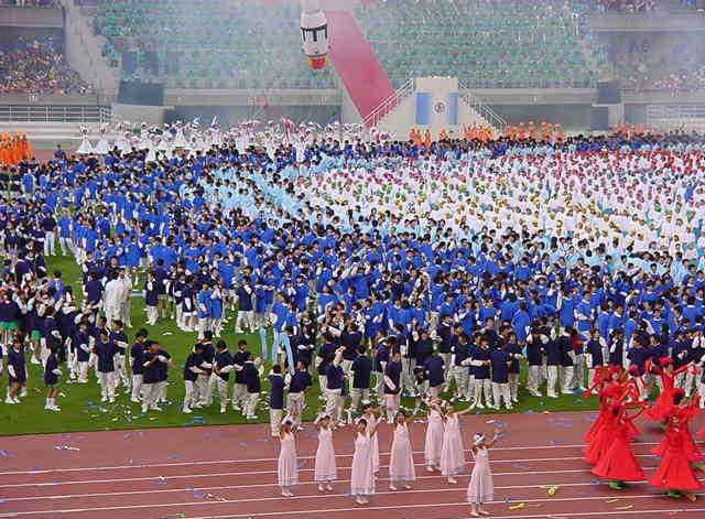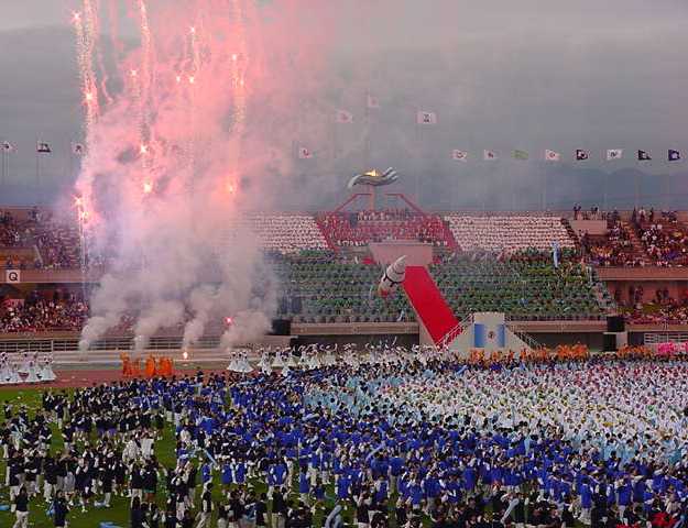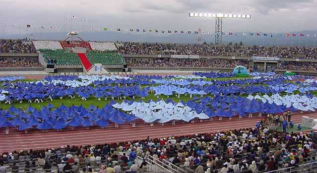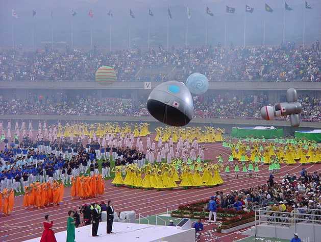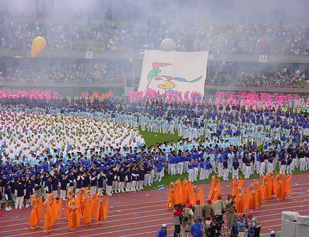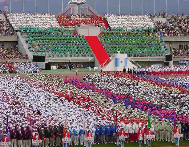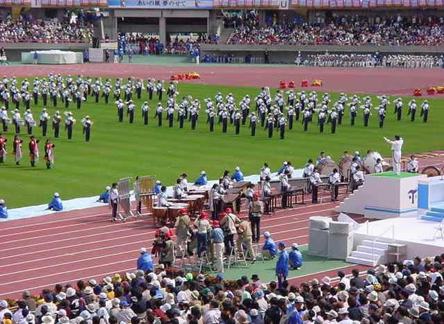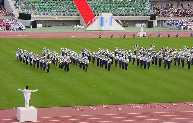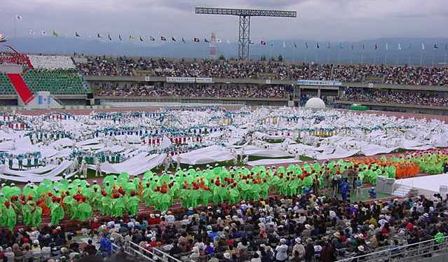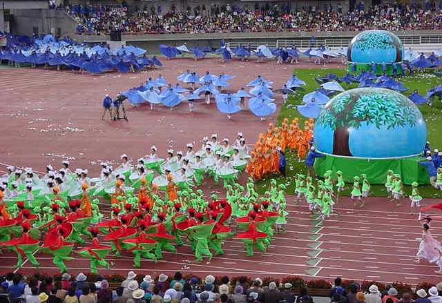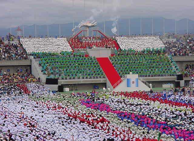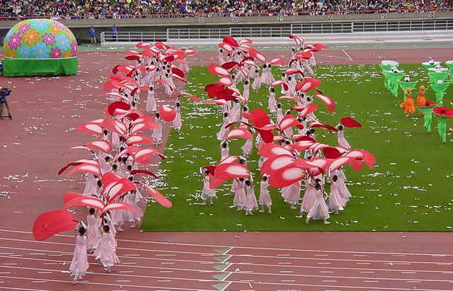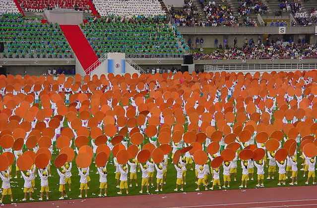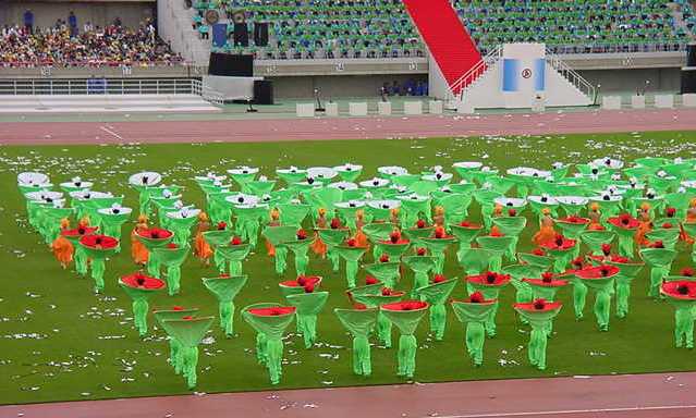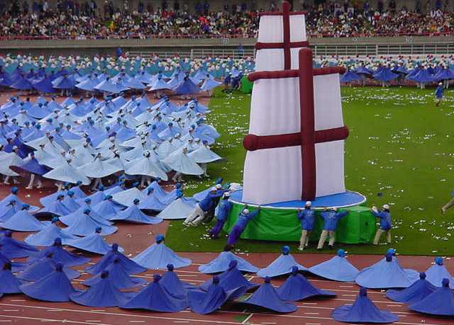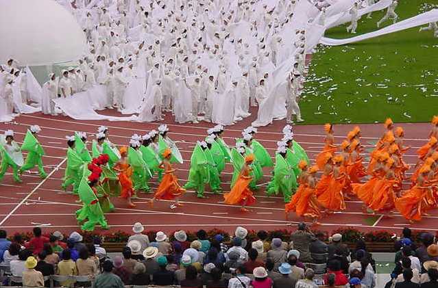 さて、警備上の理由から「入場締め切り」となった12:00、 いよいよ「式典前演技」となりました。ブラスバンドの マーチングなど、アリガチなマスゲームが整然と 繰り広げられました。