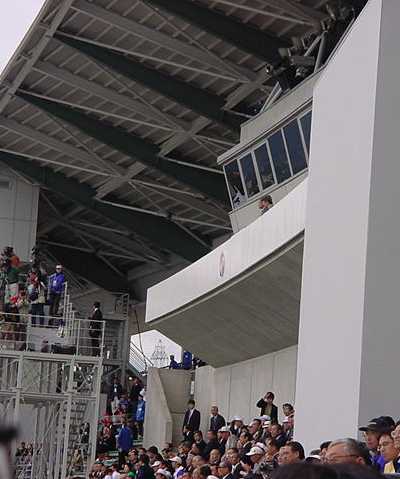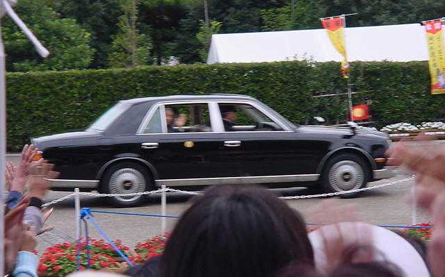 終了後、帰ろうとすると大勢の人垣で前に進めません。 なんと天皇皇后クルマが通るのでした。その頭越しに 撮影に成功しました。(^_^;)