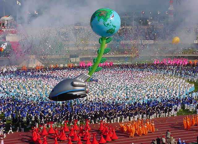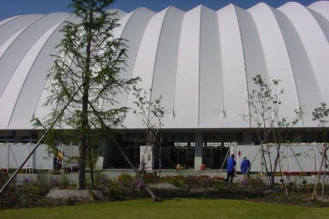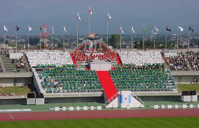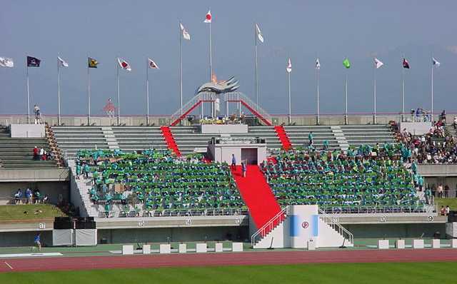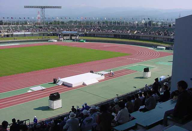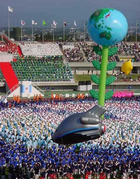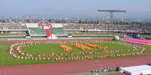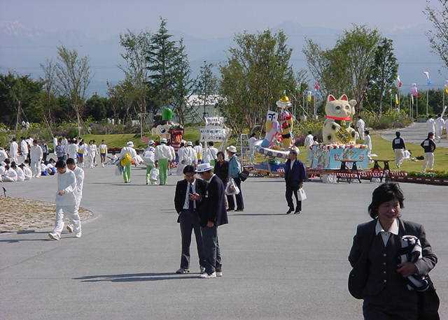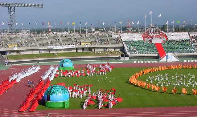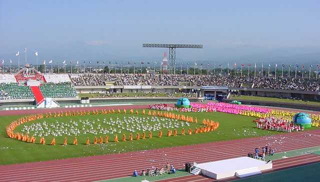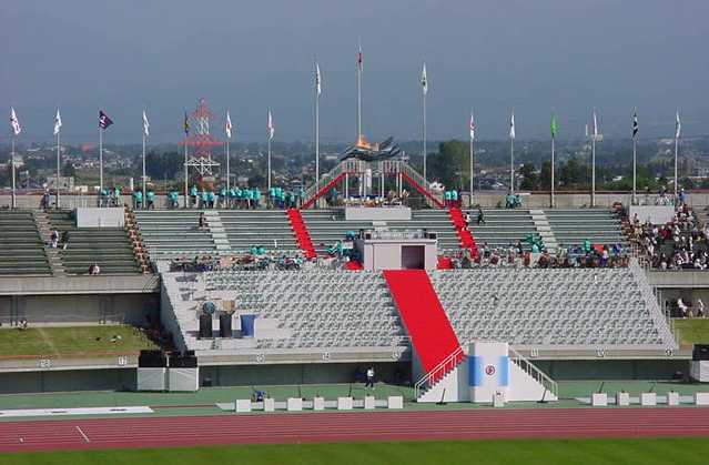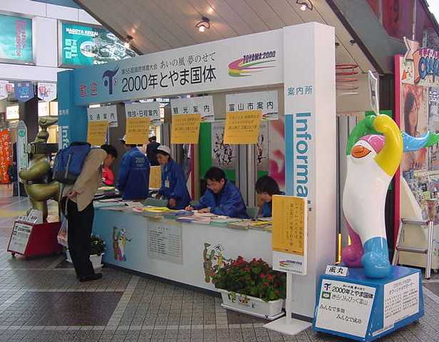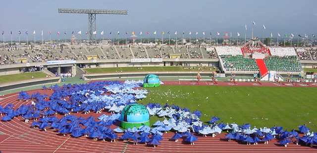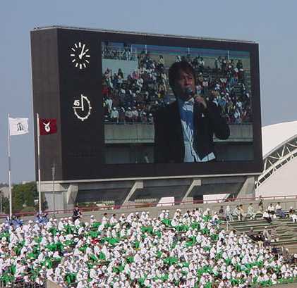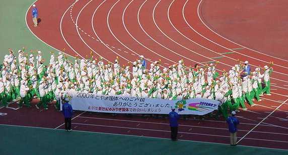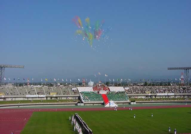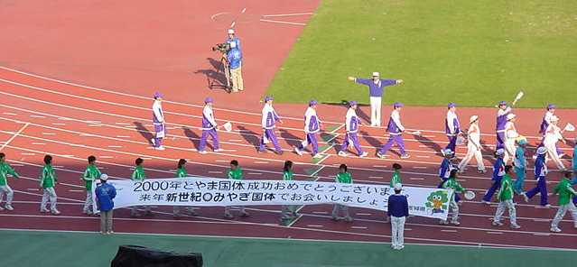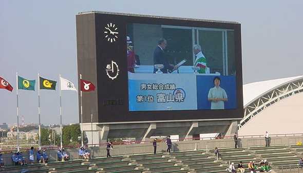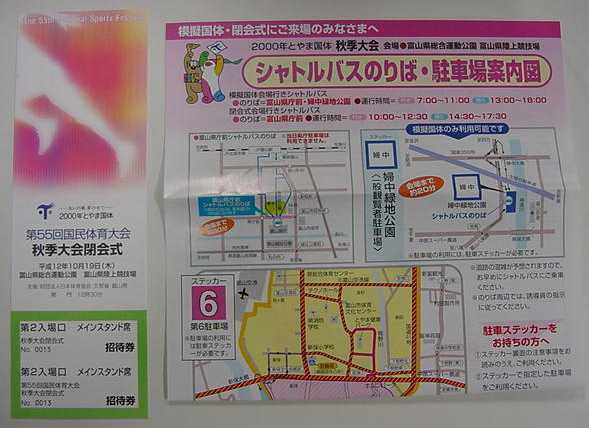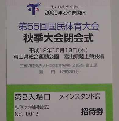 富山国体秋季大会閉会式視察2000年10月 長嶋洋一2003静岡国体式典プロデュースを静岡県から委嘱された静岡文化芸術大学 国体プロジェクトの一員として、2000富山国体秋季大会閉会式(富山市)に 視察に行きました。水曜日の講義(1限、3限)を終えて浜松から前泊の金沢に 行きました。 今回は物々しい警備の開会式と違って招待者も自由席ということで、 けっこう閑散としている(^_^;)、という事前の噂でした。