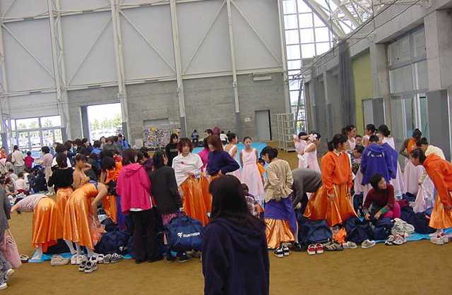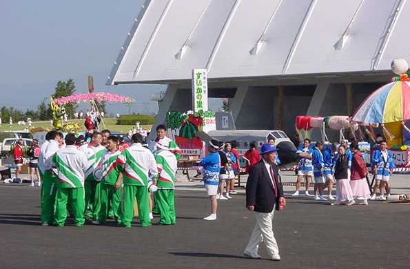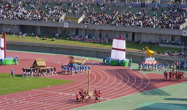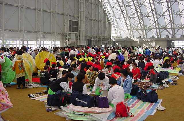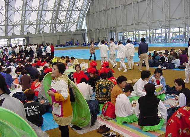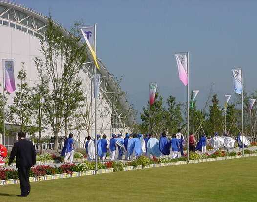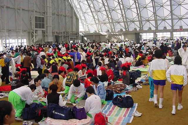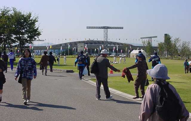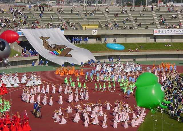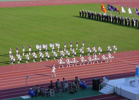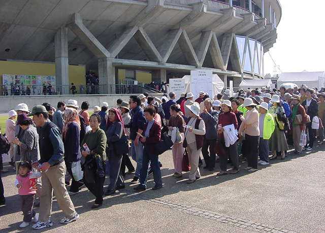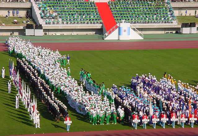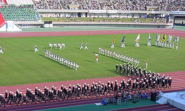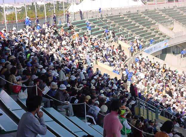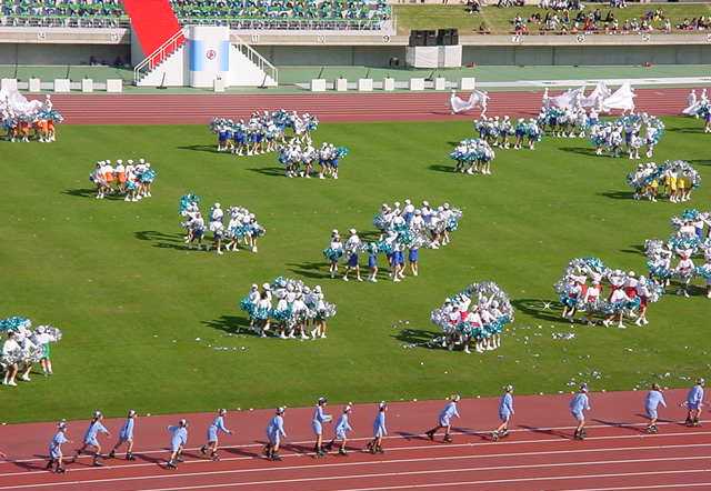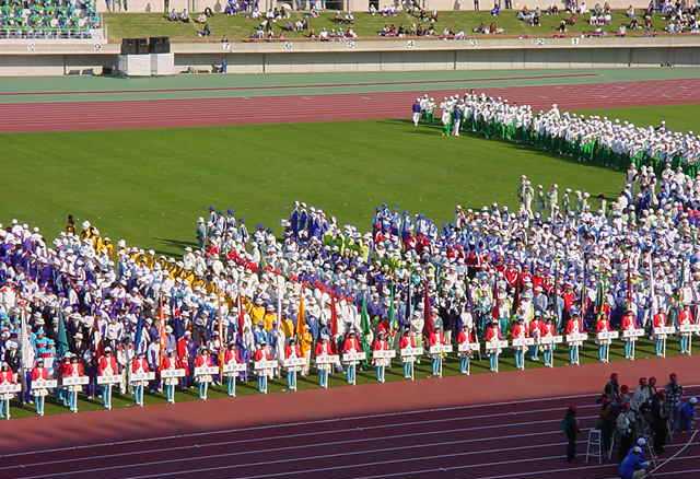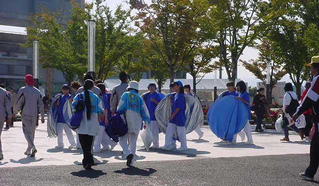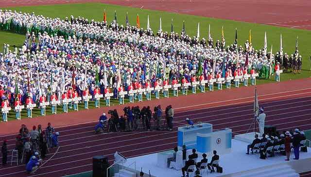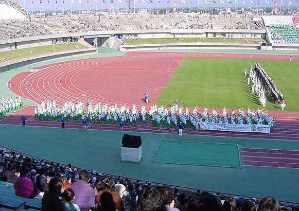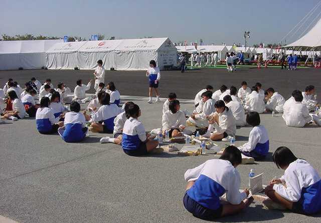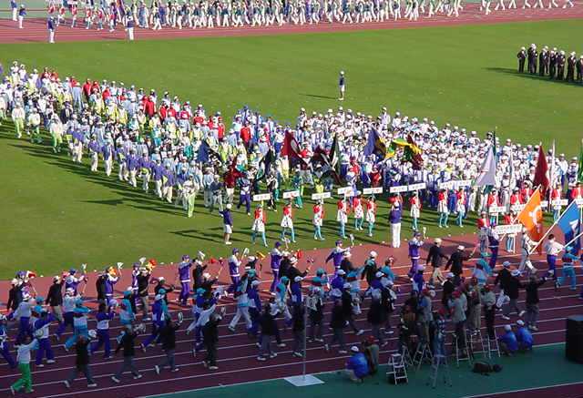ここからは、スタジアムに入るまで、会場でうろうろして撮った ものです。開会式の時にはとても寒く、えらく待たされて、さらに 緊張もあってか、子供たちや学生はあまり楽しそうな顔をしている ように見えなかったのですが、ここで反省しました。 今回は天気もよく、もう国体が成功裏に終わる、という雰囲気も あり、どこもかしこも和気あいあいと楽しげでした。(^_^)