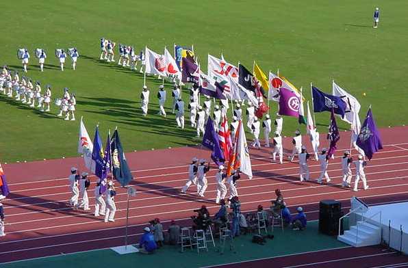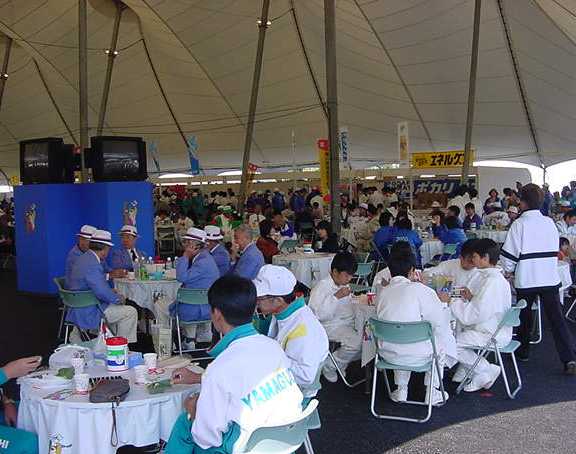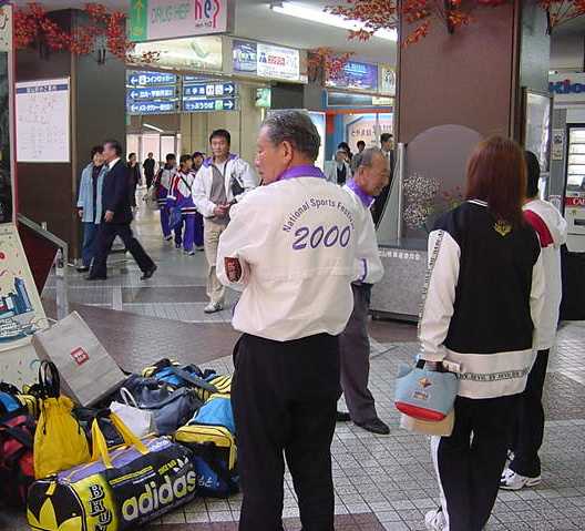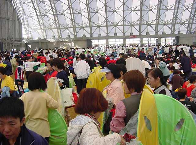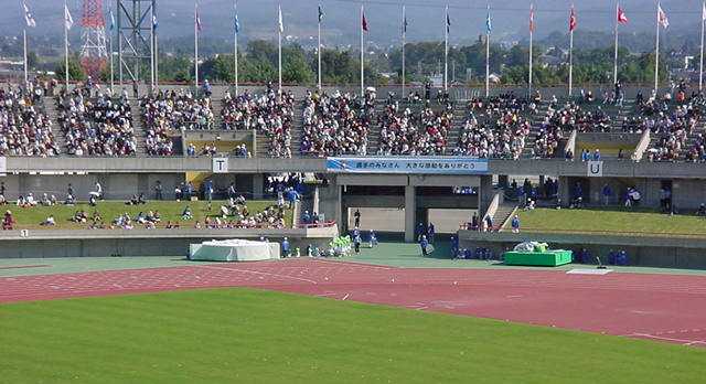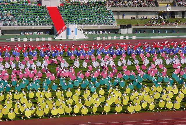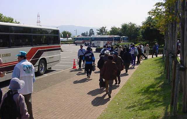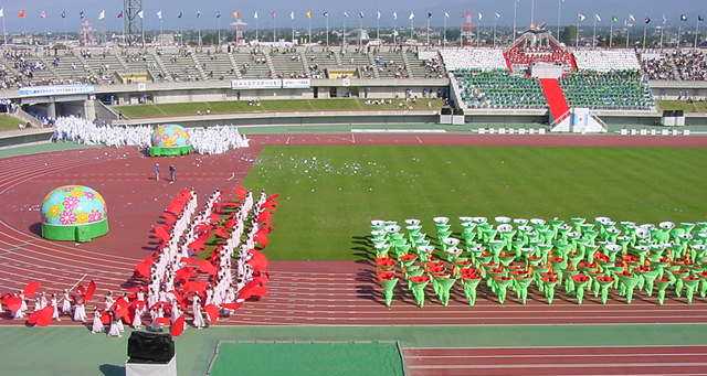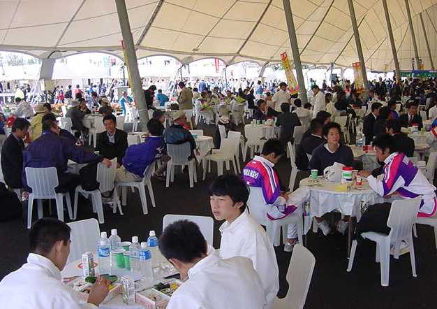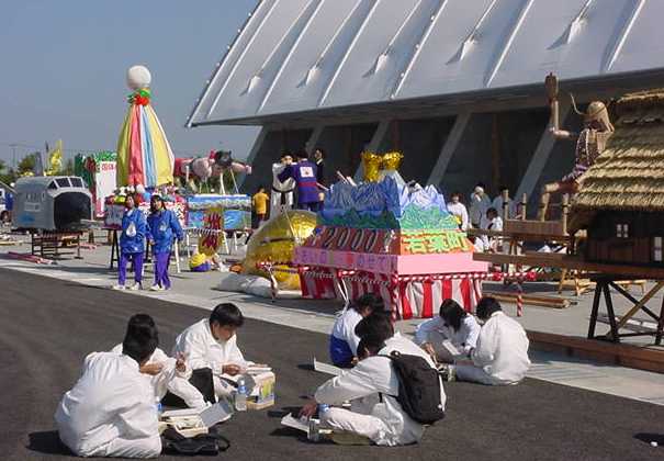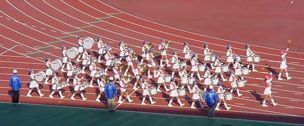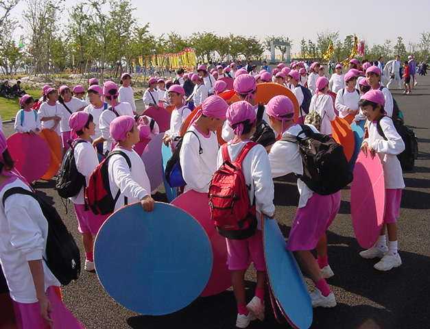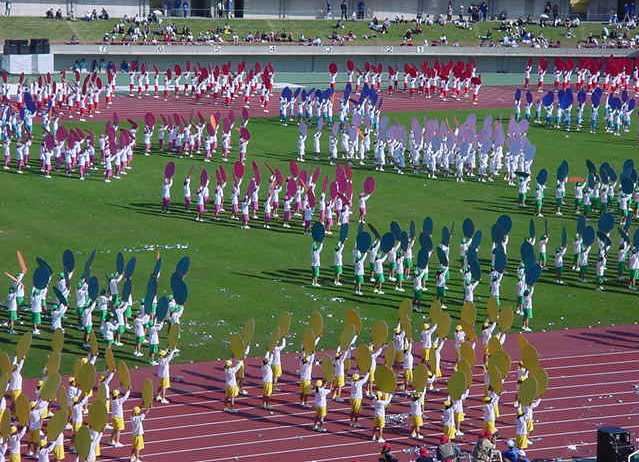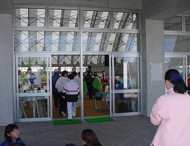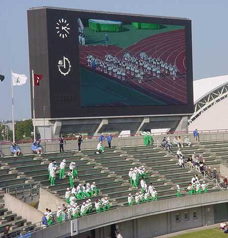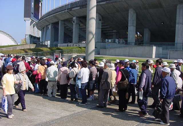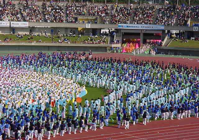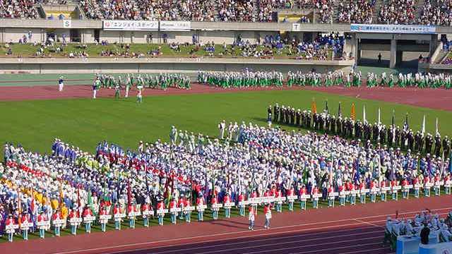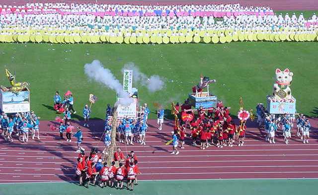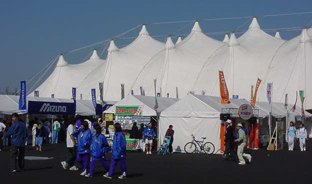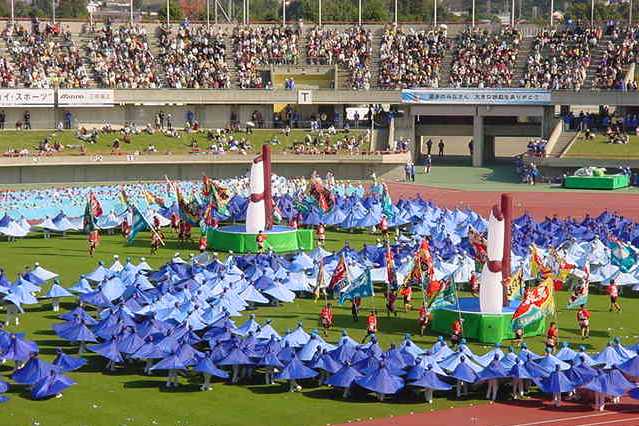 ここからは、スタジアムに入るまで、会場でうろうろして撮った ものです。開会式の時にはとても寒く、えらく待たされて、さらに 緊張もあってか、子供たちや学生はあまり楽しそうな顔をしている ように見えなかったのですが、ここで反省しました。 今回は天気もよく、もう国体が成功裏に終わる、という雰囲気も あり、どこもかしこも和気あいあいと楽しげでした。(^_^)