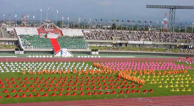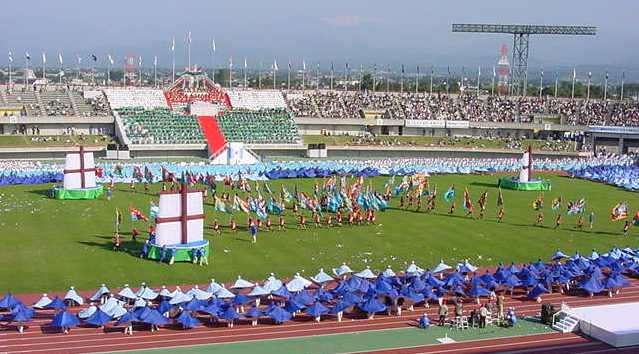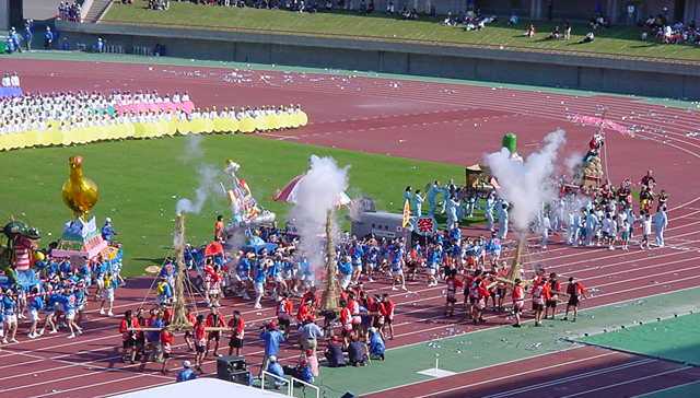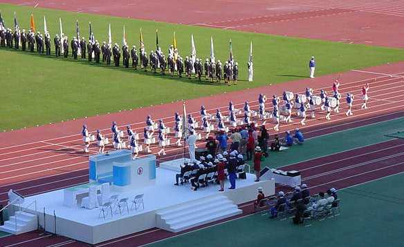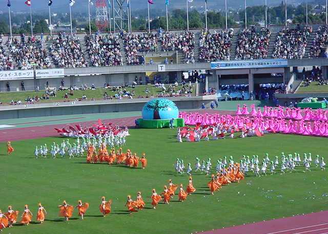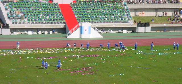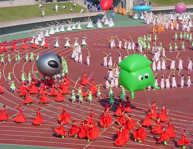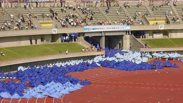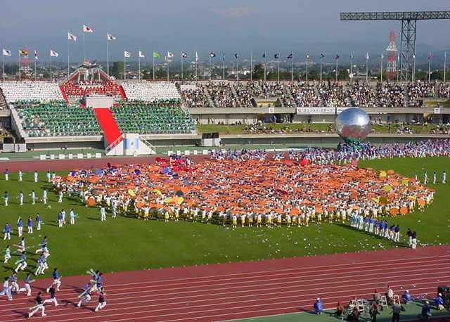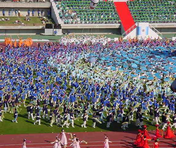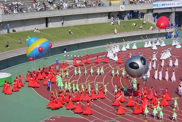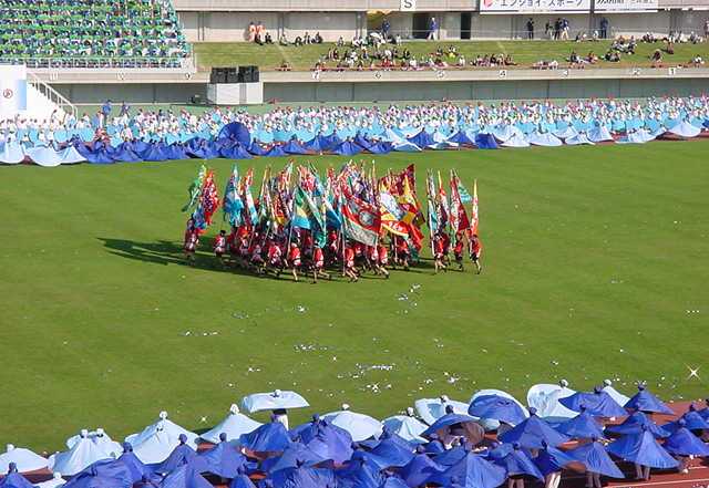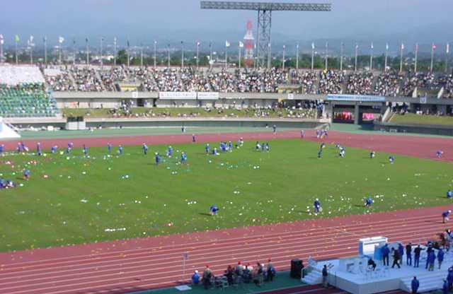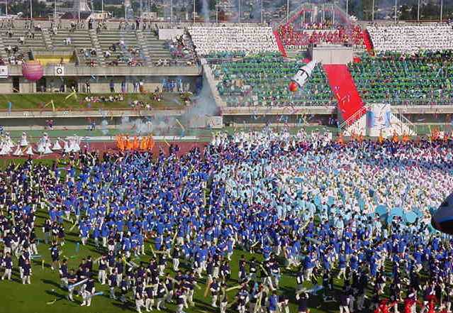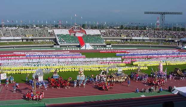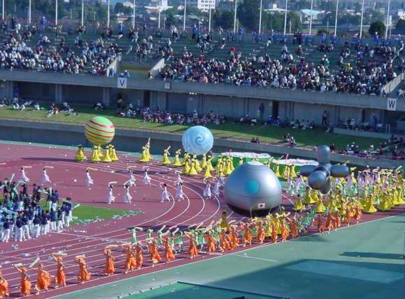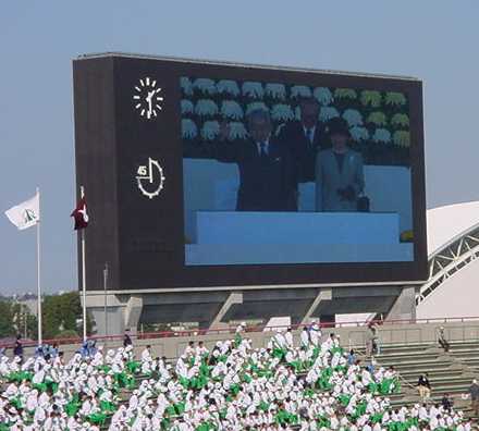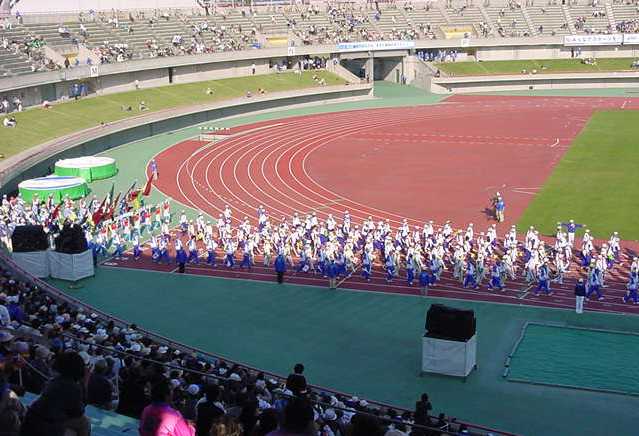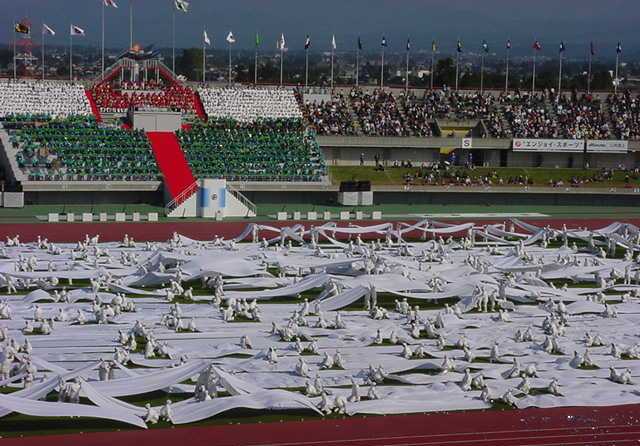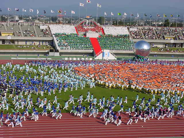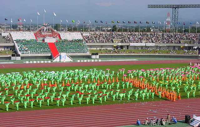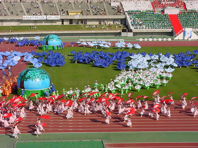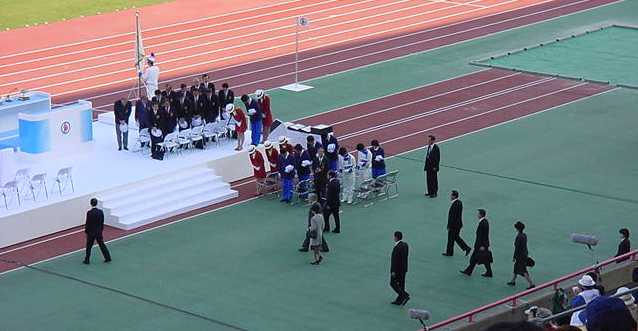 そしていよいよ、閉会式です。今回の皇族は高松宮?夫妻 でした(間違っているかも(^_^;))。 開会式の最後の「式典後演技」をまず最初に式典前演技と して、そのまんま同じにやりましたが、今回はよりイキイキと 感動的でした。そして式典。駅に預けた荷物にスペアバッテリ を忘れたので、300枚あたりでうち止めとなりましたが、 まぁだいたいこんなもんです。(^_^;)