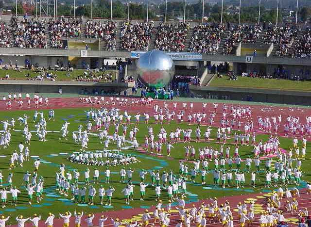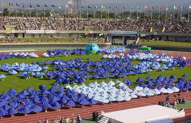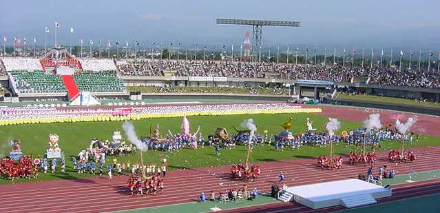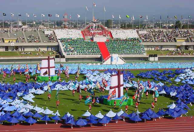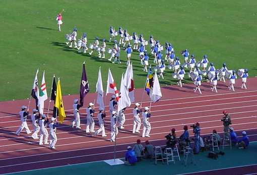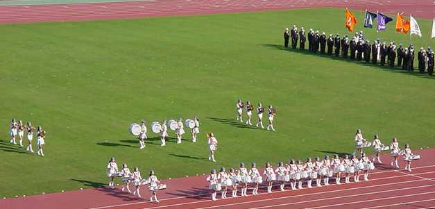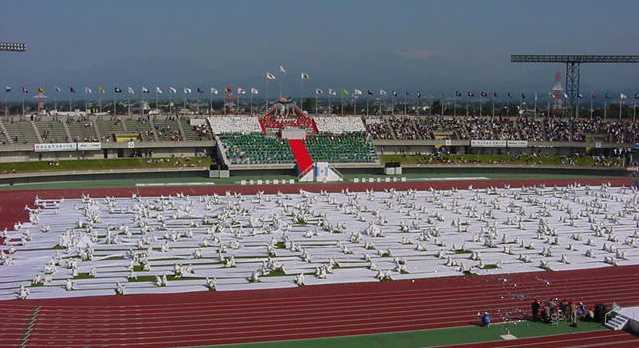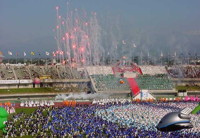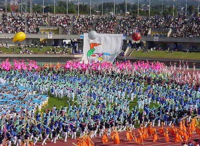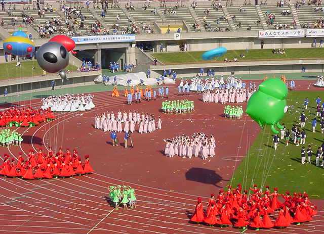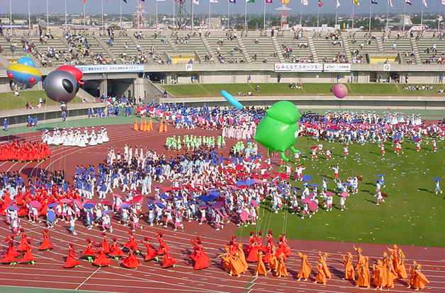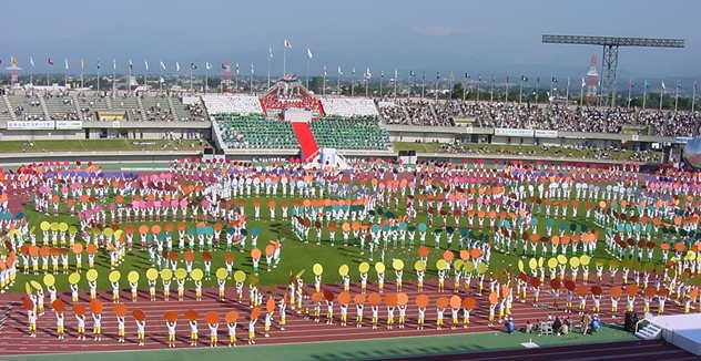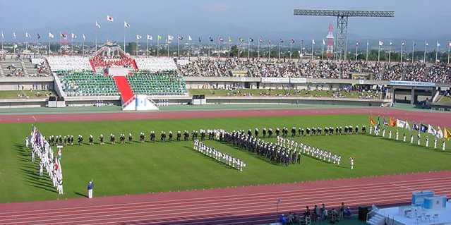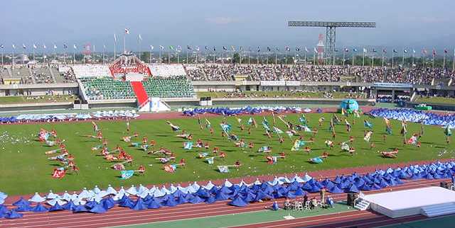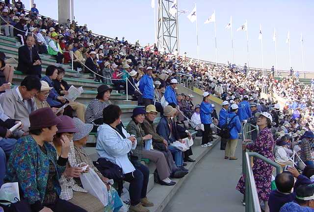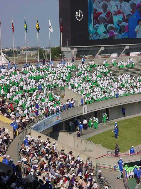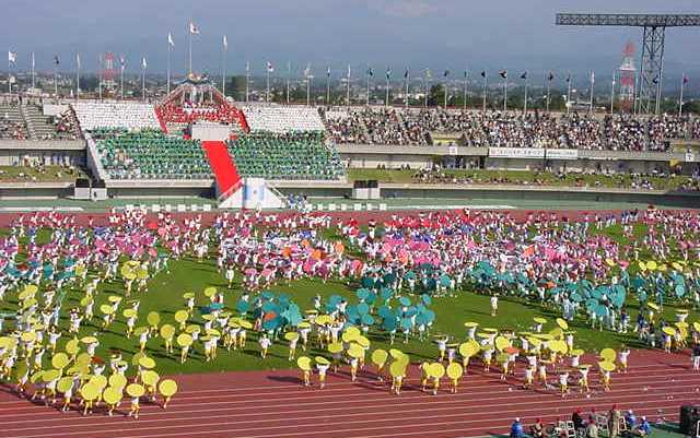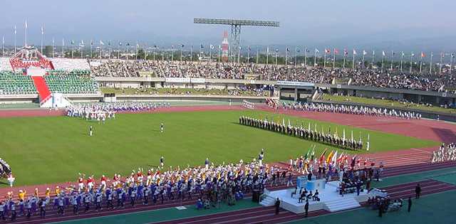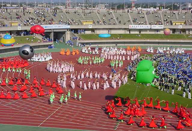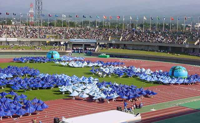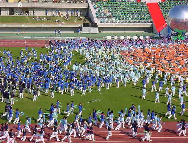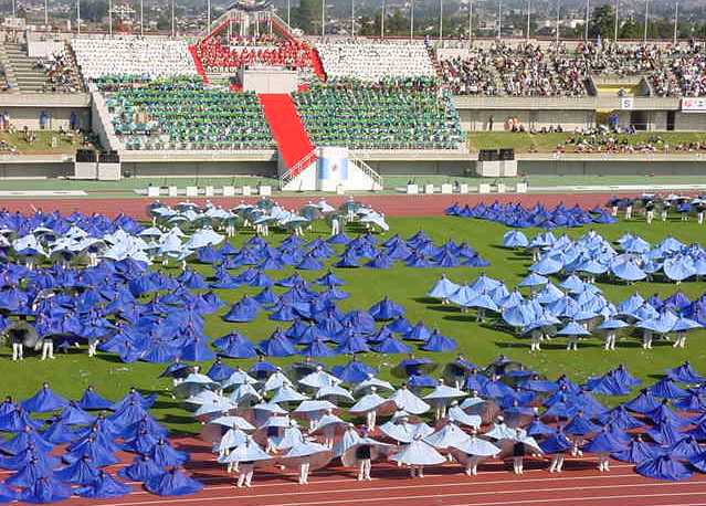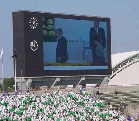 そしていよいよ、閉会式です。今回の皇族は高松宮?夫妻 でした(間違っているかも(^_^;))。 開会式の最後の「式典後演技」をまず最初に式典前演技と して、そのまんま同じにやりましたが、今回はよりイキイキと 感動的でした。そして式典。駅に預けた荷物にスペアバッテリ を忘れたので、300枚あたりでうち止めとなりましたが、 まぁだいたいこんなもんです。(^_^;)