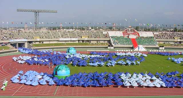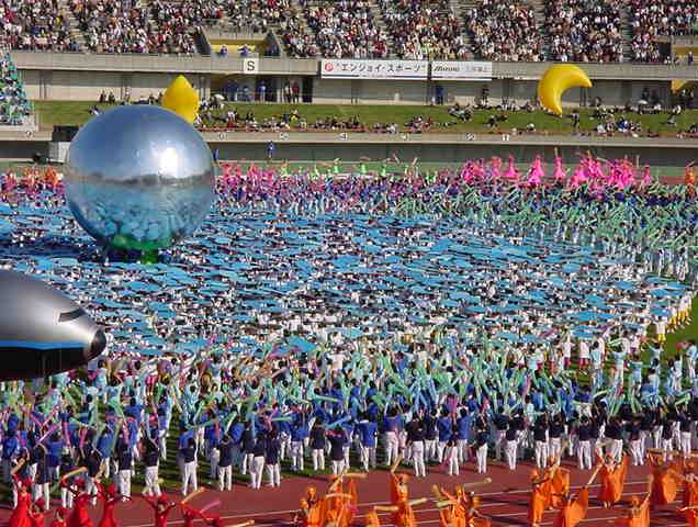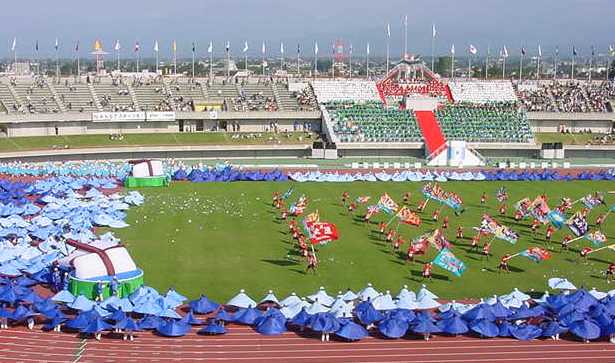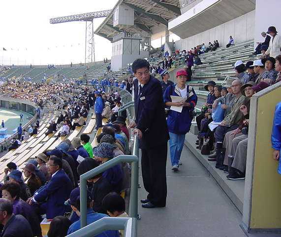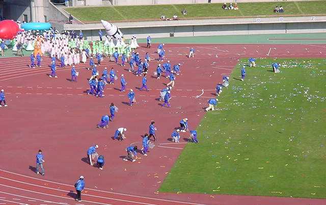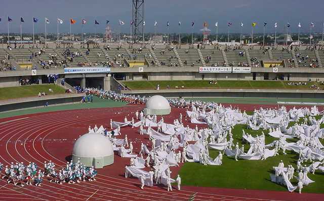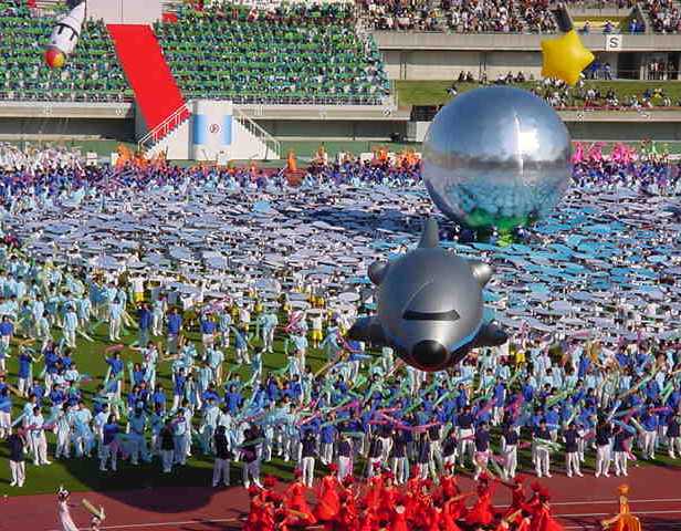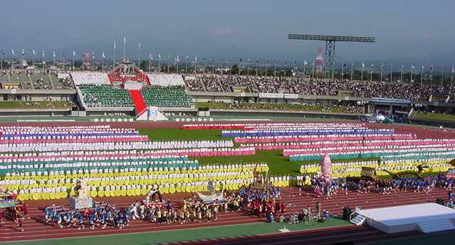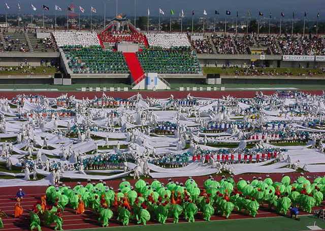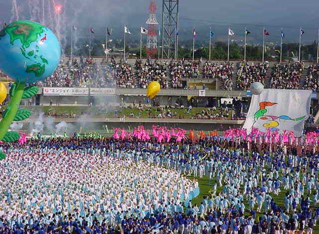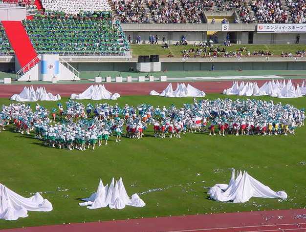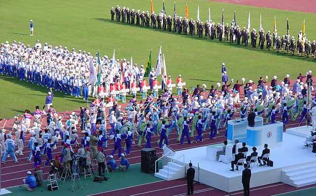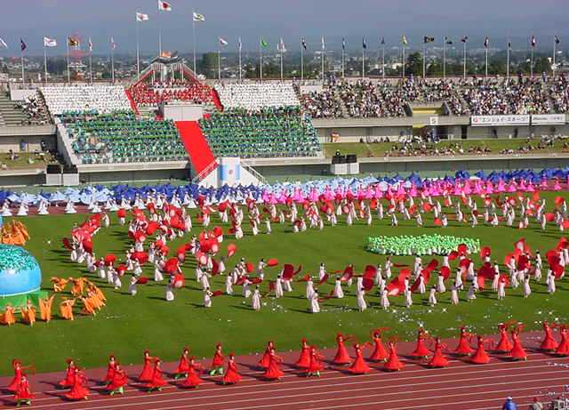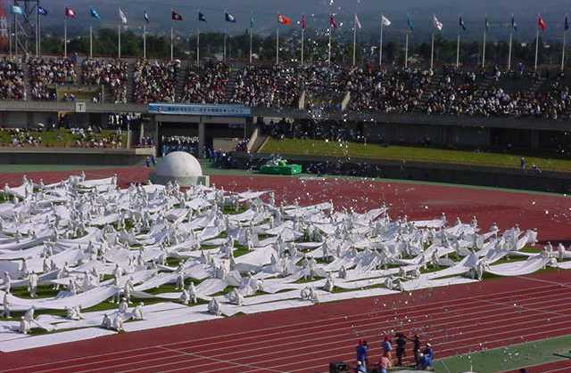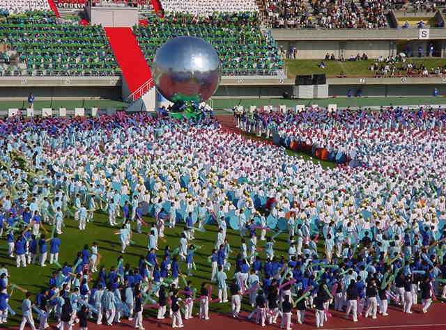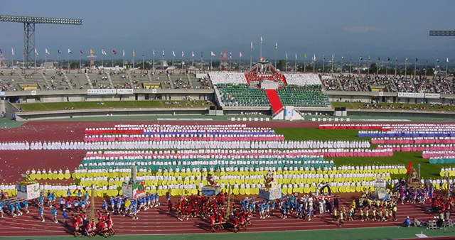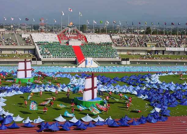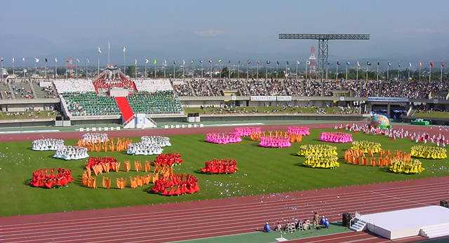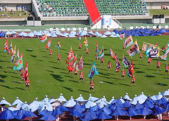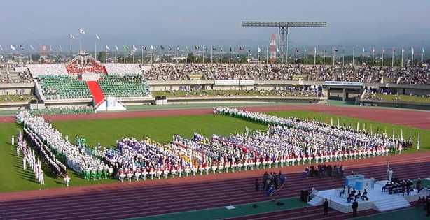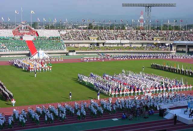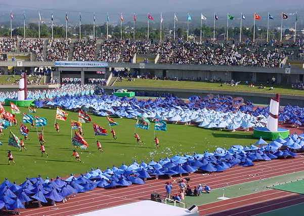 そしていよいよ、閉会式です。今回の皇族は高松宮?夫妻 でした(間違っているかも(^_^;))。 開会式の最後の「式典後演技」をまず最初に式典前演技と して、そのまんま同じにやりましたが、今回はよりイキイキと 感動的でした。そして式典。駅に預けた荷物にスペアバッテリ を忘れたので、300枚あたりでうち止めとなりましたが、 まぁだいたいこんなもんです。(^_^;)