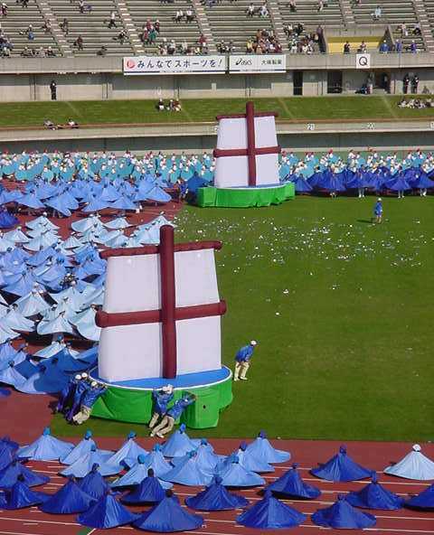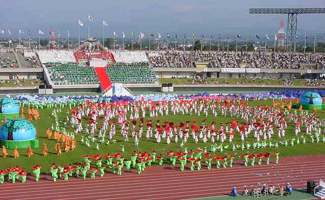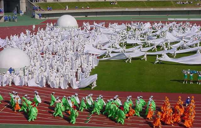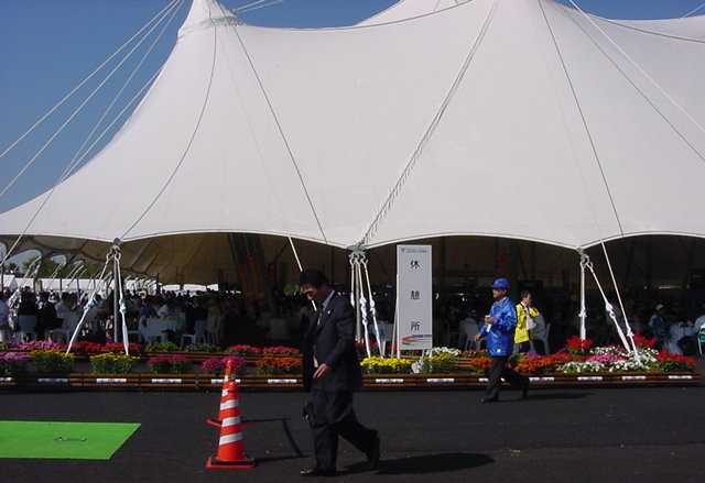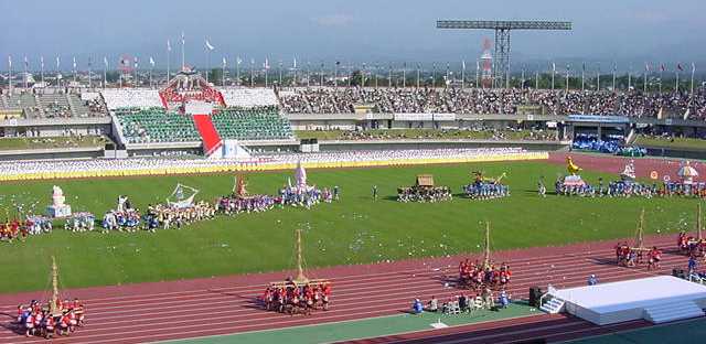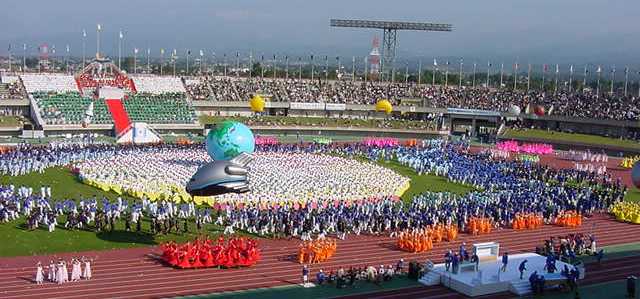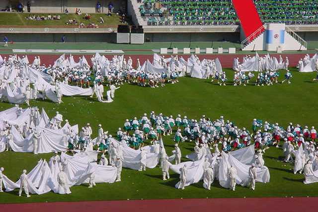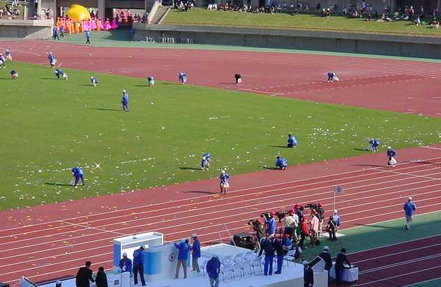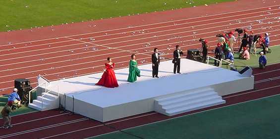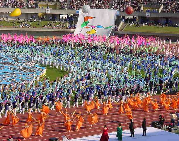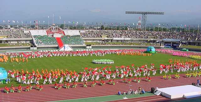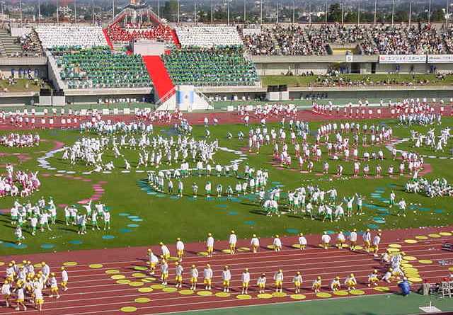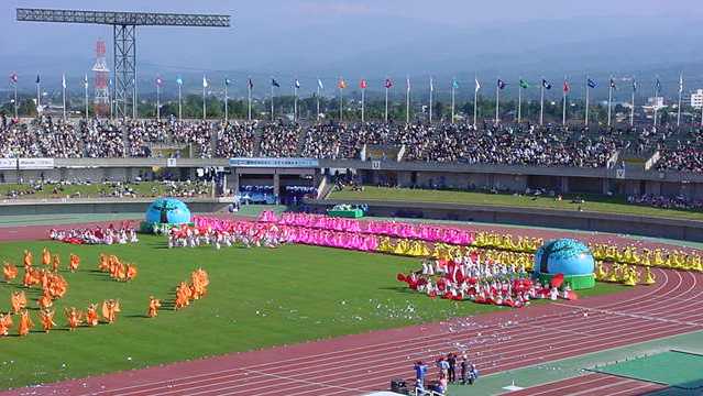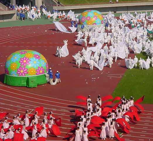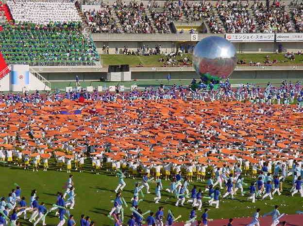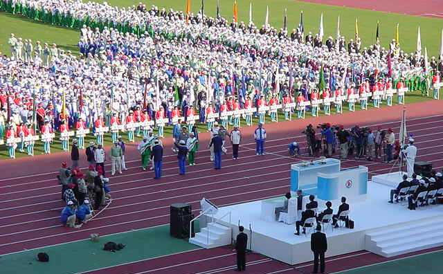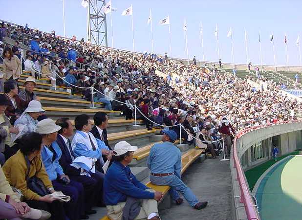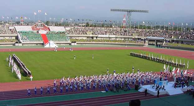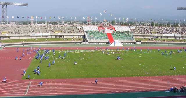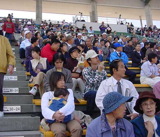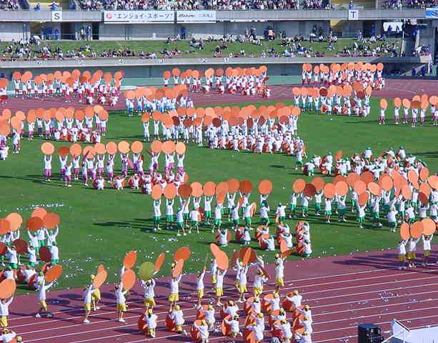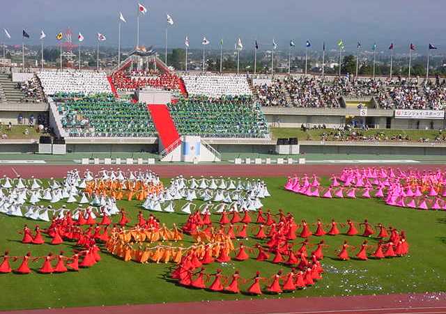 そしていよいよ、閉会式です。今回の皇族は高松宮?夫妻 でした(間違っているかも(^_^;))。 開会式の最後の「式典後演技」をまず最初に式典前演技と して、そのまんま同じにやりましたが、今回はよりイキイキと 感動的でした。そして式典。駅に預けた荷物にスペアバッテリ を忘れたので、300枚あたりでうち止めとなりましたが、 まぁだいたいこんなもんです。(^_^;)