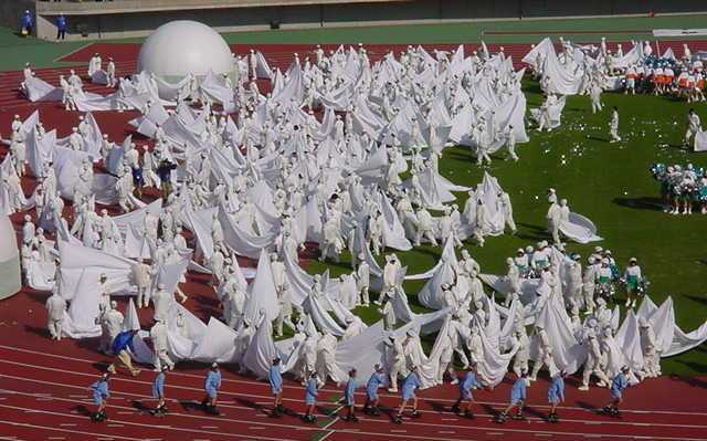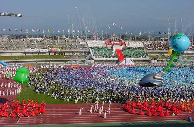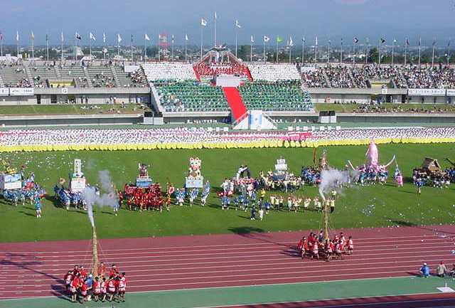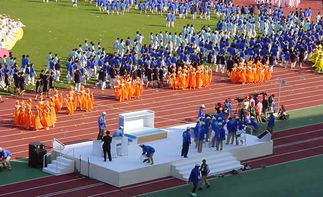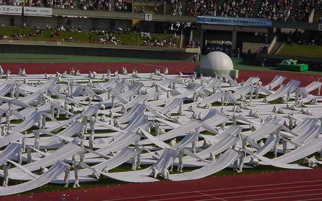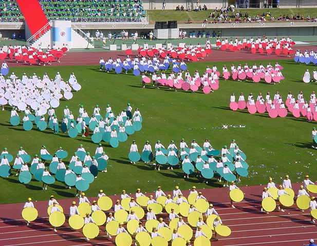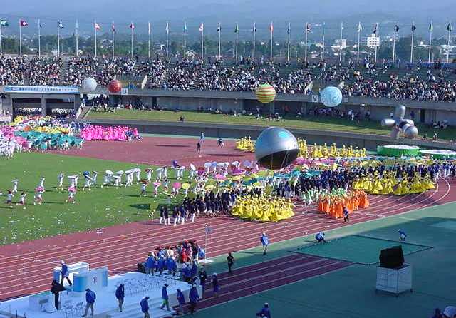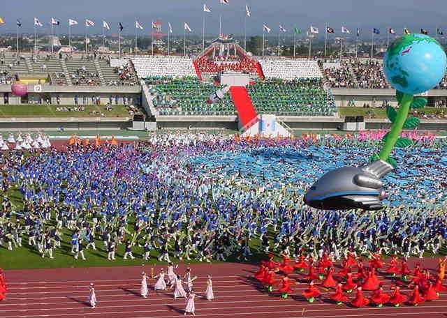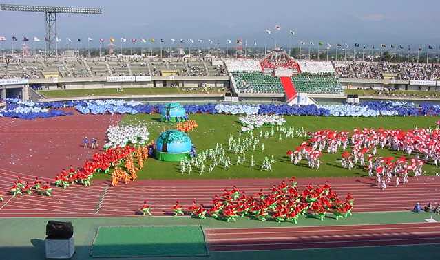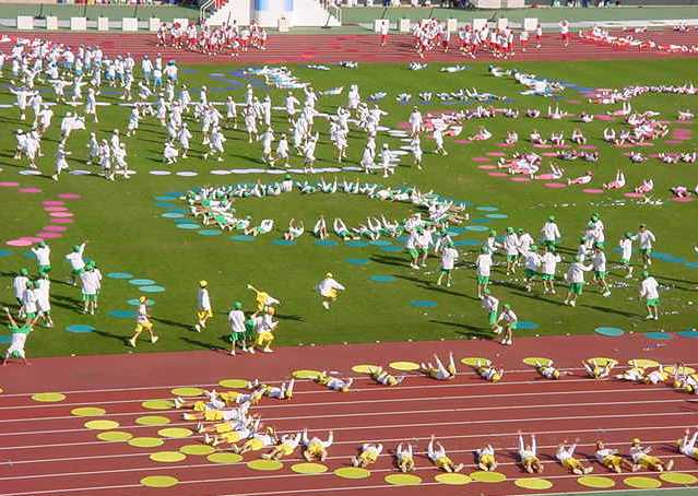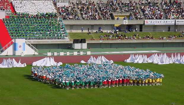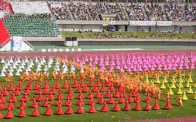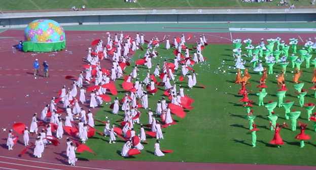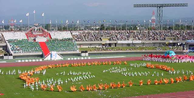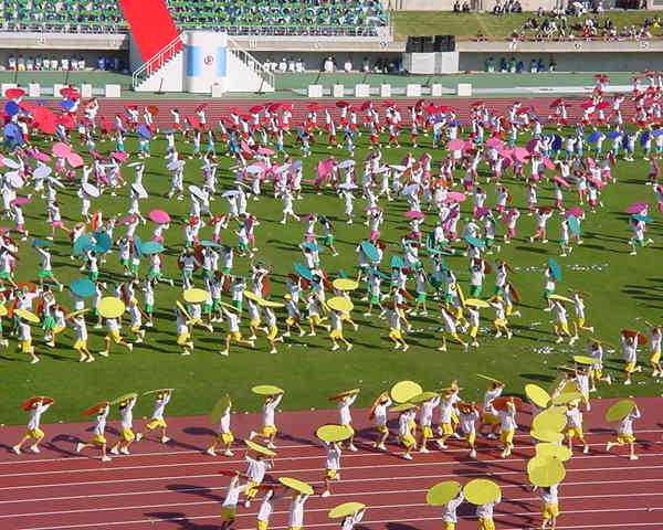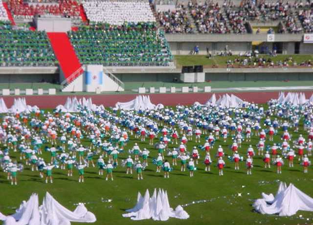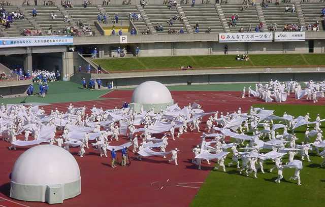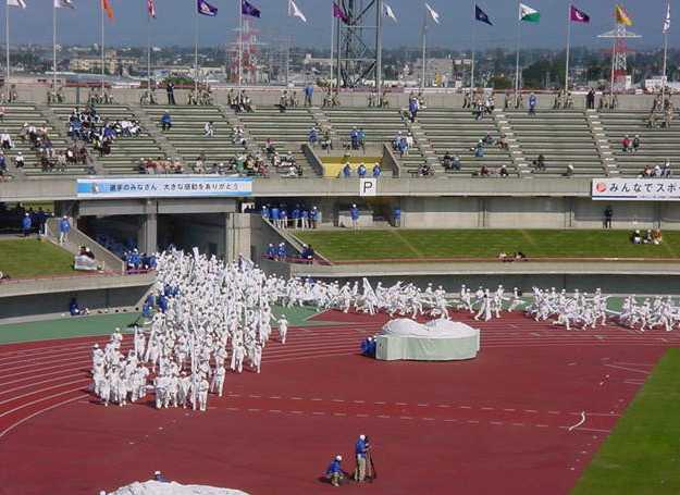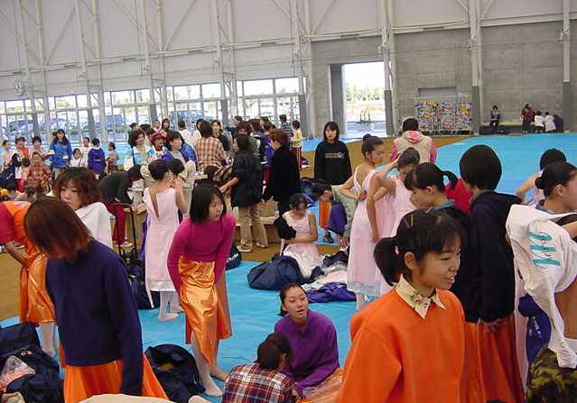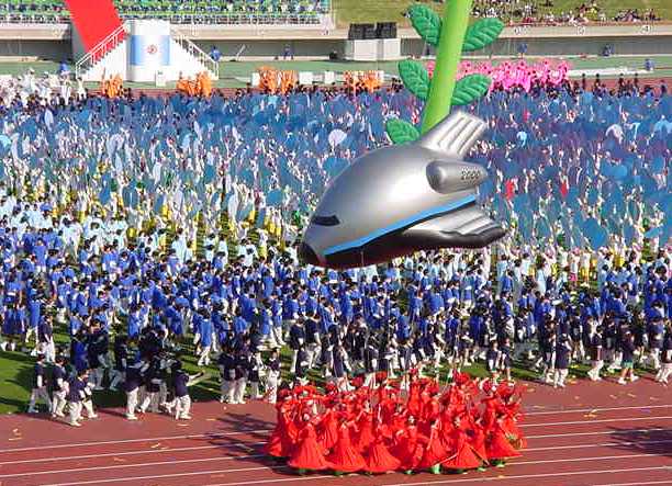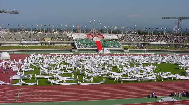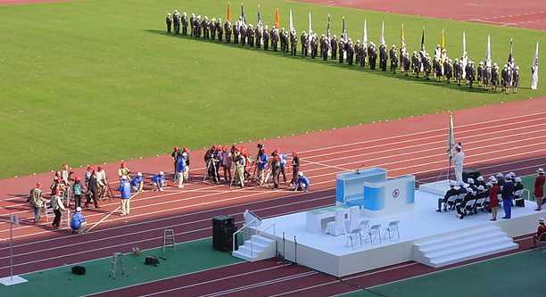 そしていよいよ、閉会式です。今回の皇族は高松宮?夫妻 でした(間違っているかも(^_^;))。 開会式の最後の「式典後演技」をまず最初に式典前演技と して、そのまんま同じにやりましたが、今回はよりイキイキと 感動的でした。そして式典。駅に預けた荷物にスペアバッテリ を忘れたので、300枚あたりでうち止めとなりましたが、 まぁだいたいこんなもんです。(^_^;)