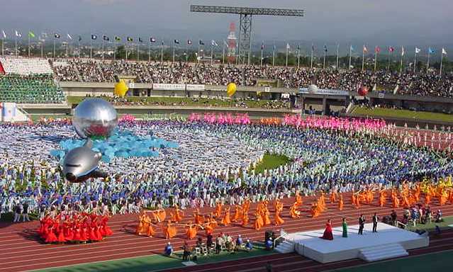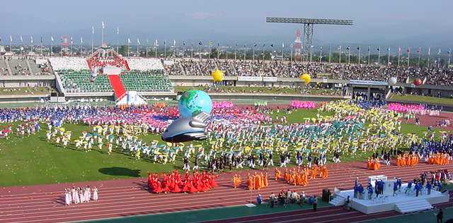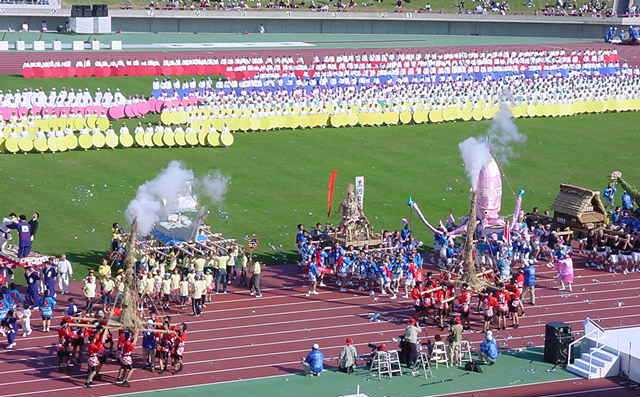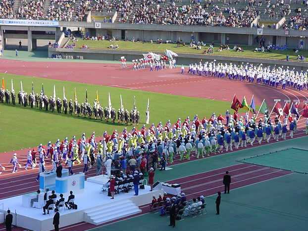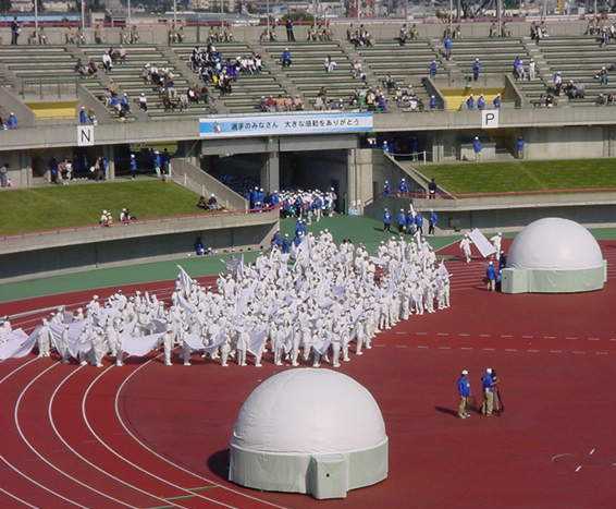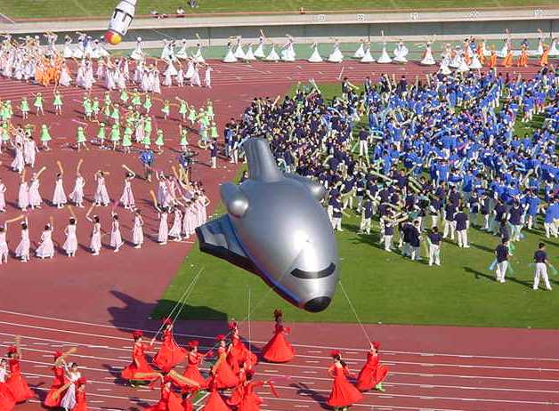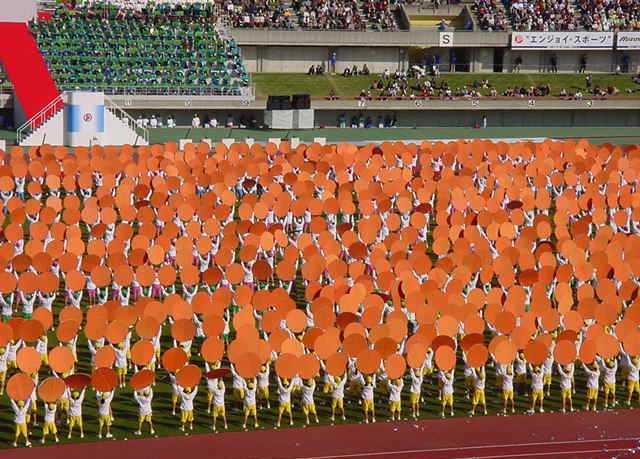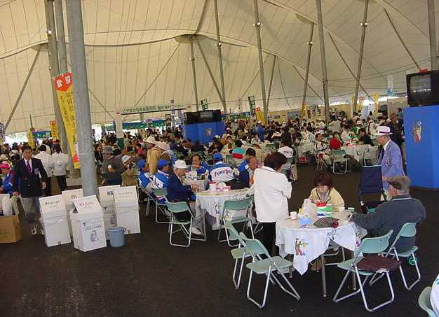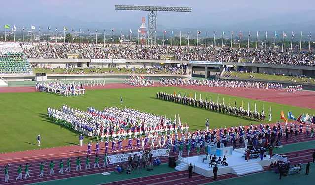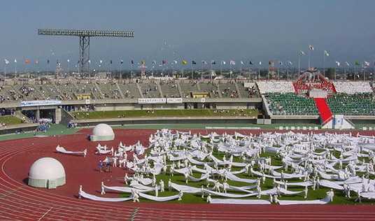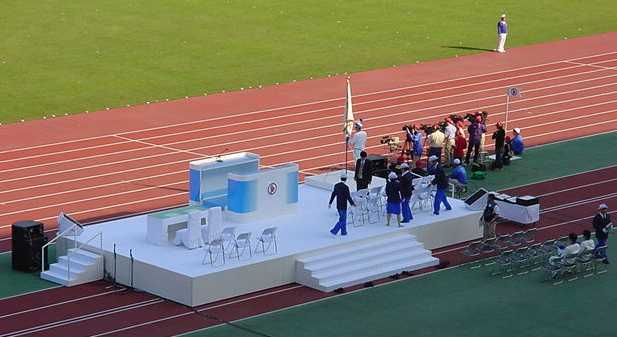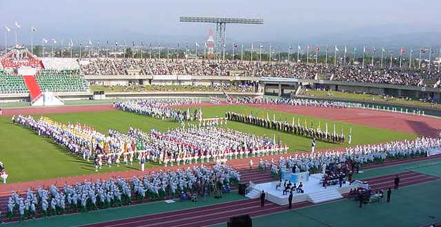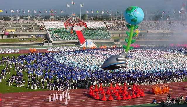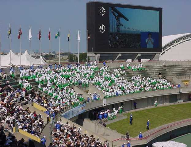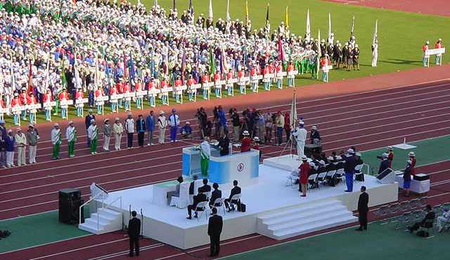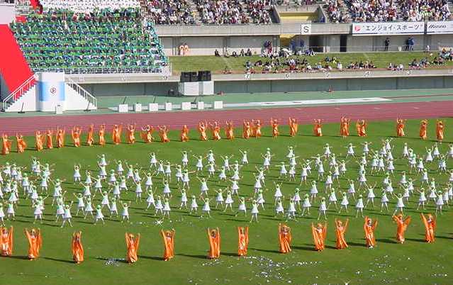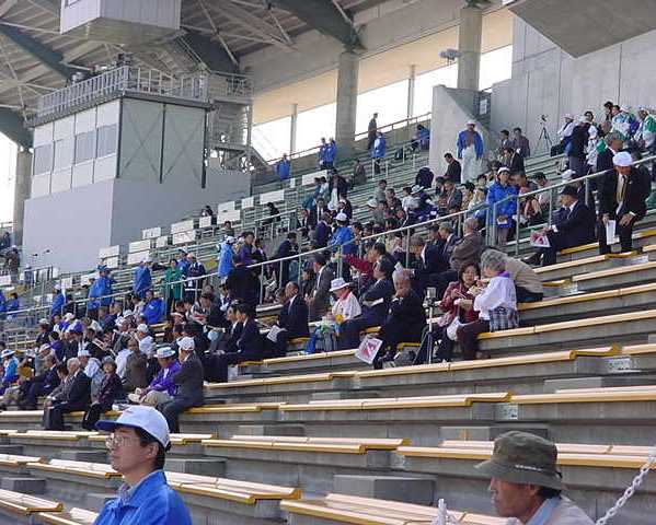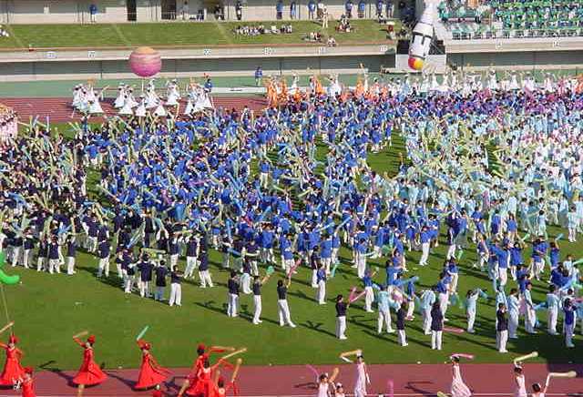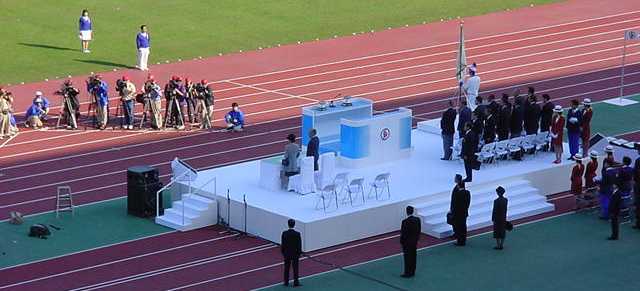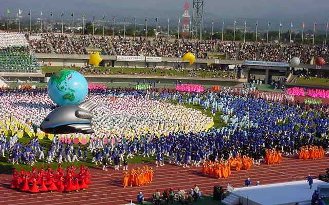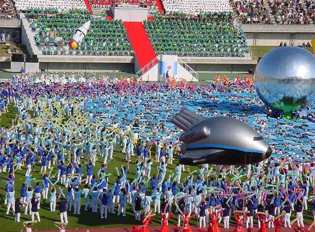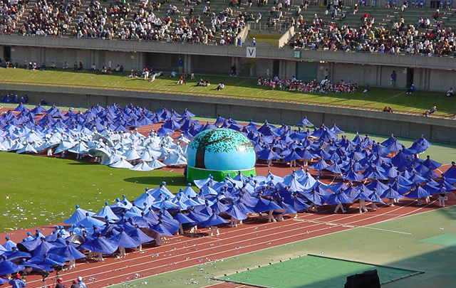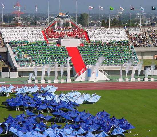 そしていよいよ、閉会式です。今回の皇族は高松宮?夫妻 でした(間違っているかも(^_^;))。 開会式の最後の「式典後演技」をまず最初に式典前演技と して、そのまんま同じにやりましたが、今回はよりイキイキと 感動的でした。そして式典。駅に預けた荷物にスペアバッテリ を忘れたので、300枚あたりでうち止めとなりましたが、 まぁだいたいこんなもんです。(^_^;)