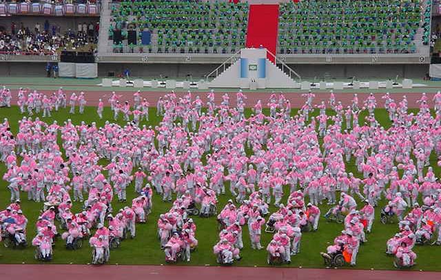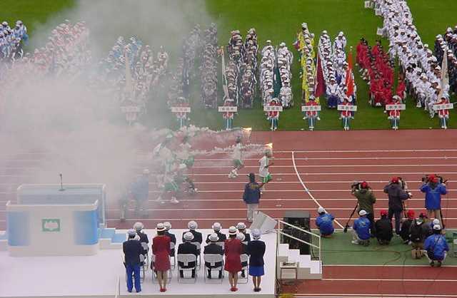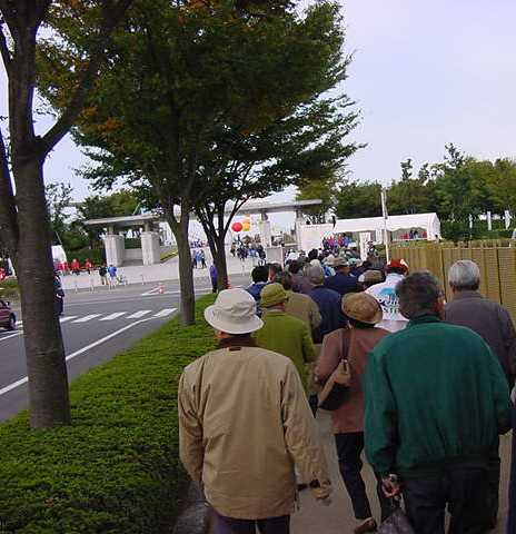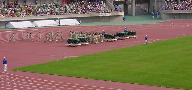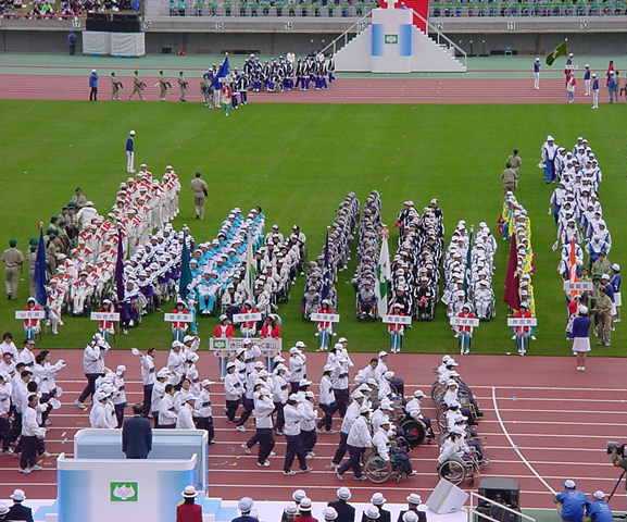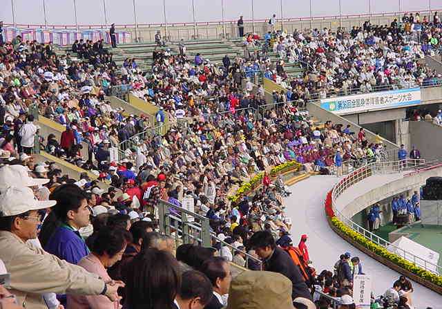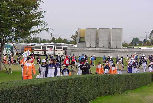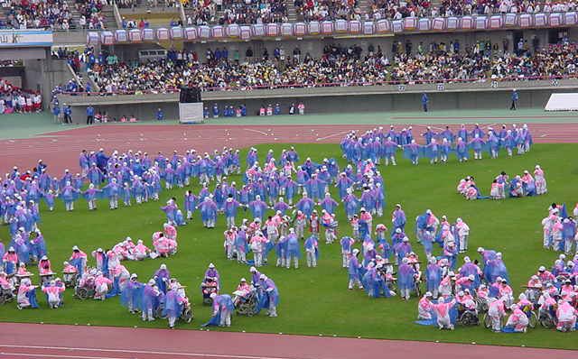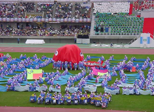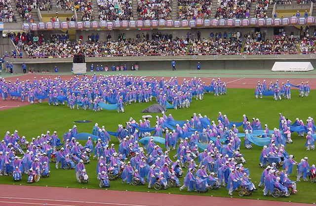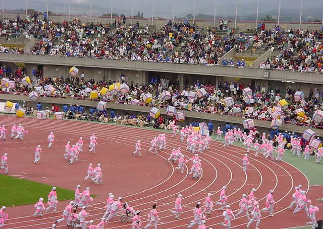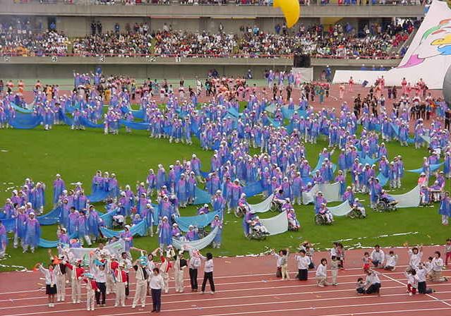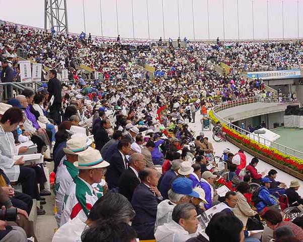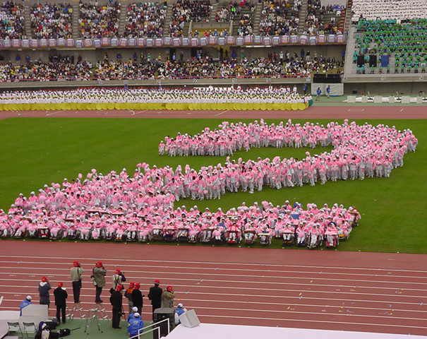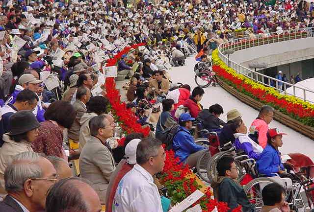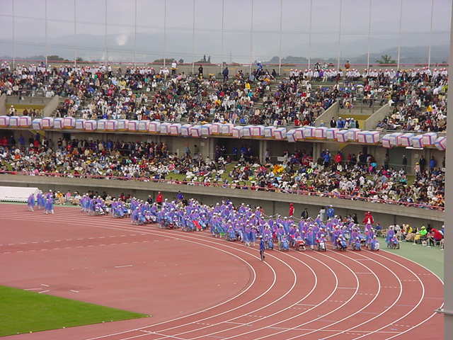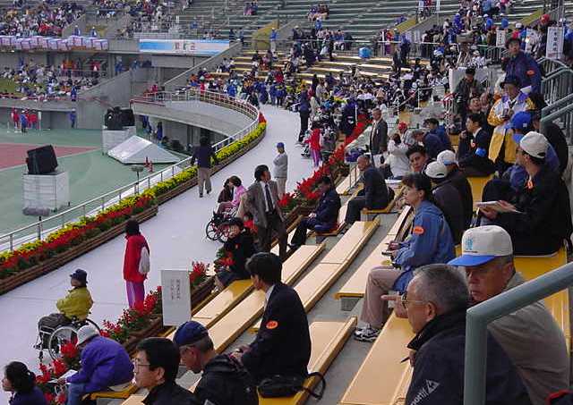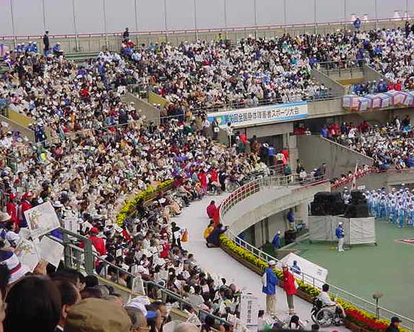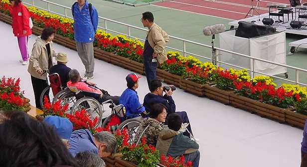 開会式会場で、スタジアムの席に着くまでの風景です。 車椅子を多く見かける(当然)以外は、まぁ国体と変わらない 熱気でした。むしろ、車椅子などがペースの基本になる ので、ちょっと落ちついたいい雰囲気でした。