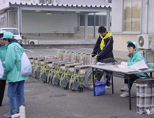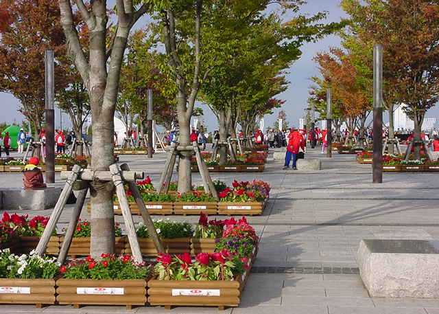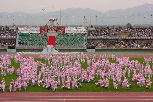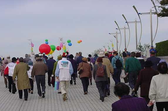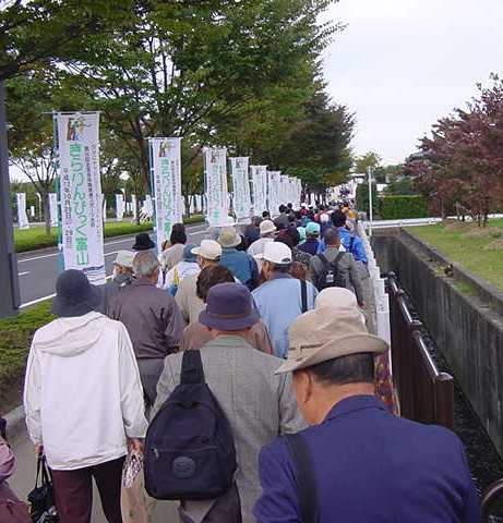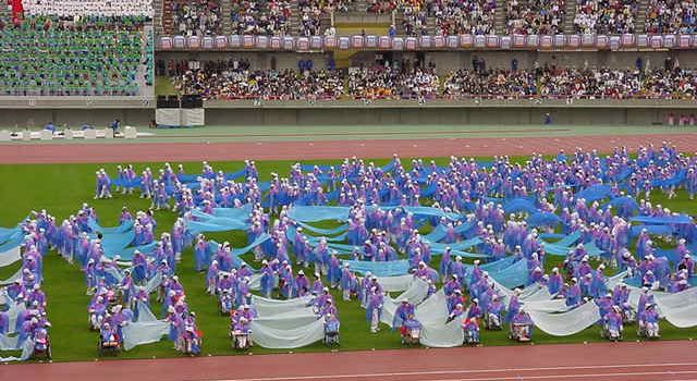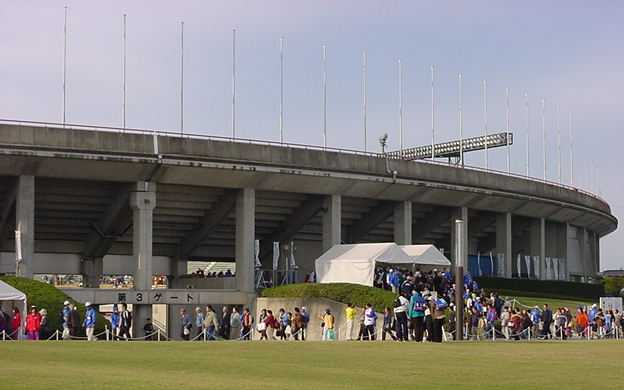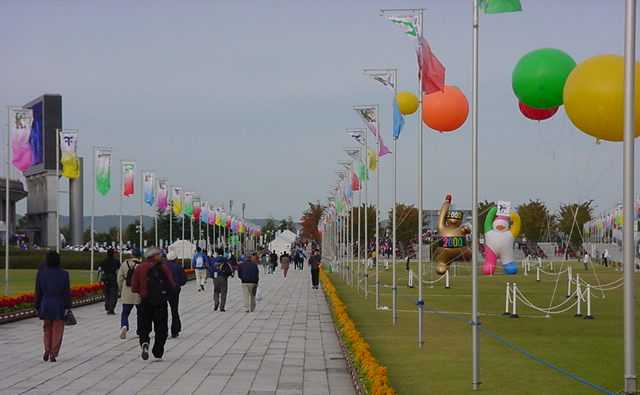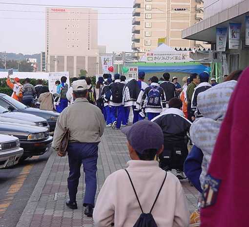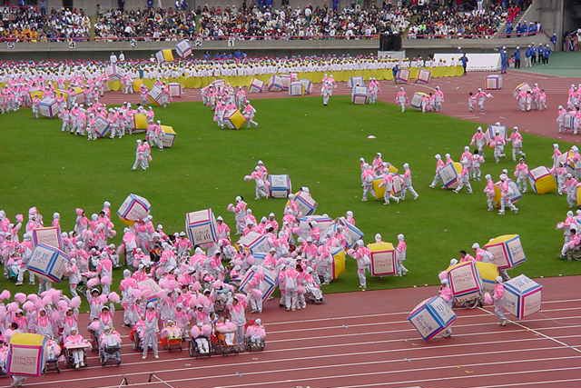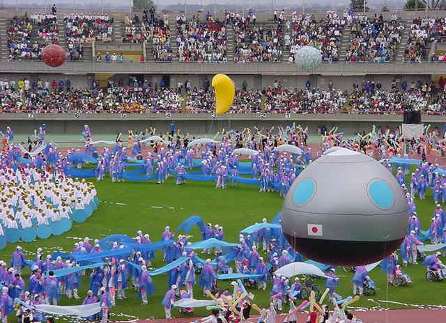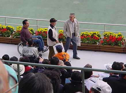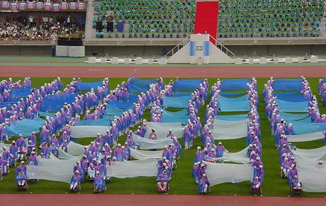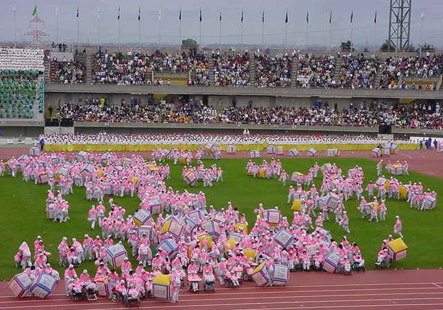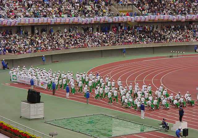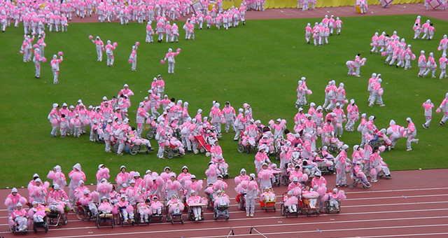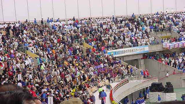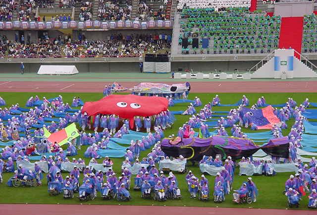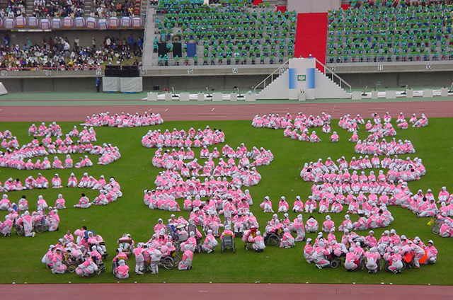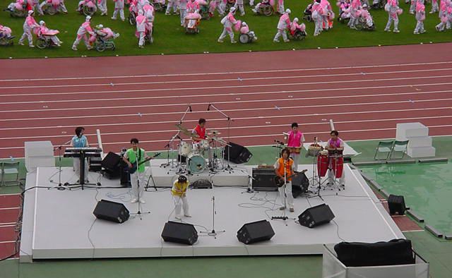 開会式会場で、スタジアムの席に着くまでの風景です。 車椅子を多く見かける(当然)以外は、まぁ国体と変わらない 熱気でした。むしろ、車椅子などがペースの基本になる ので、ちょっと落ちついたいい雰囲気でした。