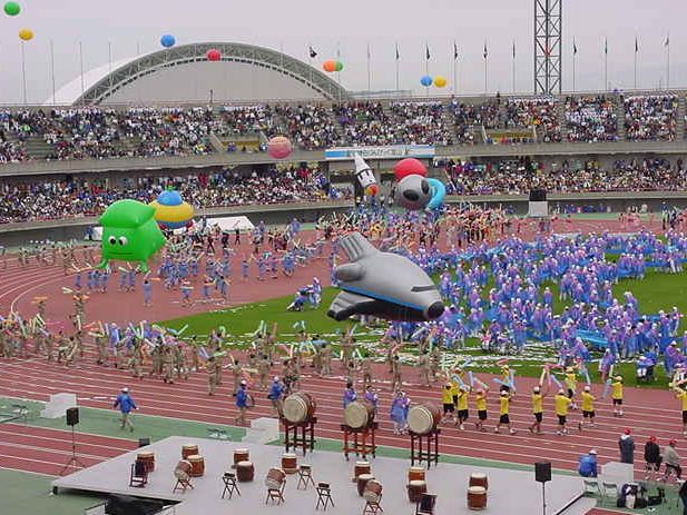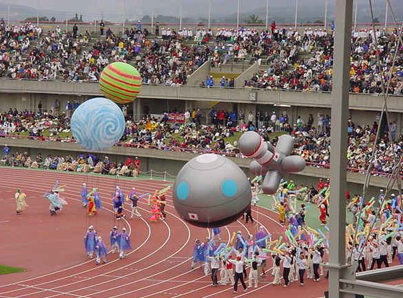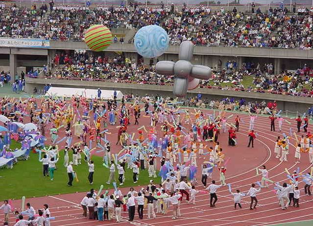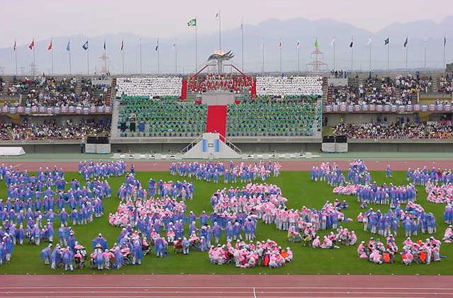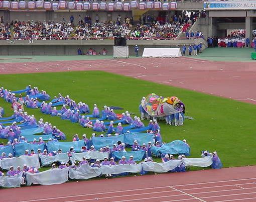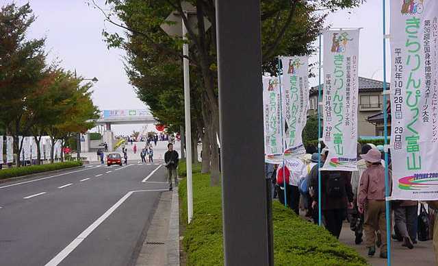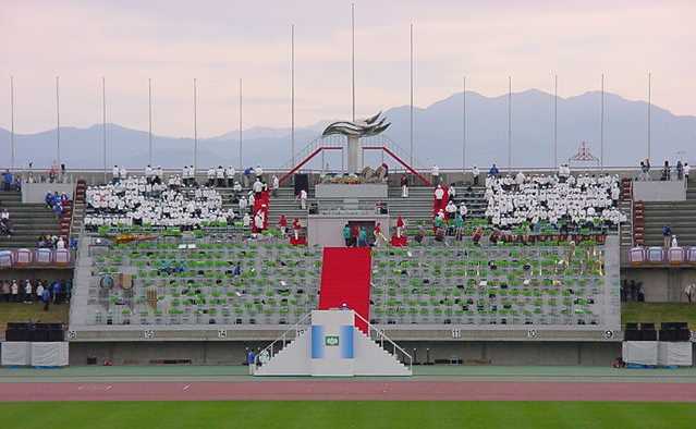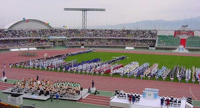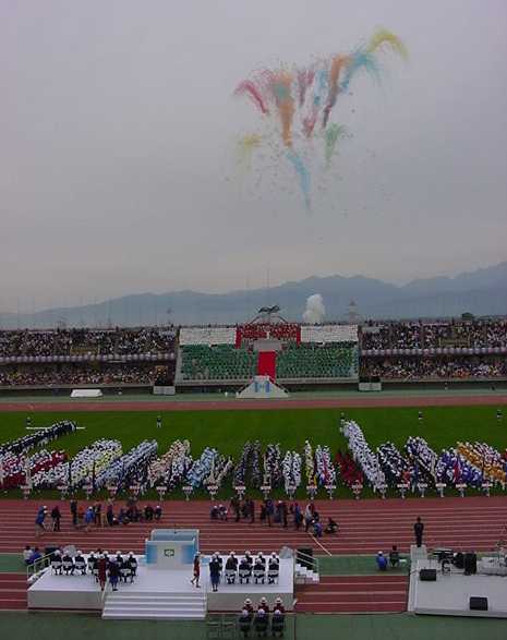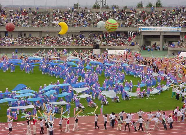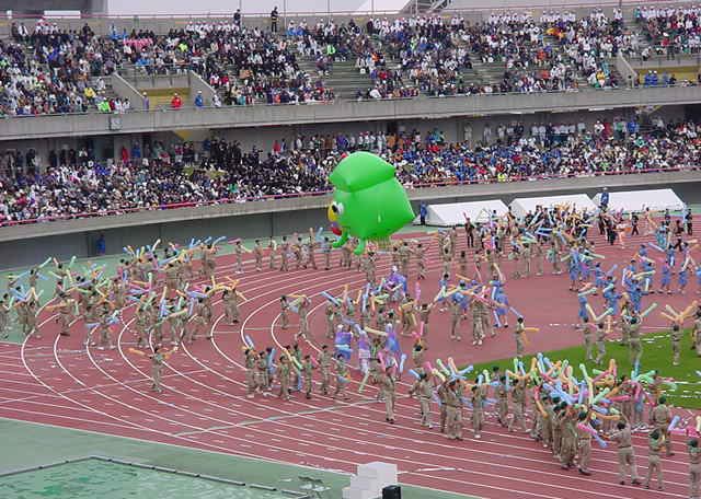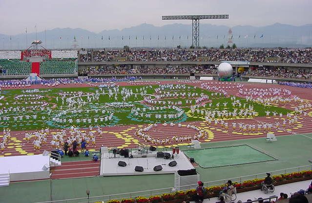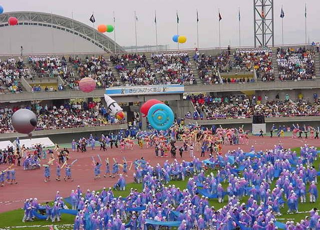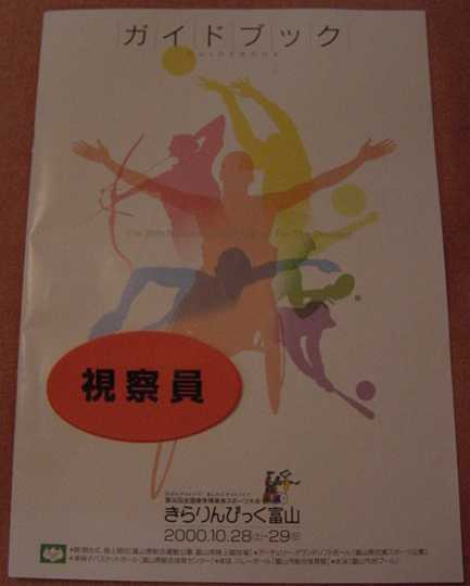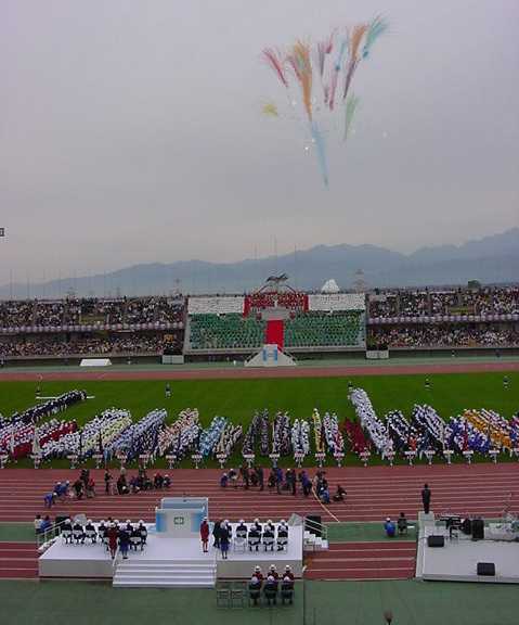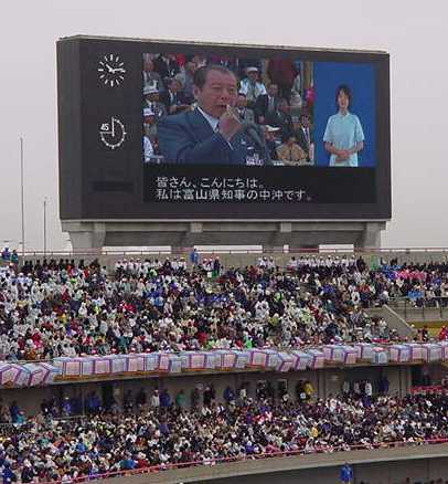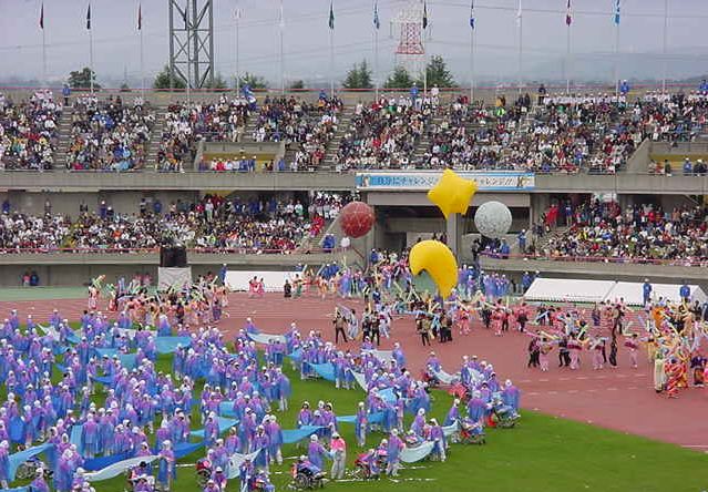 富山きらりんぴっく開会式視察2000年10月 長嶋洋一2003静岡国体式典プロデュースを静岡県から委嘱された静岡文化芸術大学 国体プロジェクトの一員として、2000きらりんぴっく開会式(富山市)に 視察に行きました。 国体は文部省管轄ですが、この全国身体障害者スポーツ大会は厚生省と いうことで、視察を依頼した県のセクションも国体とは少し違うのですが、 立場上、あくまで国体と関連づけて視察しました。 富山国体夏期大会開会式(秋篠宮夫妻)、秋季大会開会式(天皇皇后)、 秋季大会閉会式(常陸宮夫妻)、そしてきらりんぴっく開会式(皇太子夫妻)、 と式典視察のハシゴで、ナマ皇族をざっと見ました。(^_^)