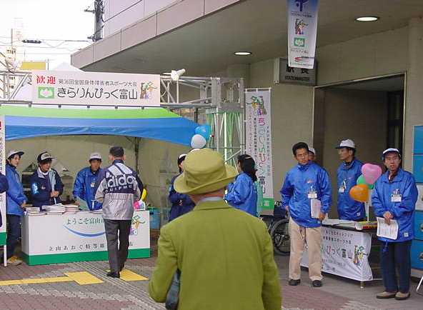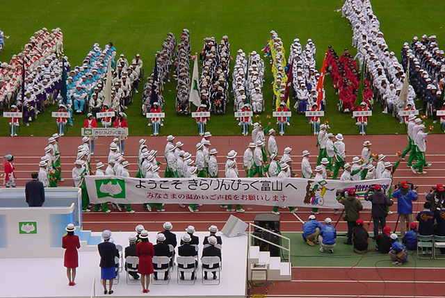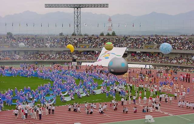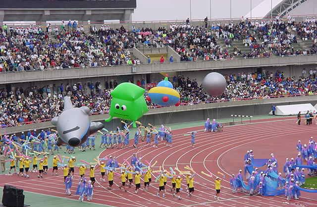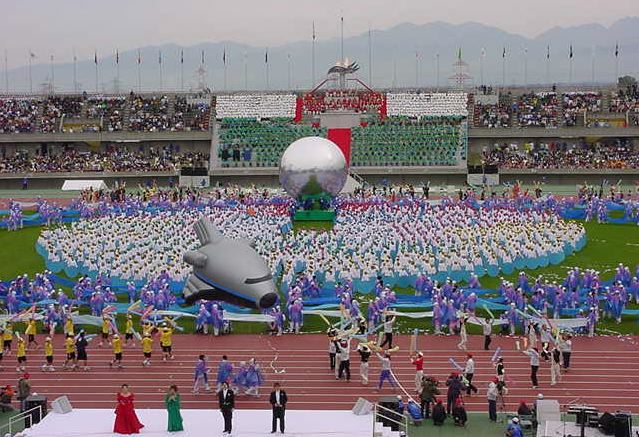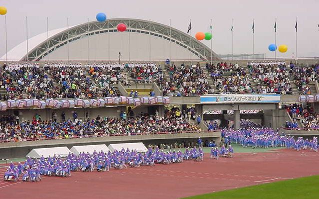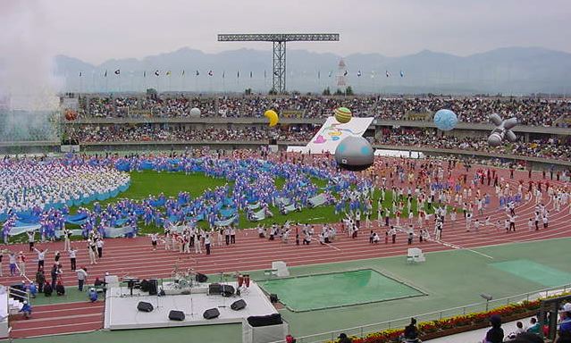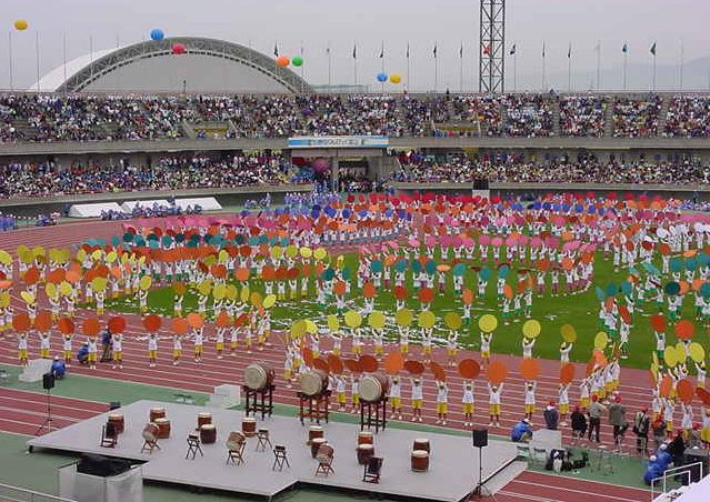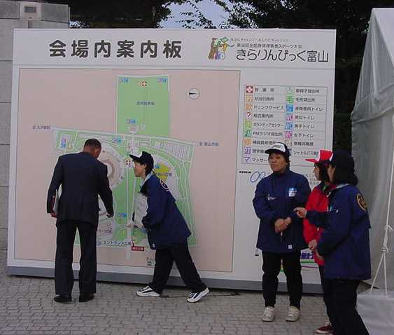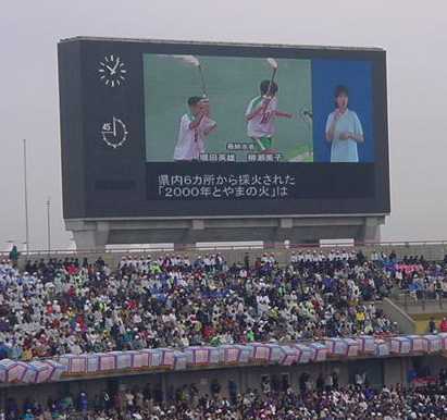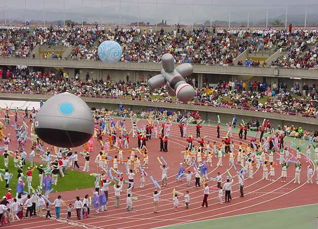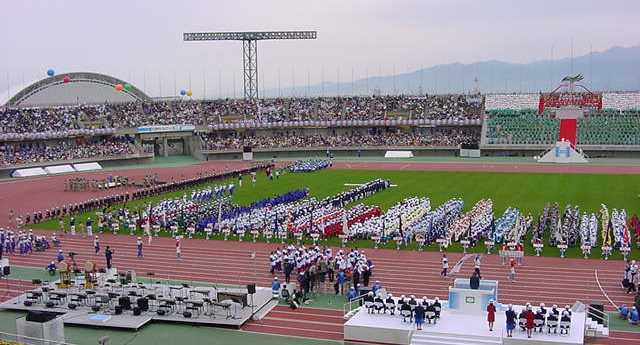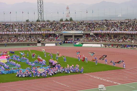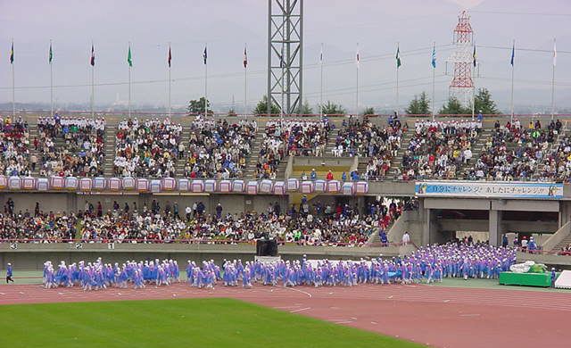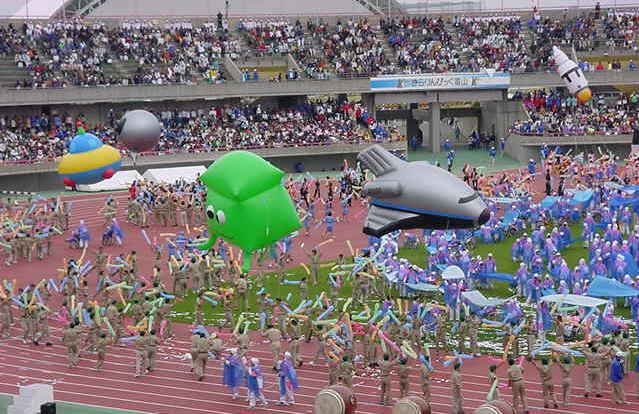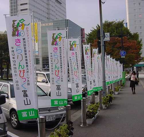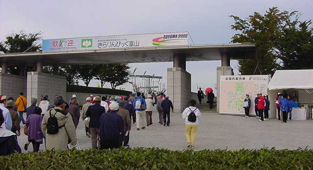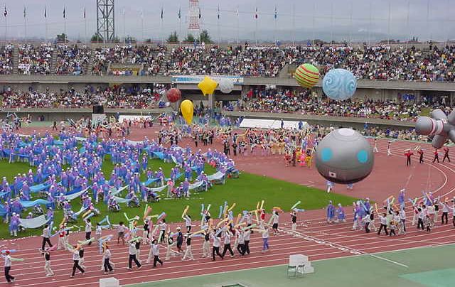 富山きらりんぴっく開会式視察2000年10月 長嶋洋一2003静岡国体式典プロデュースを静岡県から委嘱された静岡文化芸術大学 国体プロジェクトの一員として、2000きらりんぴっく開会式(富山市)に 視察に行きました。 国体は文部省管轄ですが、この全国身体障害者スポーツ大会は厚生省と いうことで、視察を依頼した県のセクションも国体とは少し違うのですが、 立場上、あくまで国体と関連づけて視察しました。 富山国体夏期大会開会式(秋篠宮夫妻)、秋季大会開会式(天皇皇后)、 秋季大会閉会式(常陸宮夫妻)、そしてきらりんぴっく開会式(皇太子夫妻)、 と式典視察のハシゴで、ナマ皇族をざっと見ました。(^_^)