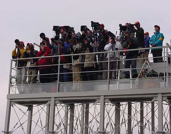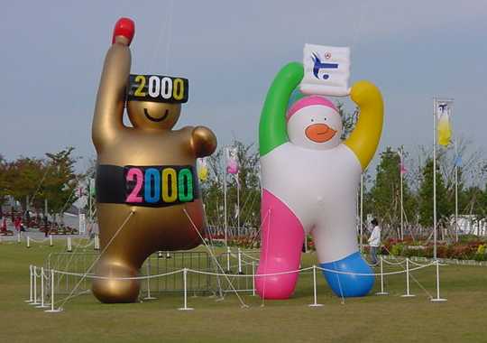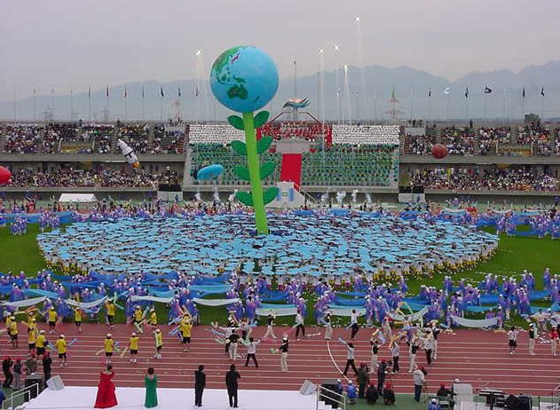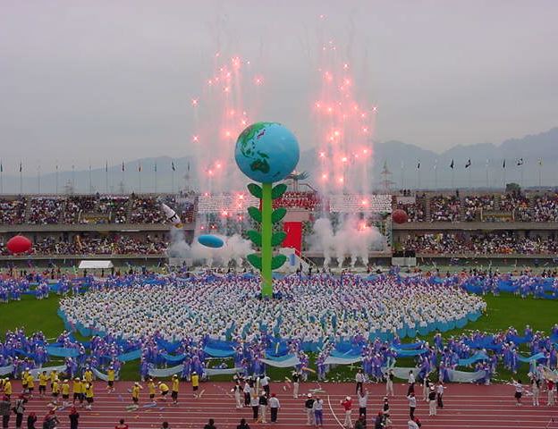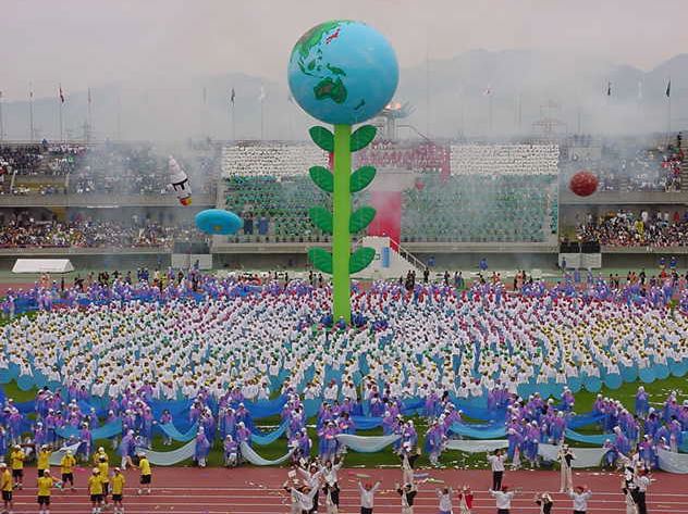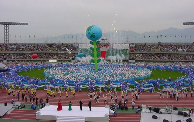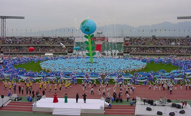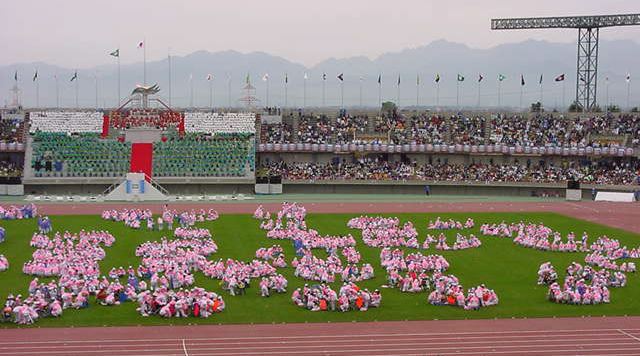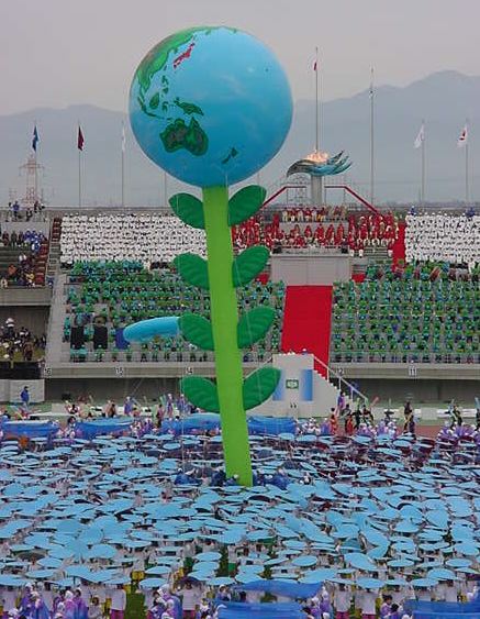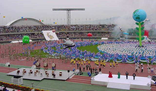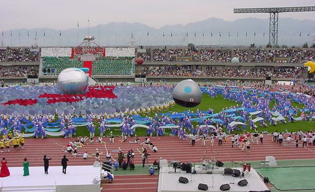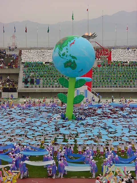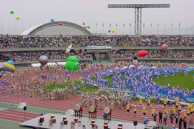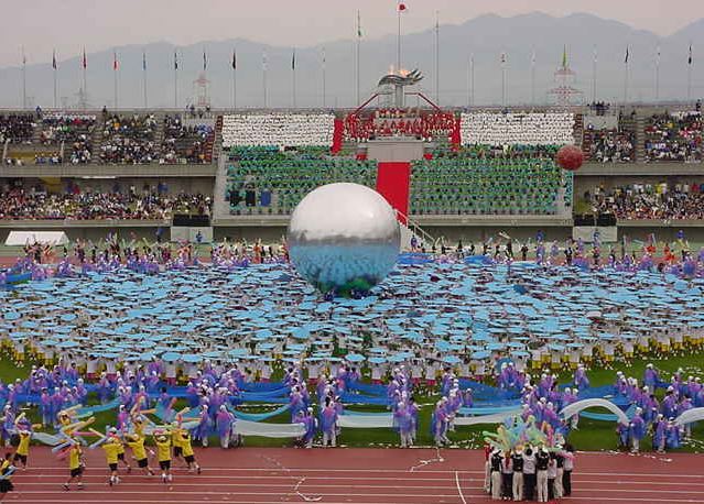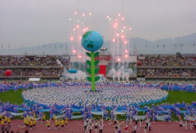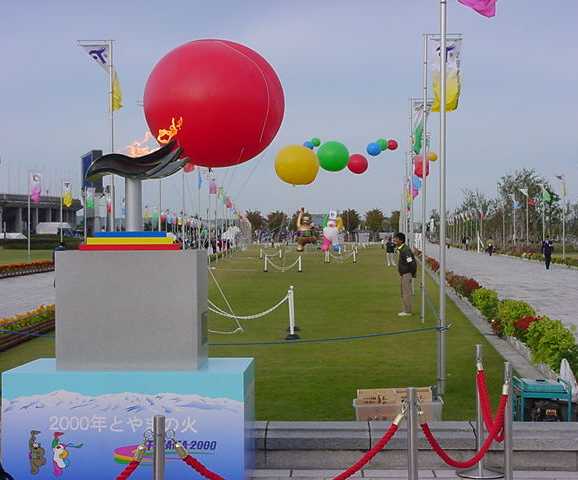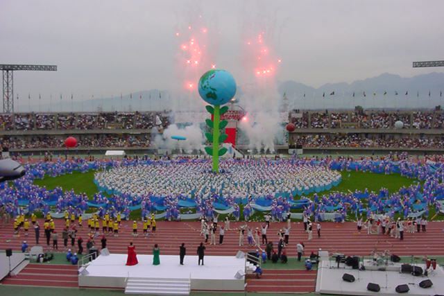 富山きらりんぴっく開会式視察2000年10月 長嶋洋一2003静岡国体式典プロデュースを静岡県から委嘱された静岡文化芸術大学 国体プロジェクトの一員として、2000きらりんぴっく開会式(富山市)に 視察に行きました。 国体は文部省管轄ですが、この全国身体障害者スポーツ大会は厚生省と いうことで、視察を依頼した県のセクションも国体とは少し違うのですが、 立場上、あくまで国体と関連づけて視察しました。 富山国体夏期大会開会式(秋篠宮夫妻)、秋季大会開会式(天皇皇后)、 秋季大会閉会式(常陸宮夫妻)、そしてきらりんぴっく開会式(皇太子夫妻)、 と式典視察のハシゴで、ナマ皇族をざっと見ました。(^_^)