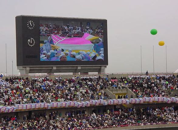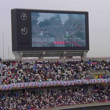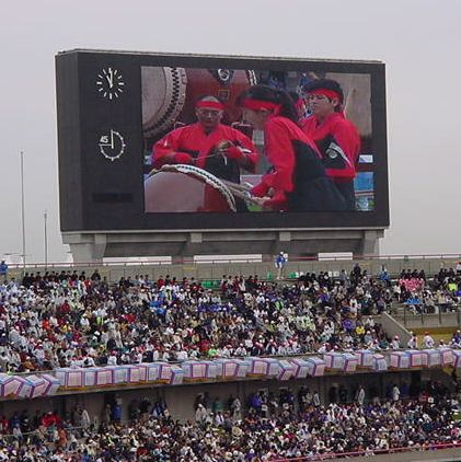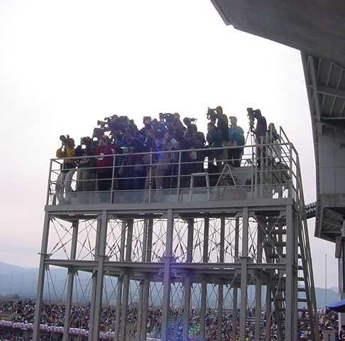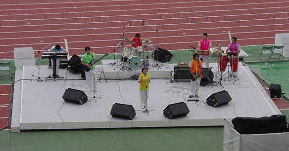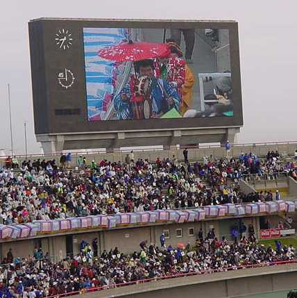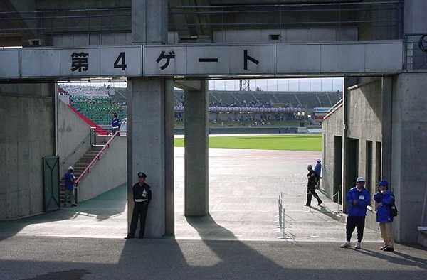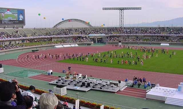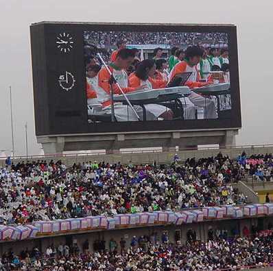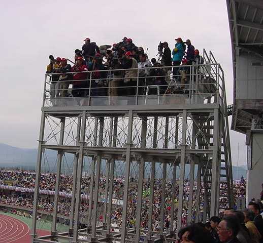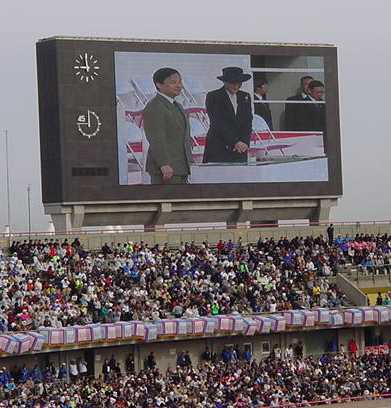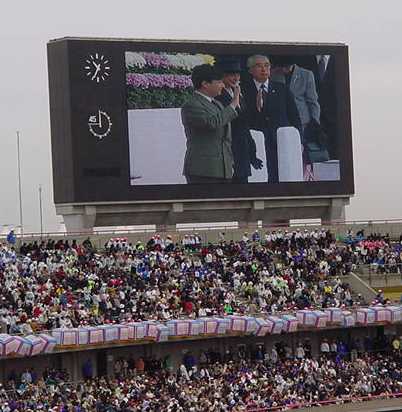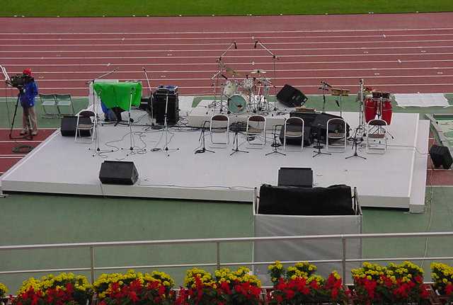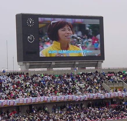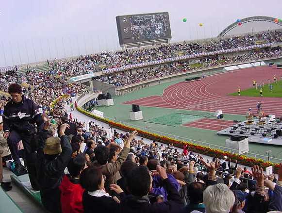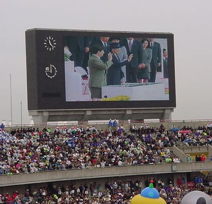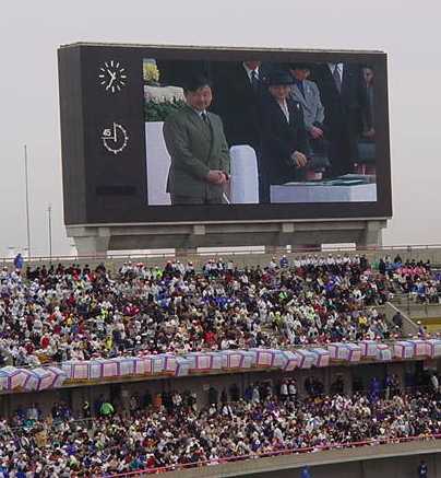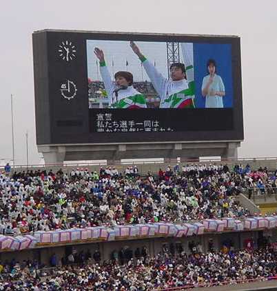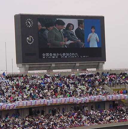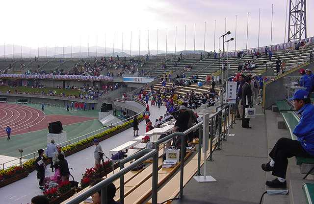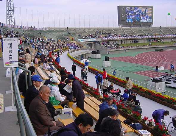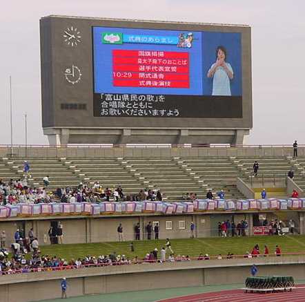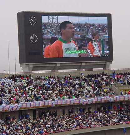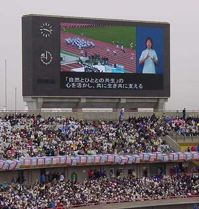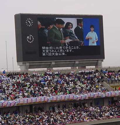 視察員席に着いたのは朝7時50分、なかなか涼しいもの でした(^_^;)。 国体の時と違ったところとしては、メインスタンドに 仮設で車椅子のための通路がビシーッッと出来ていました。 それから、大型ディスプレイの表示として、手話通訳者の画像と アナウンス情報の文字表示という画面分割となったことです。