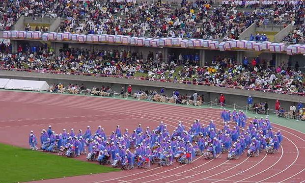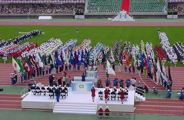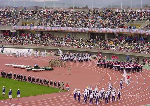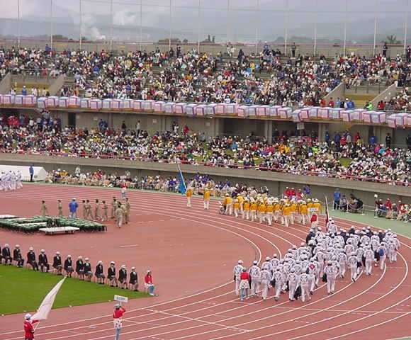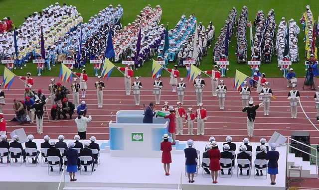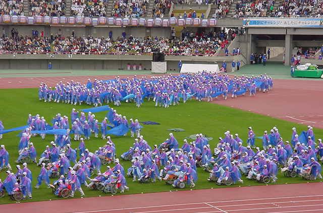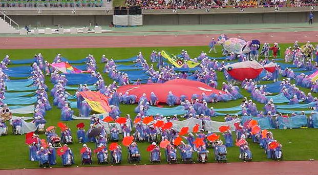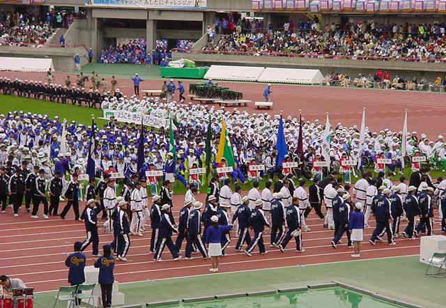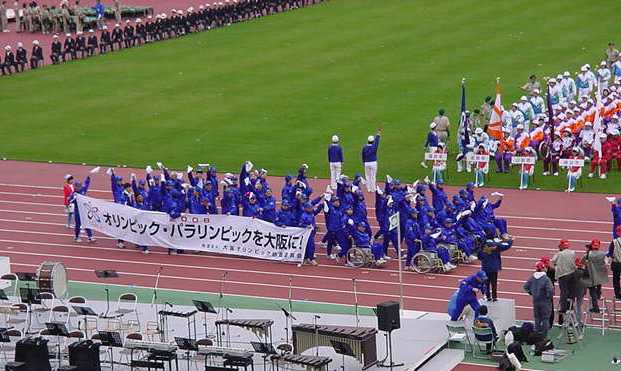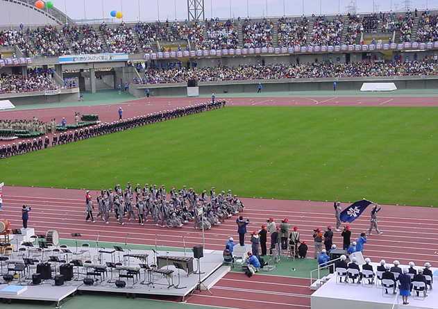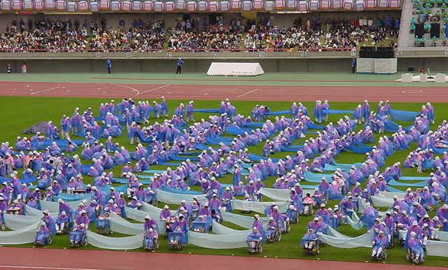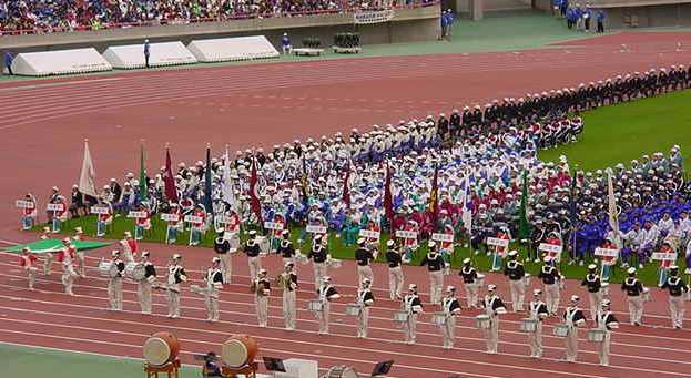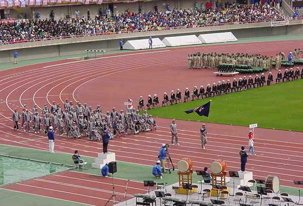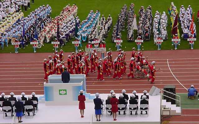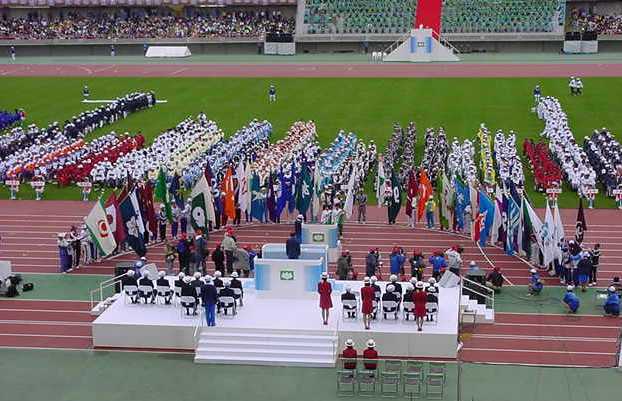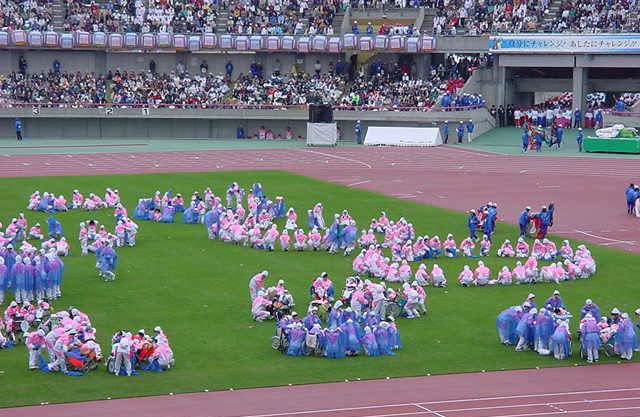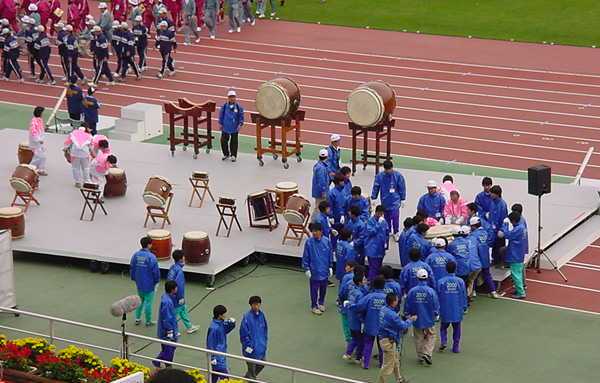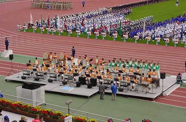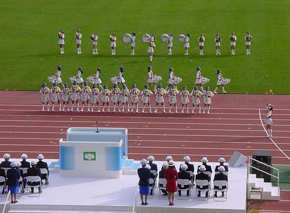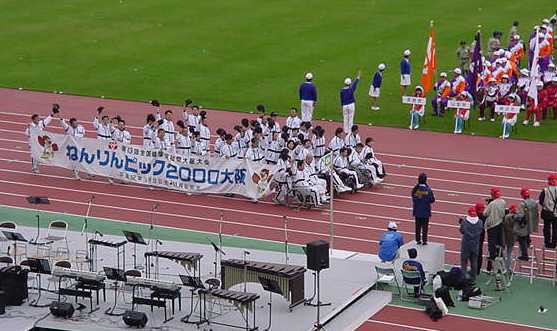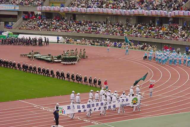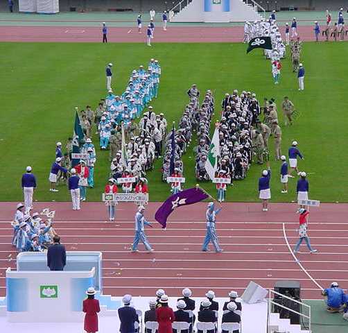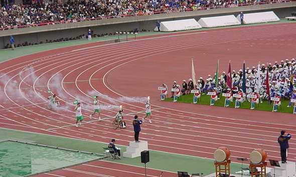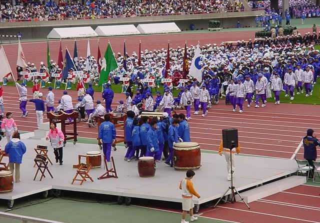 競技役員の入場、盲学校音楽隊の演奏、そして開会式です。 このあたりは、国体とまったく変わらない盛大な構成で 行われました。 もっとも感銘を受けたのは、大会旗の入場を先導した 聾学校の鼓隊です。空気の振動と視覚だけで、 聞こえない音楽のビートを揃えて演奏することの 素晴らしさに驚きました。
