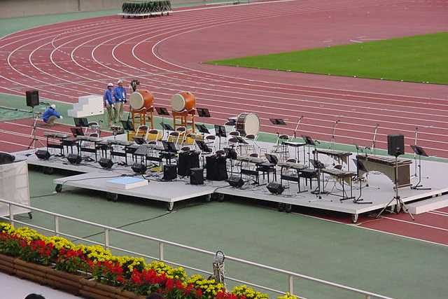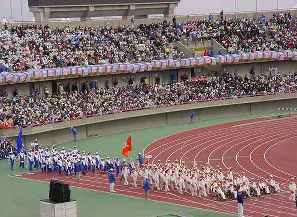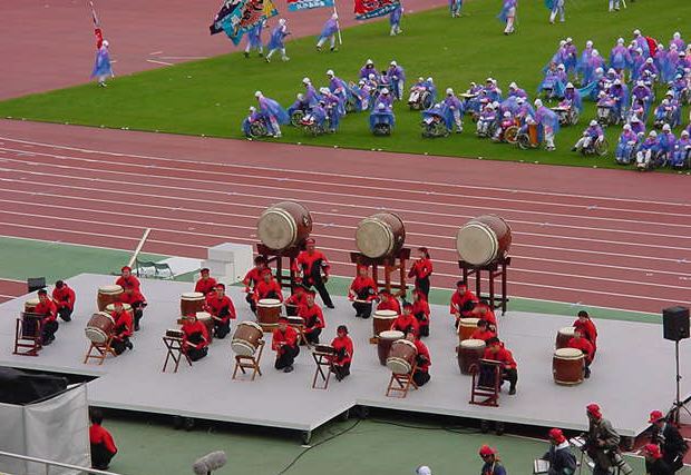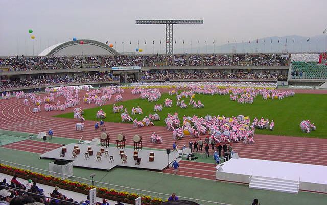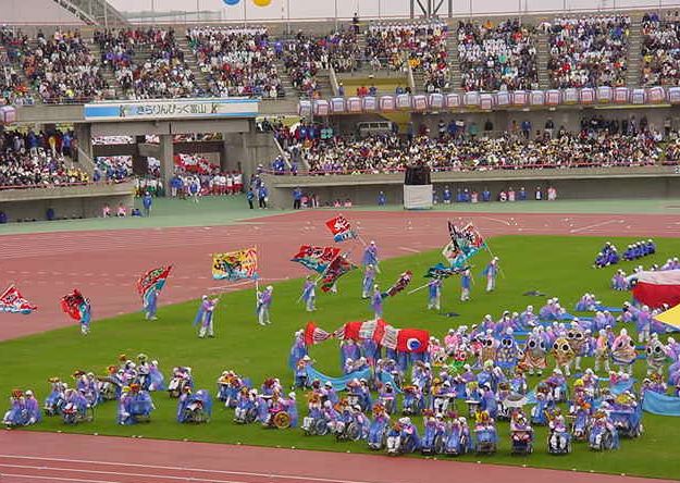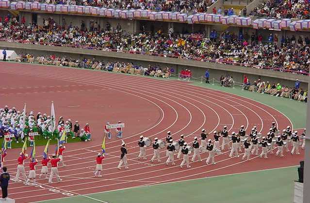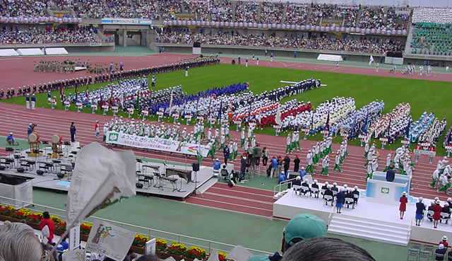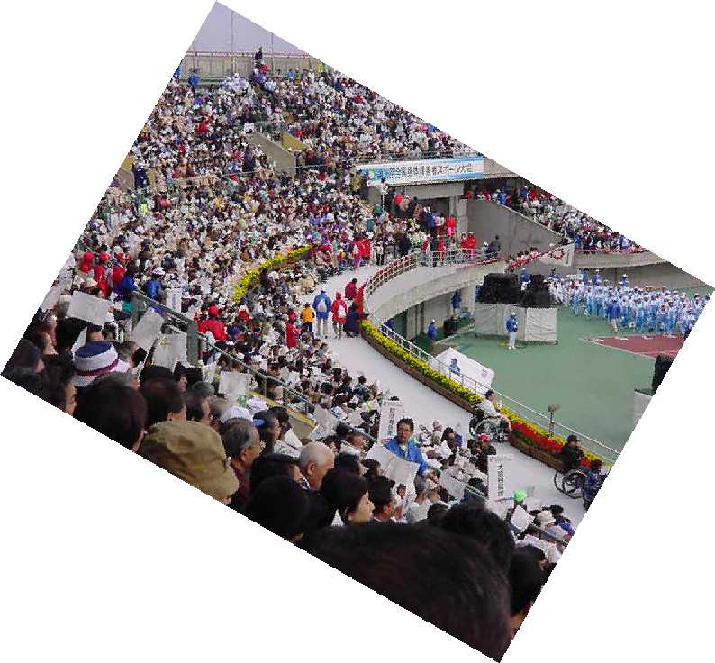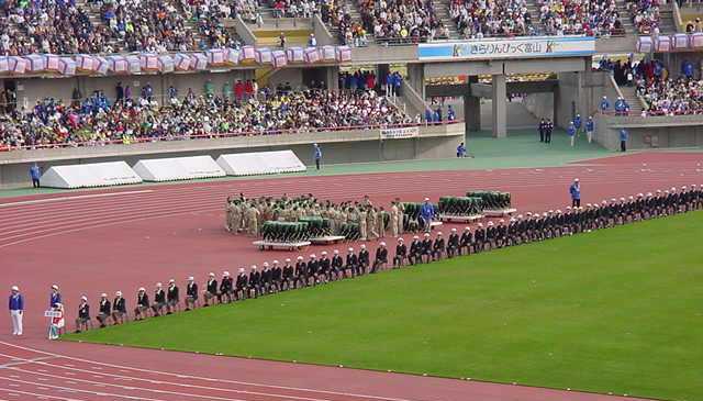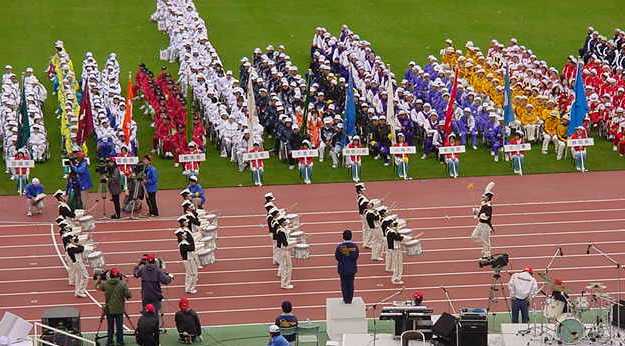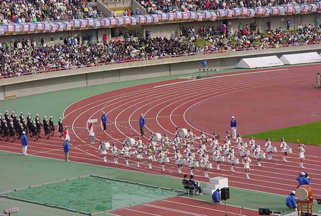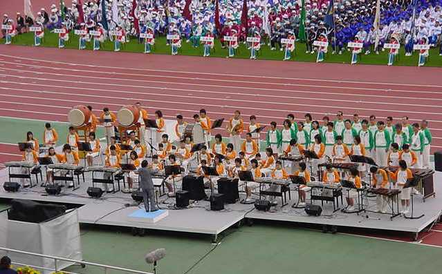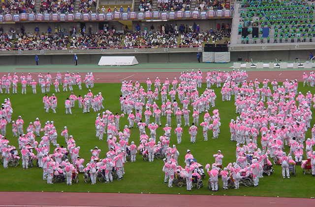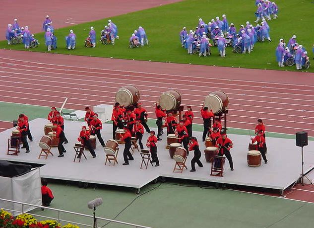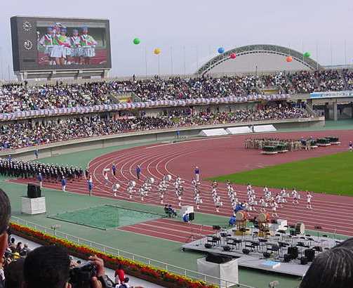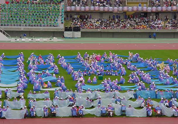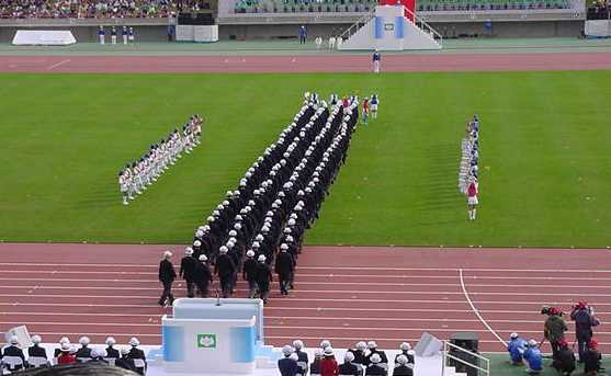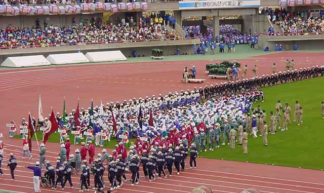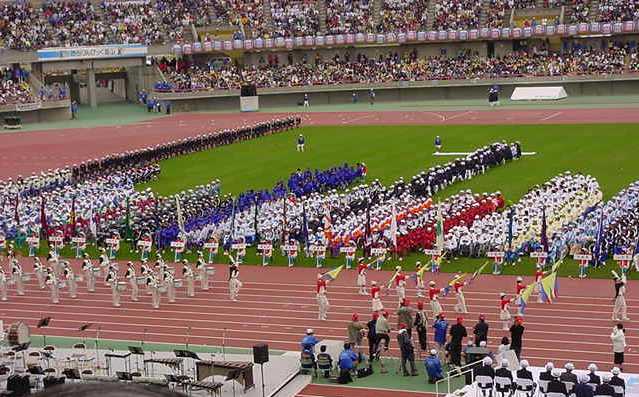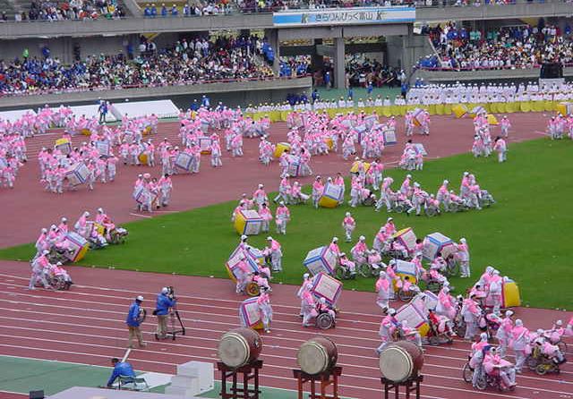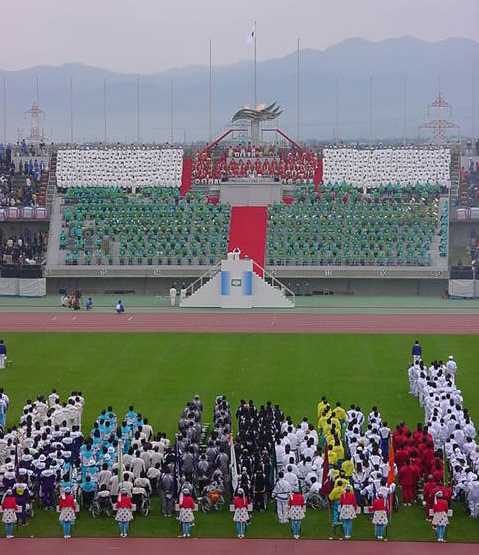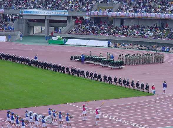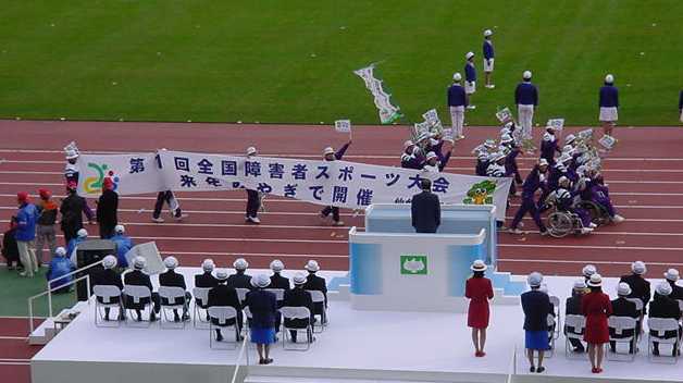 競技役員の入場、盲学校音楽隊の演奏、そして開会式です。 このあたりは、国体とまったく変わらない盛大な構成で 行われました。 もっとも感銘を受けたのは、大会旗の入場を先導した 聾学校の鼓隊です。空気の振動と視覚だけで、 聞こえない音楽のビートを揃えて演奏することの 素晴らしさに驚きました。