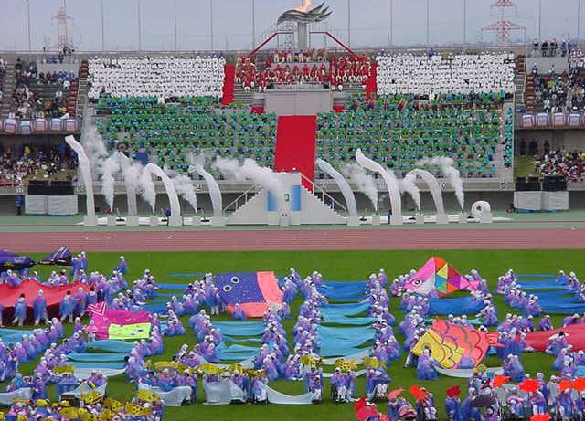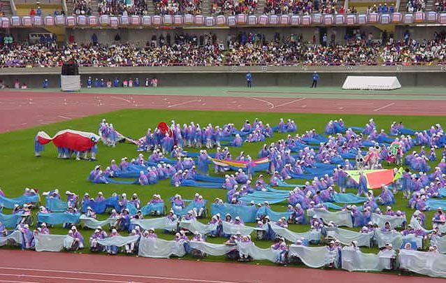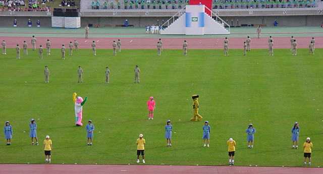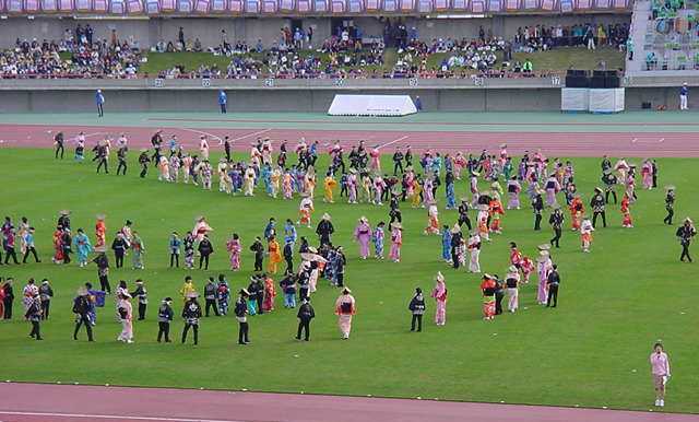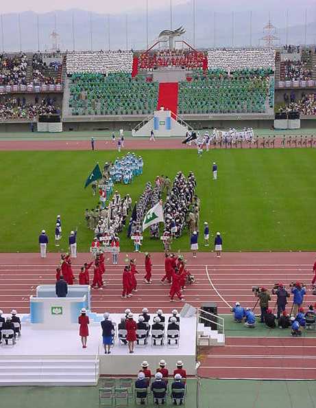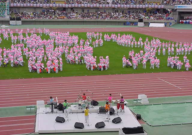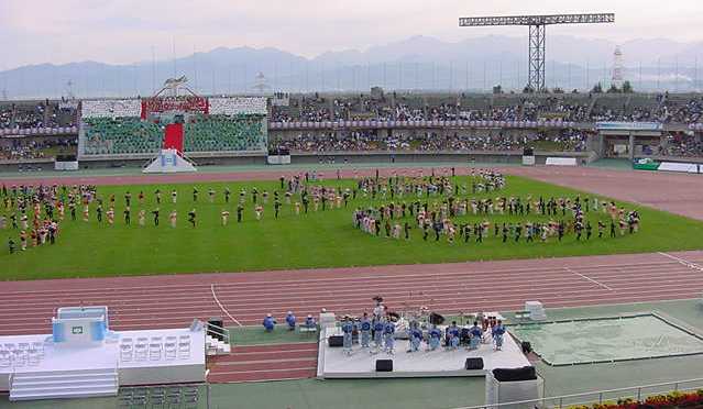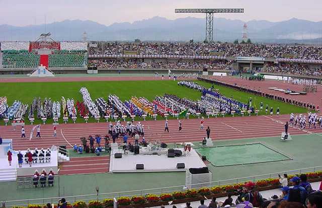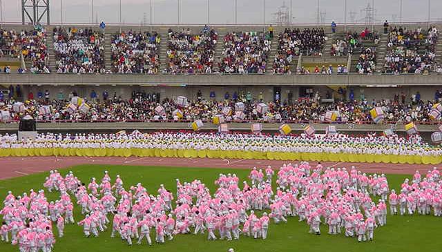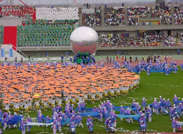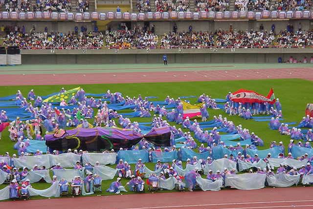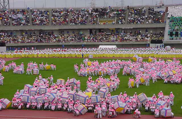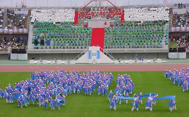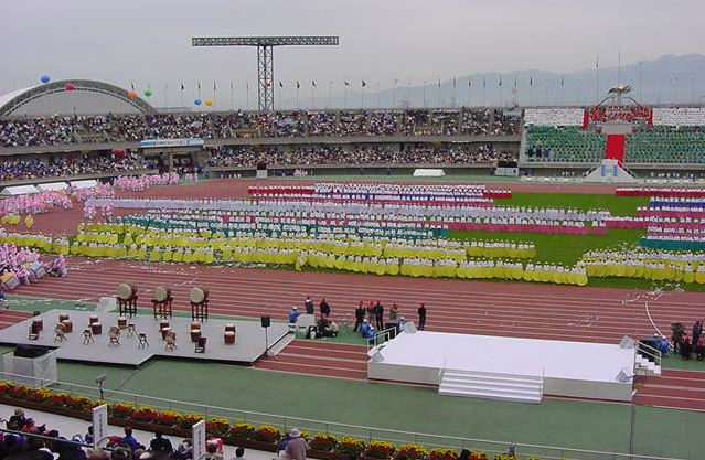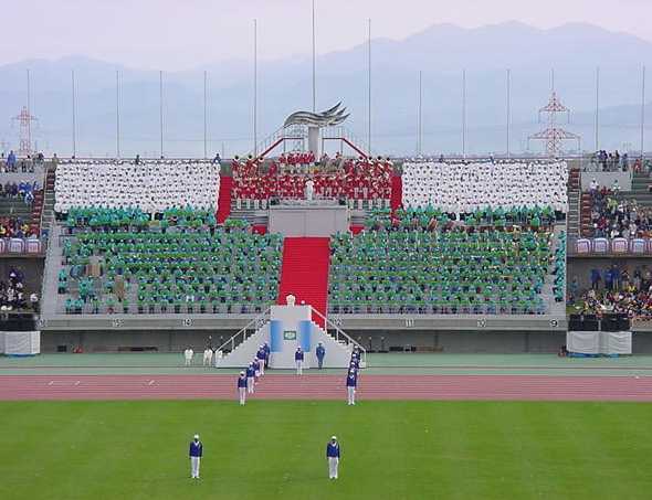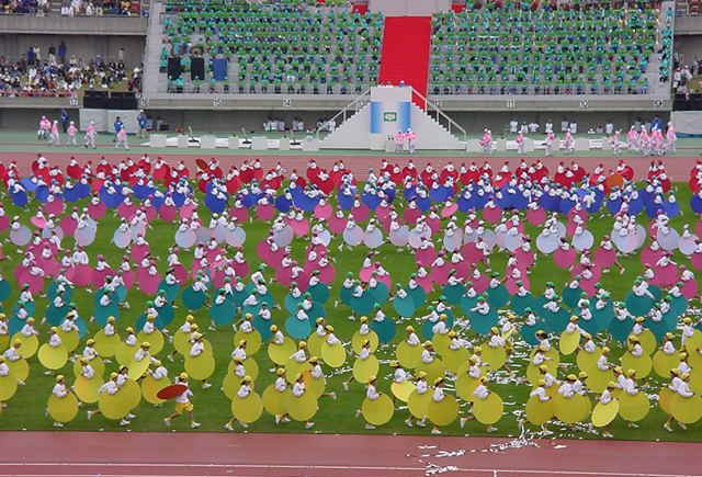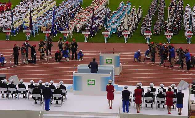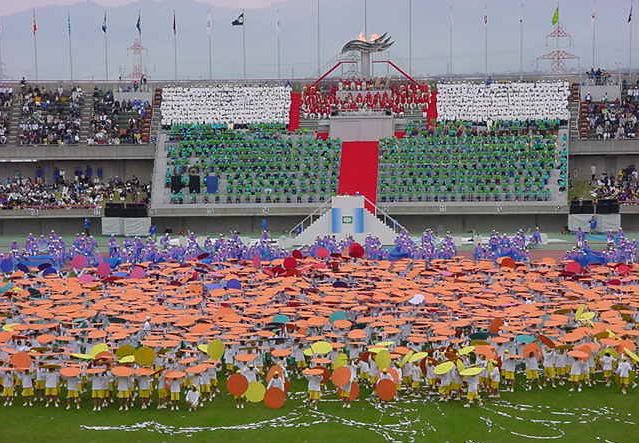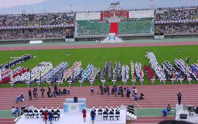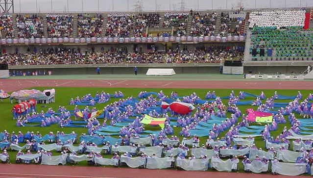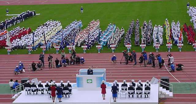 ここからは、皇太子夫妻を再び迎えての「式典後演技」です。 後半には、国体開会式での式典後演技、国体閉会式の 式典前演技と同じものを中核に据えて、要するに同じ ネタで3度、使い回しをした効率的な構成です。(^_^;)