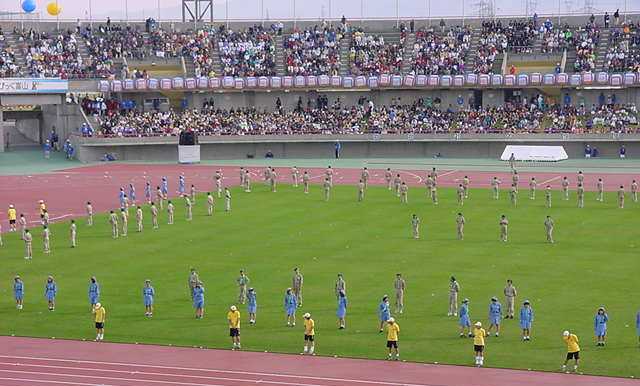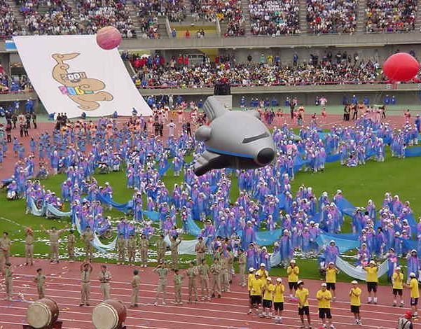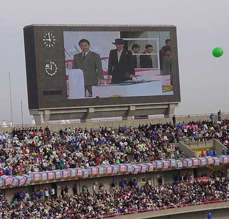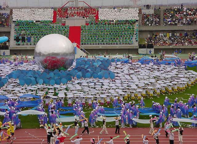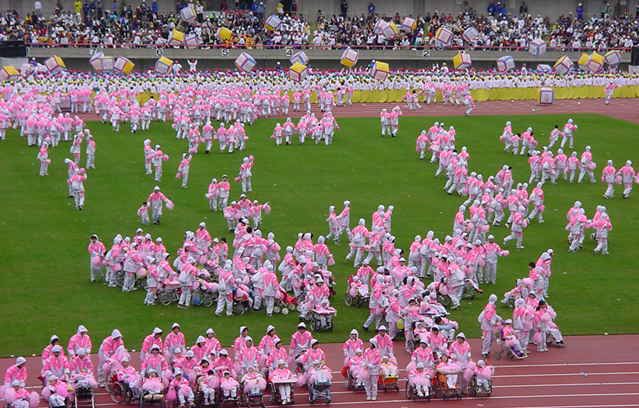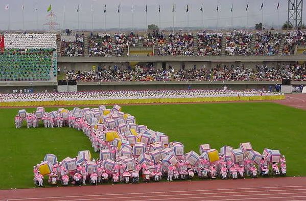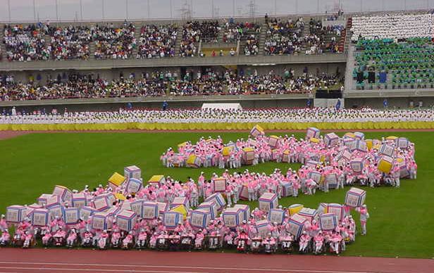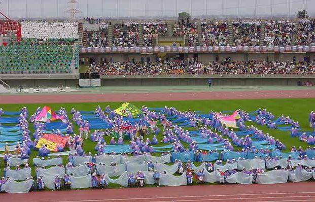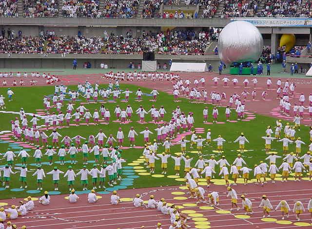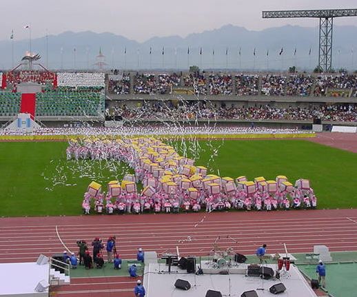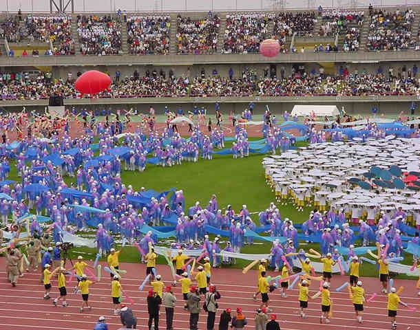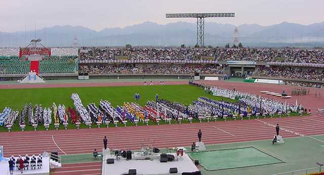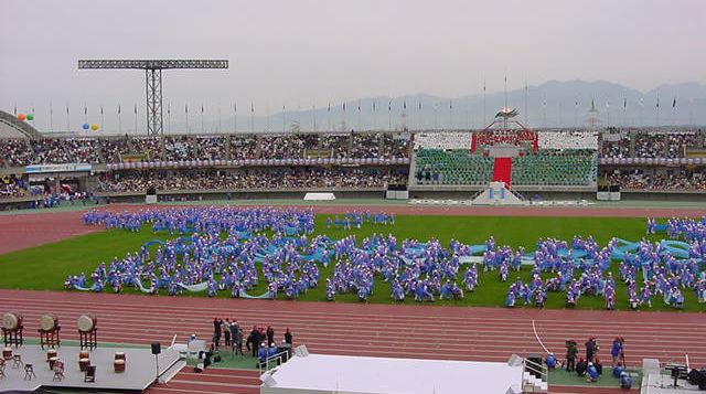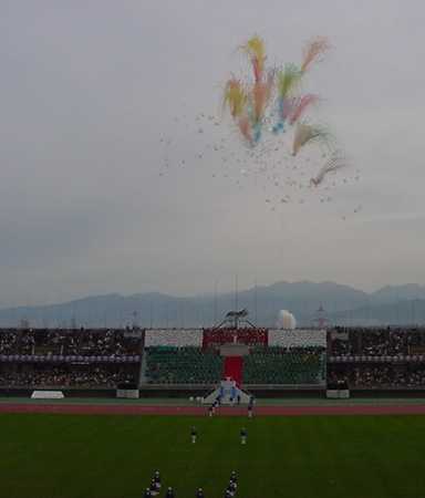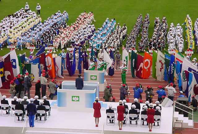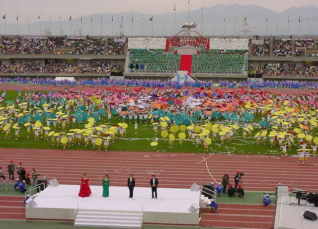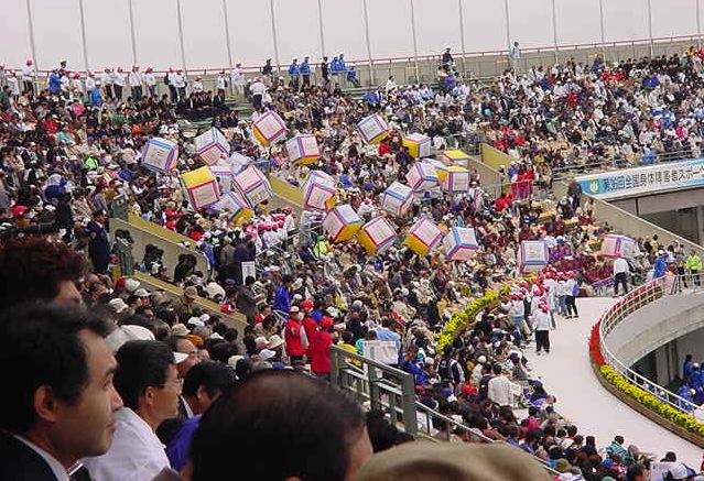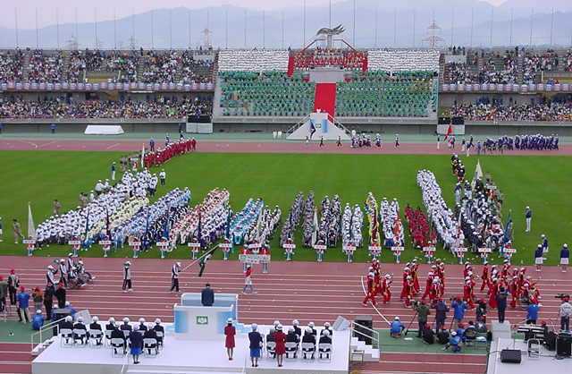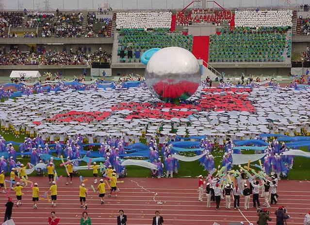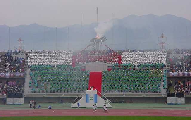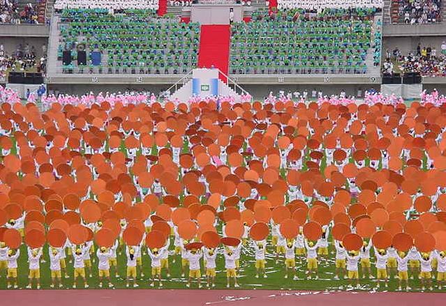 ここからは、皇太子夫妻を再び迎えての「式典後演技」です。 後半には、国体開会式での式典後演技、国体閉会式の 式典前演技と同じものを中核に据えて、要するに同じ ネタで3度、使い回しをした効率的な構成です。(^_^;)