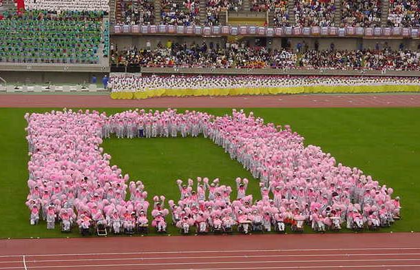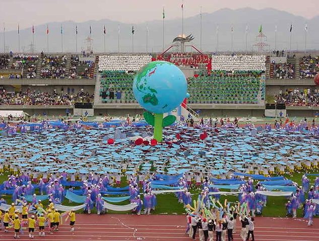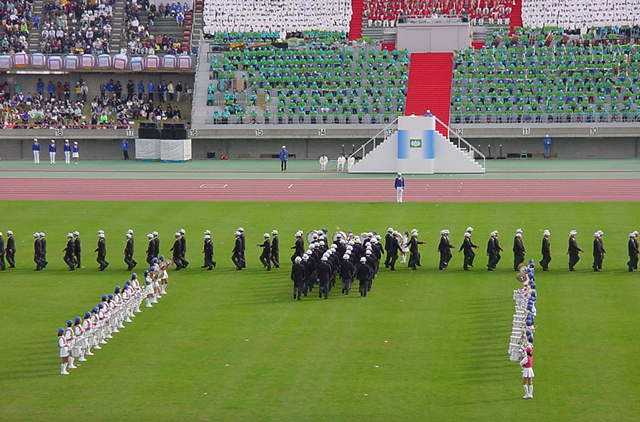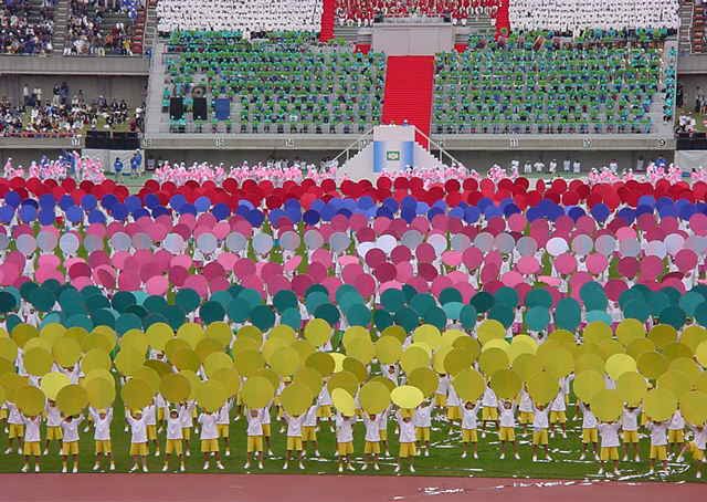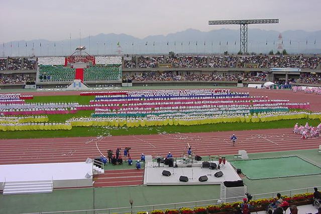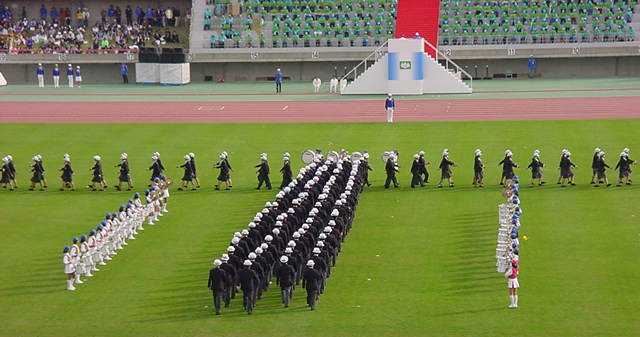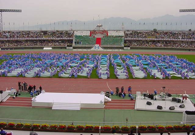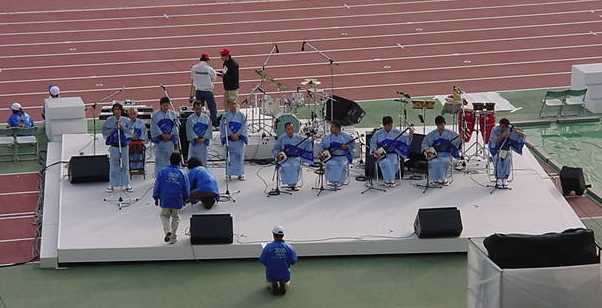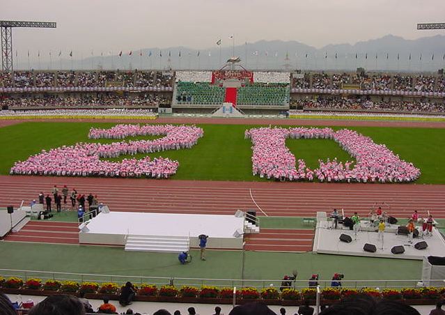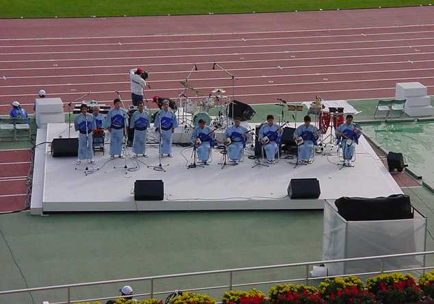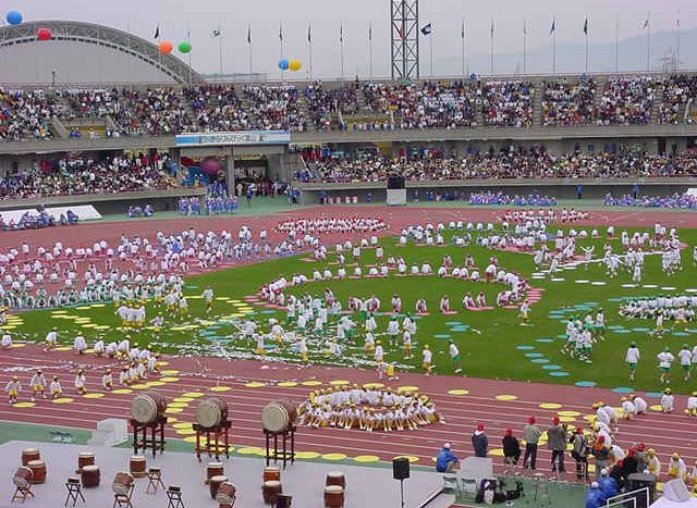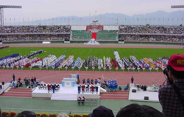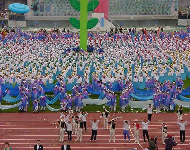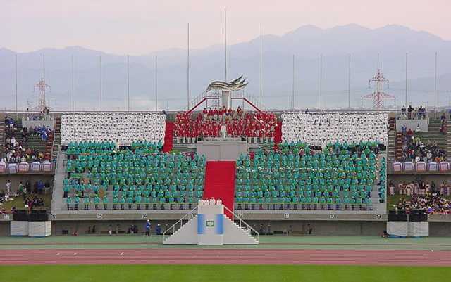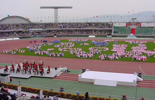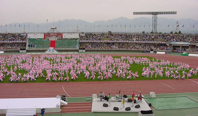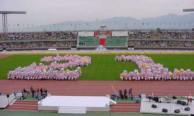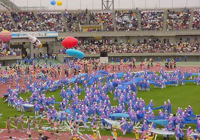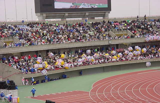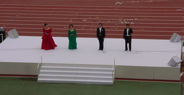 ここからは、皇太子夫妻を再び迎えての「式典後演技」です。 後半には、国体開会式での式典後演技、国体閉会式の 式典前演技と同じものを中核に据えて、要するに同じ ネタで3度、使い回しをした効率的な構成です。(^_^;)