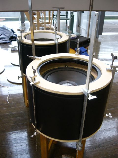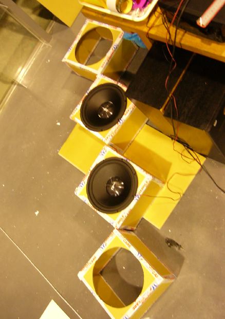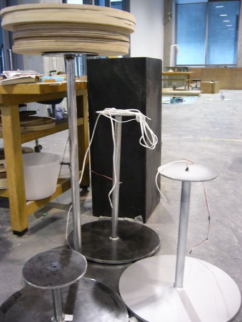 生産造形の山本さんの卒業制作で、サウンド制作の依頼を受けました。 スピーカを仕込んだ造形の上部に、水を張ったアクリルの水槽があり、 サウンドに共鳴して水面に波紋の造形が出来るという作品です。 実物は卒展でご覧いただくとして、以下はメイキング風景の一部です。