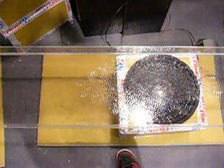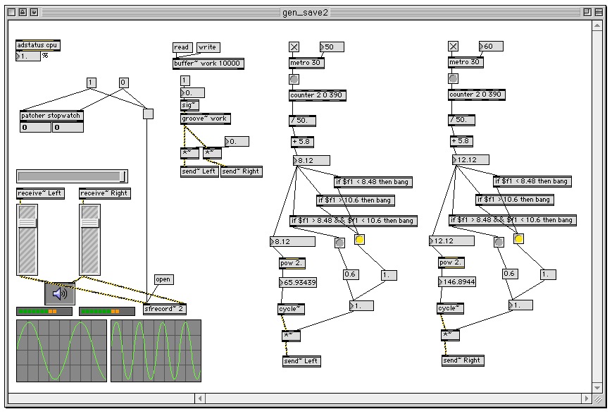 水面に波紋の造形 2005年2月 長嶋洋一 生産造形の山本さんの卒業制作で、サウンド制作の依頼を受けました。 スピーカを仕込んだ造形の上部に、水を張ったアクリルの水槽があり、 サウンドに共鳴して水面に波紋の造形が出来るという作品です。 実物は卒展でご覧いただくとして、以下はメイキング風景の一部です。 サウンド生成のためのMax/MSPパッチ