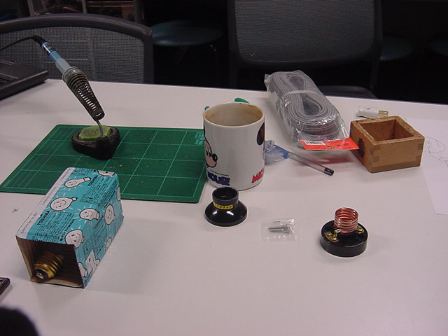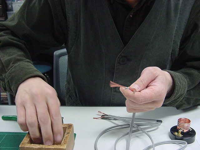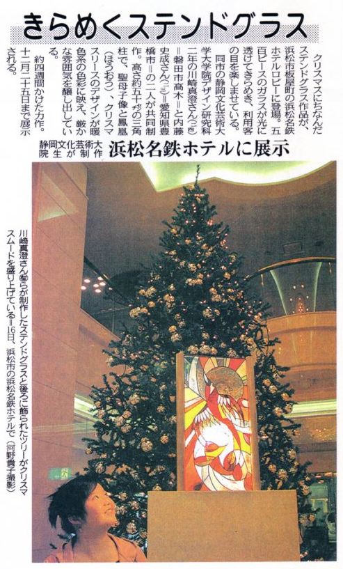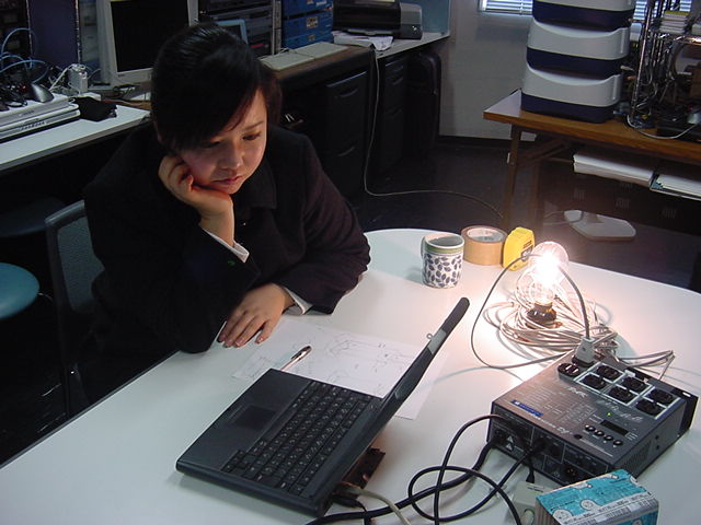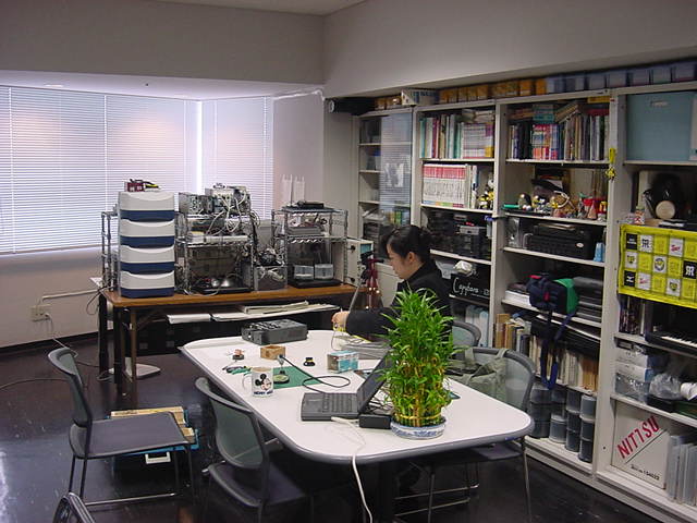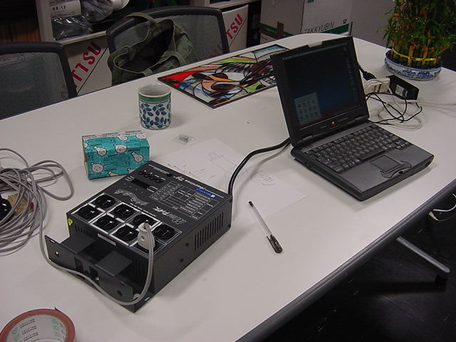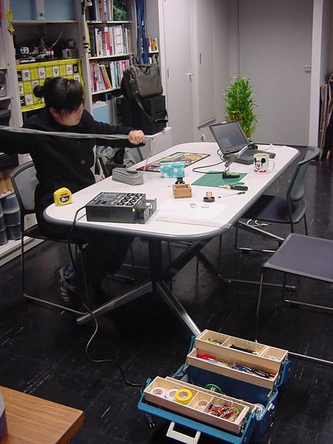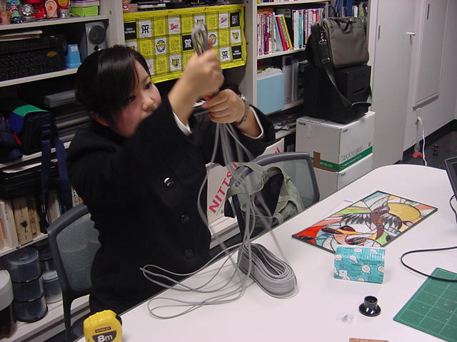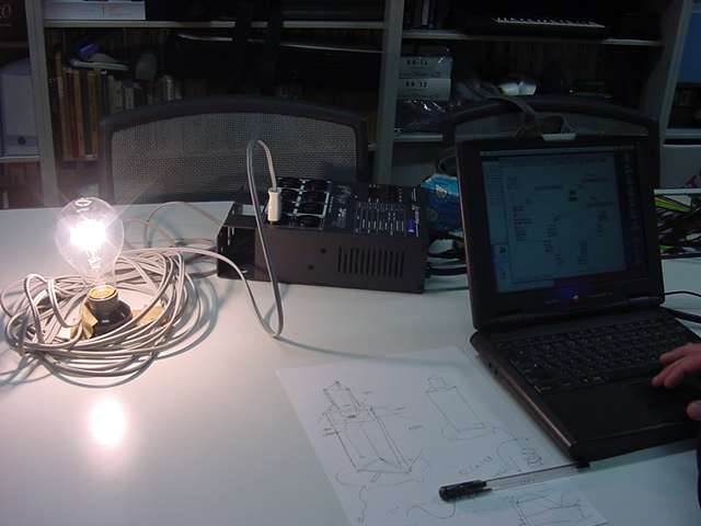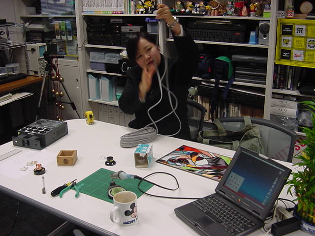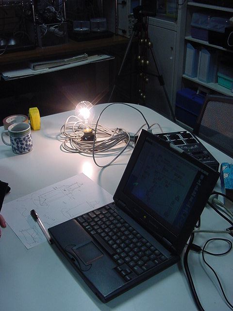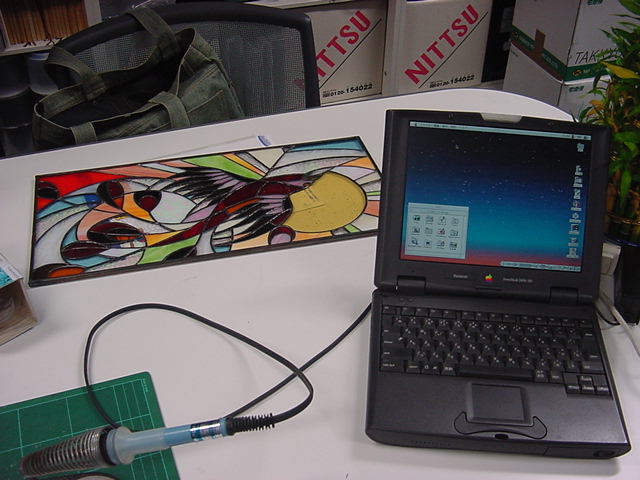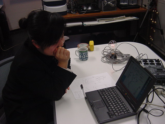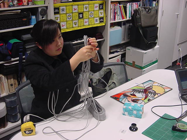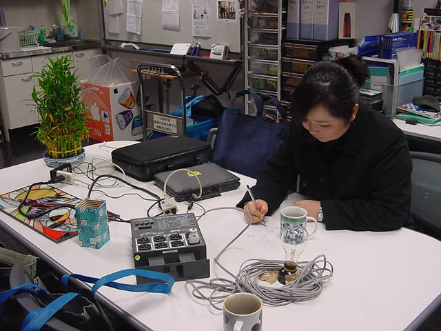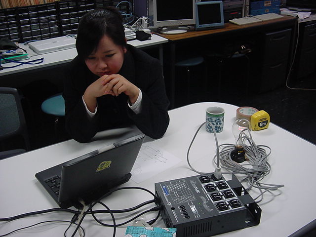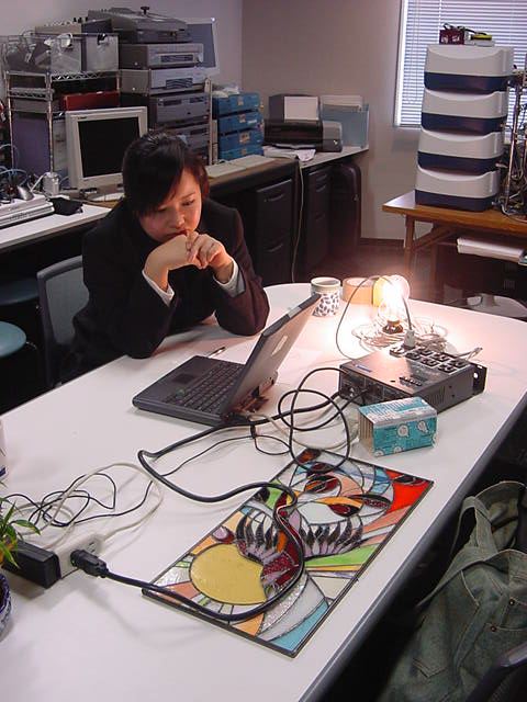 院生 川崎・修了制作 2006年1月 長嶋洋一 技術造形学科1期生で大学院2年の川崎真澄さんが、 修了制作の最後の味付けのために1106研究室に来ました。 川崎さんの作品は、中日新聞にも と載った、ステンドグラスです。 過去にも何度も「虎」を経験した川崎さんは、 今回の修了制作作品の光源に、Max/MSPでライブ制御を加えたい、 とやってきました。以下はその作業風景です。 あとは卒展と同時に開催される修了制作展をお楽しみに。(^_^)