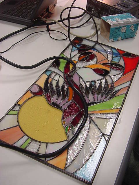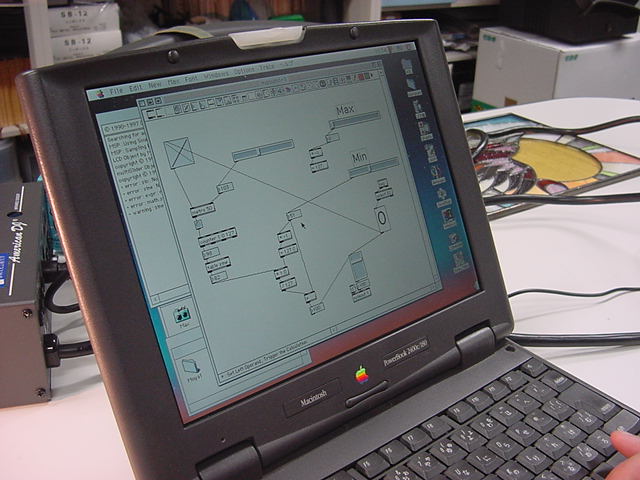 と載った、ステンドグラスです。 過去にも何度も「虎」を経験した川崎さんは、 今回の修了制作作品の光源に、Max/MSPでライブ制御を加えたい、 とやってきました。以下はその作業風景です。