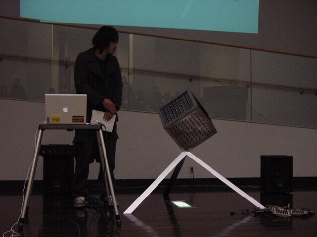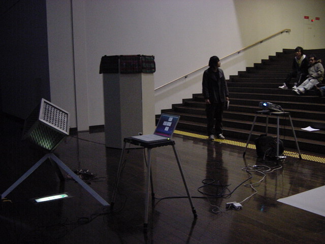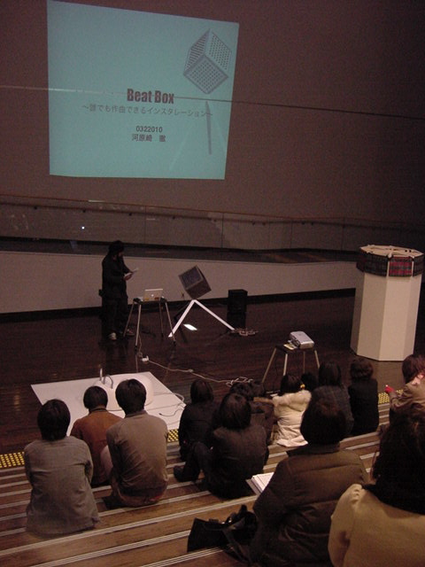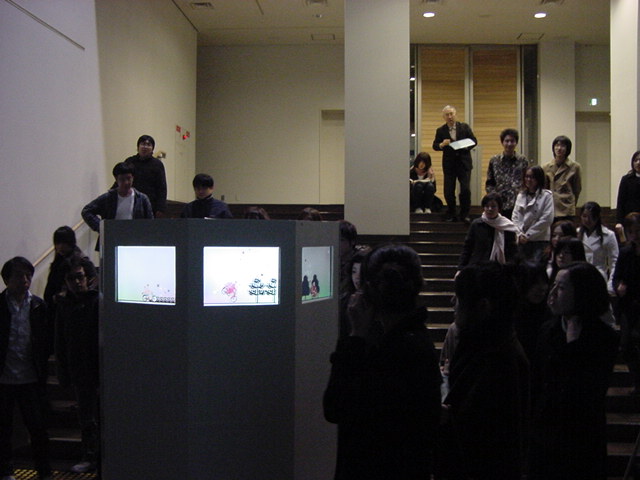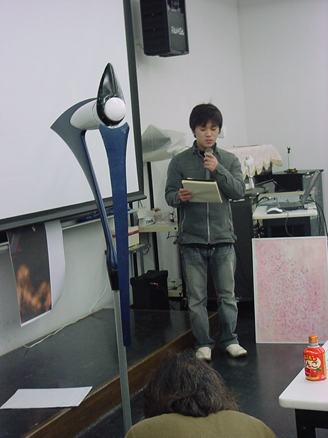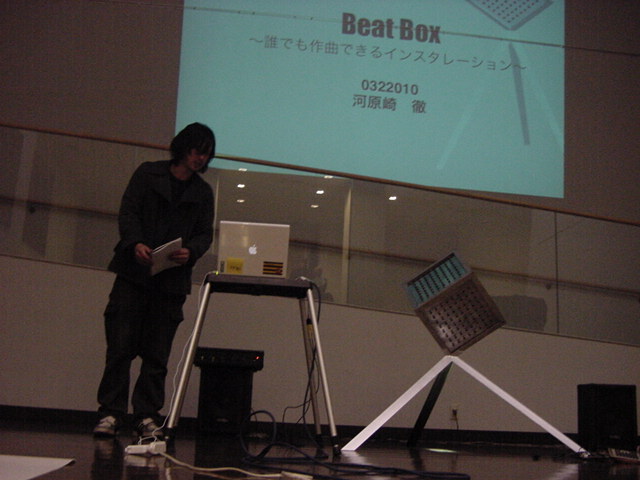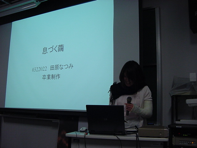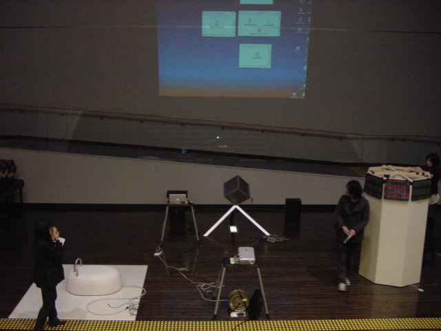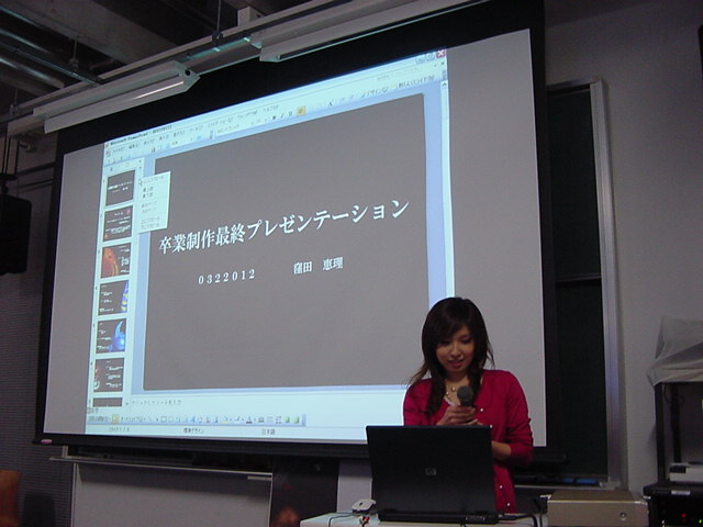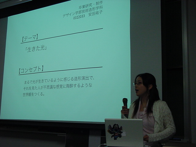 ここに撮ったのは、造形、インスタレーションなど一部だけです。 多数の映像作品、FLASH/Web系作品などは、卒展でどうぞ。 タイムキーパー、機材切替えなどで忙しく、全員は撮れませんでしたがあしからず。