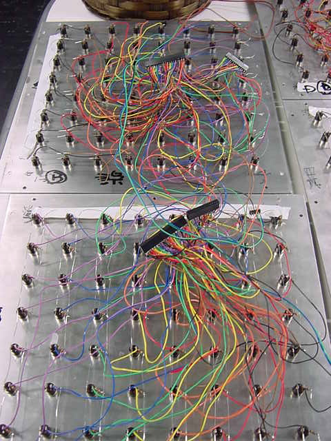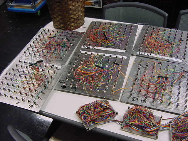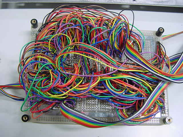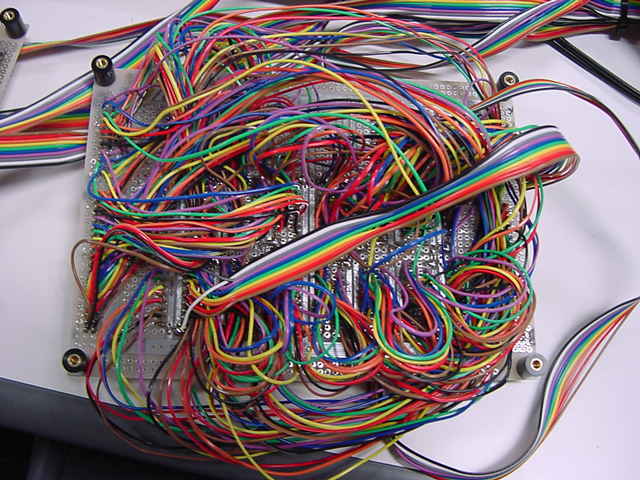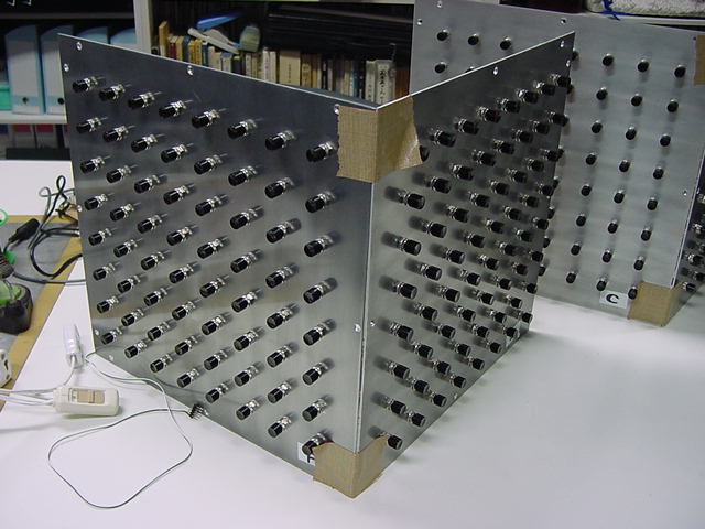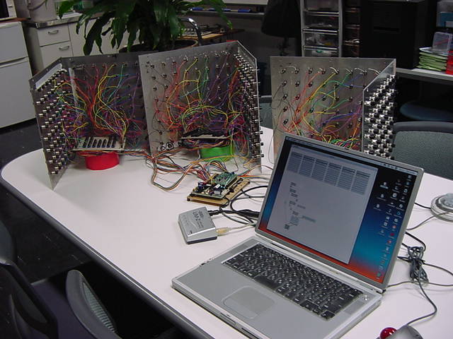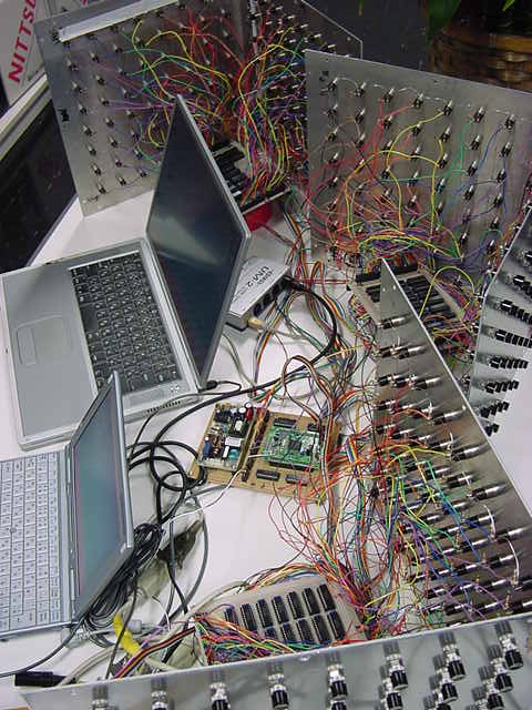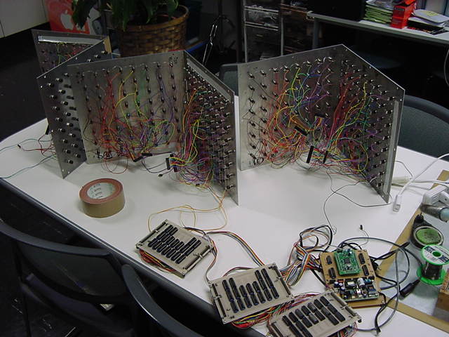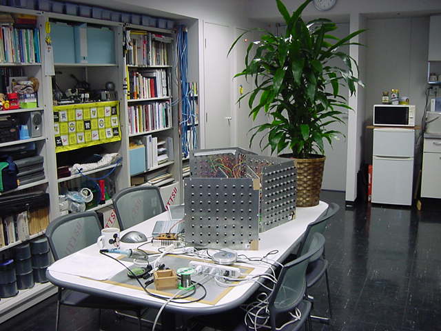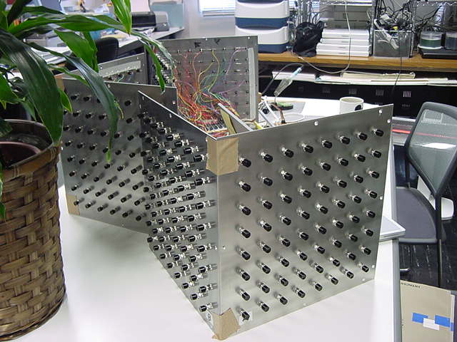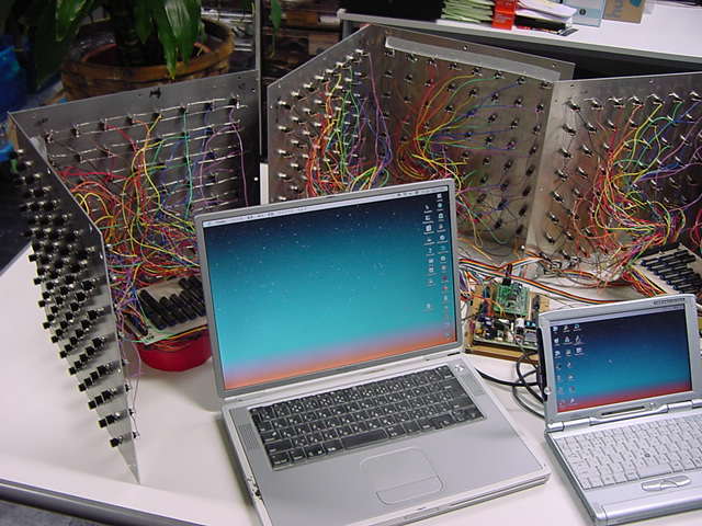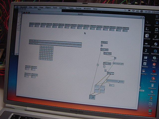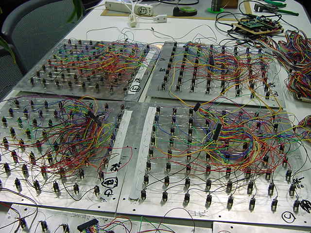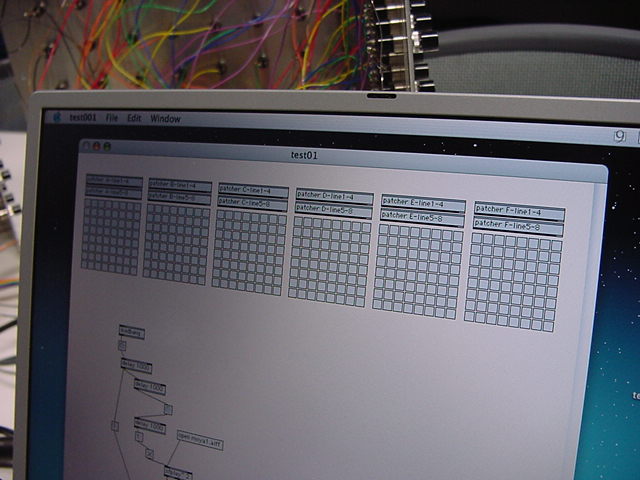 ハード完成と言っていた、河原崎クンの卒制のセンサですが、 パネルからの配線作業(もちろん河原崎クンの仕事)が未完成だったために、 最終発表会には間に合いませんでした。 そしてようやく完成したパネルを取り付けて、一気にセンサのソフト開発、 さらにMaxパッチのテンプレートまで完成させました。 パネルのスイッチ配線の一部、基板の一部に配線のバグがある事もようやくこれで判明しました。 これを直すのはもう、河原崎クンの自己責任であり、僕の出番はオシマイです。 さて、卒展までにどうなるか、楽しみです。