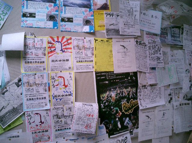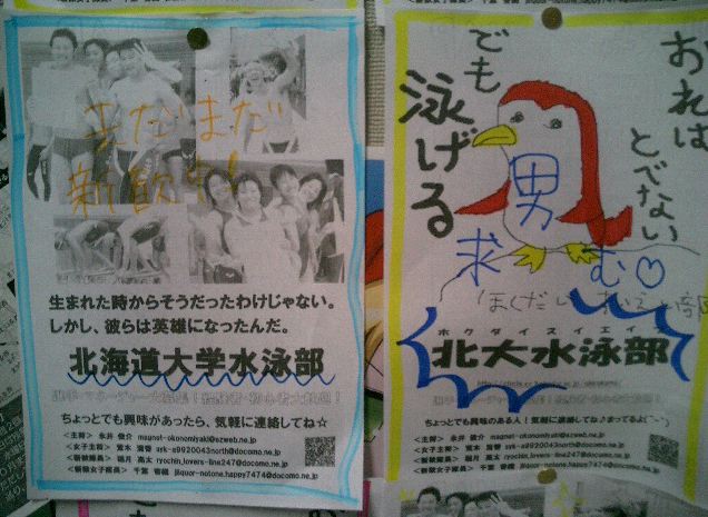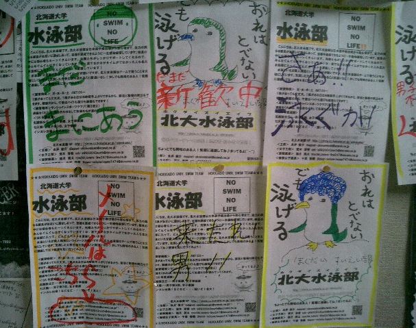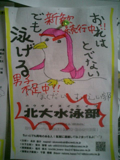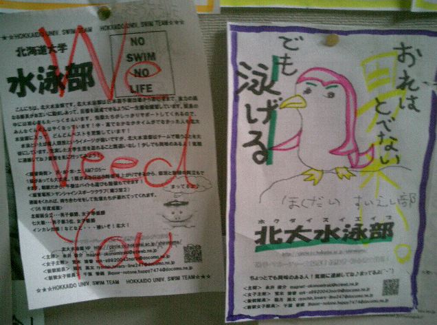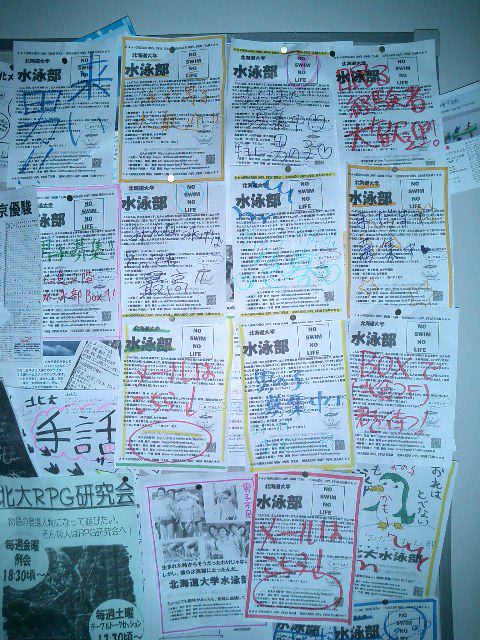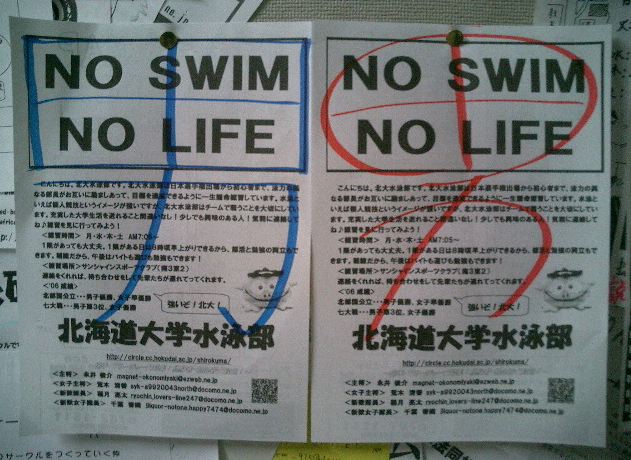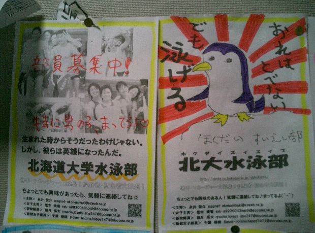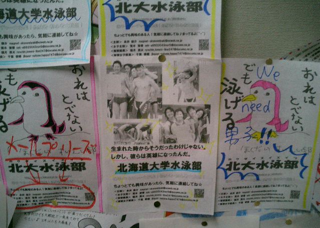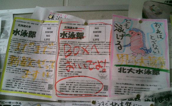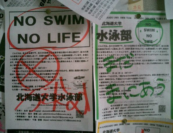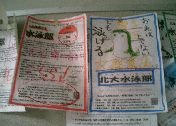 廊下には、さーくるのビラがびっしりと貼られていましたが、 なんといっても印象があったのが水泳部でした。 ★ ★
