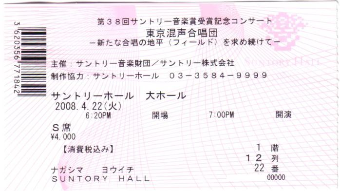 サントリーホール・東混 2008年4月 長嶋洋一 久しぶりに、サントリーホールのコンサートに行ってきました。 サントリー音楽賞記念演奏会、東京混声合唱団。 31年前からレコードで知っている「追分節考」の生演奏の初体験です。 ホール設立時からの会員なので、一般発売より前にチケットを入手しました。 座席はド真ん中の特等席。周囲には有名な作曲家がたくさんいました。 演奏はもちろん、大満足の満腹です。特に1曲目と4曲目がよかった(^_^)。