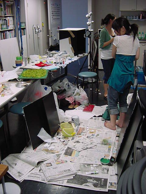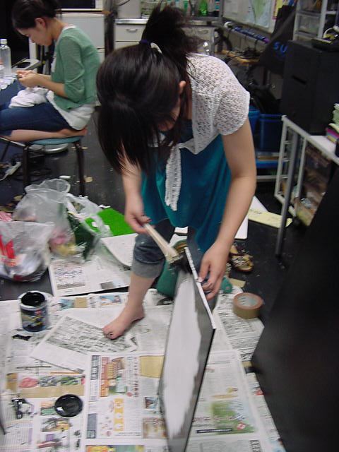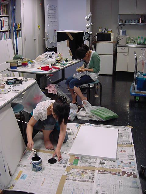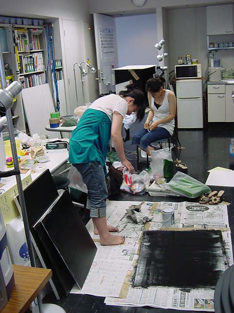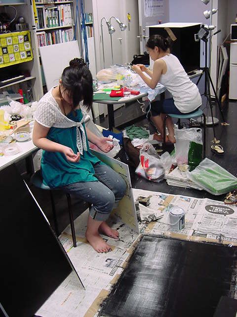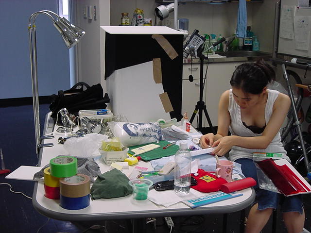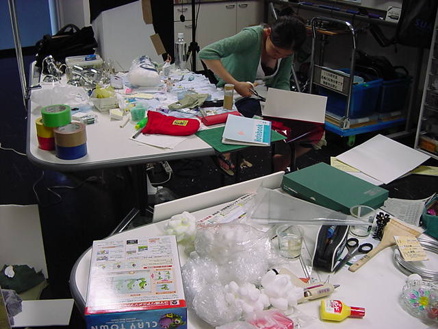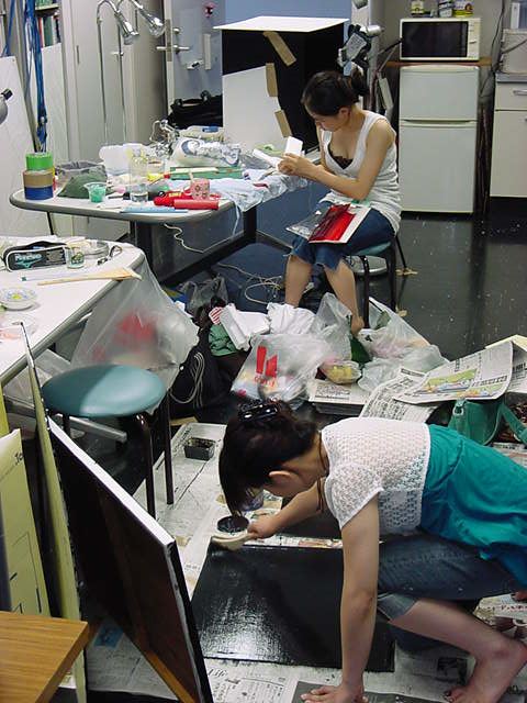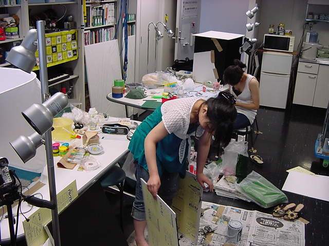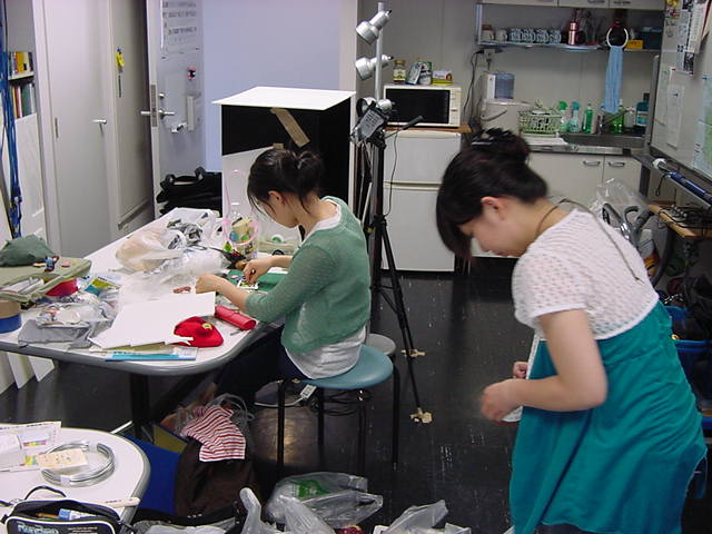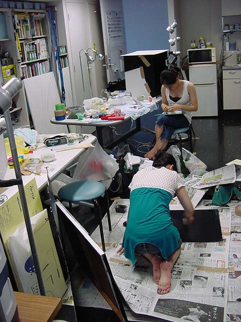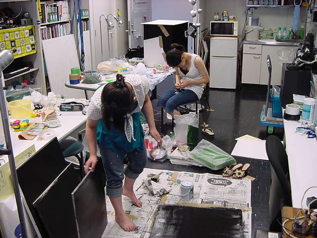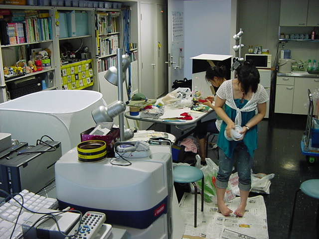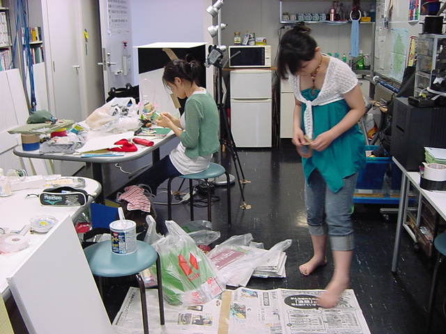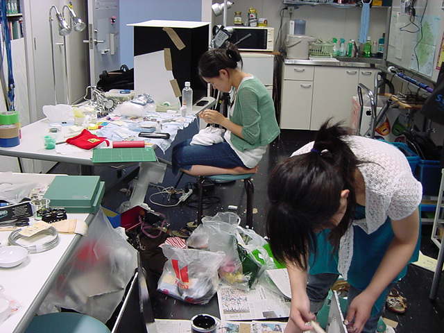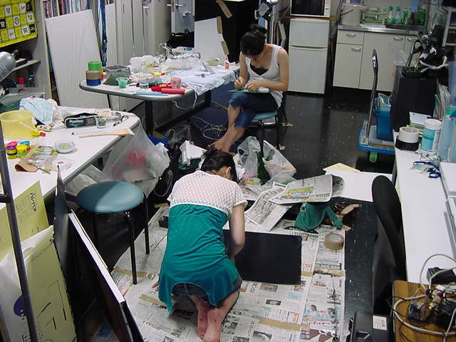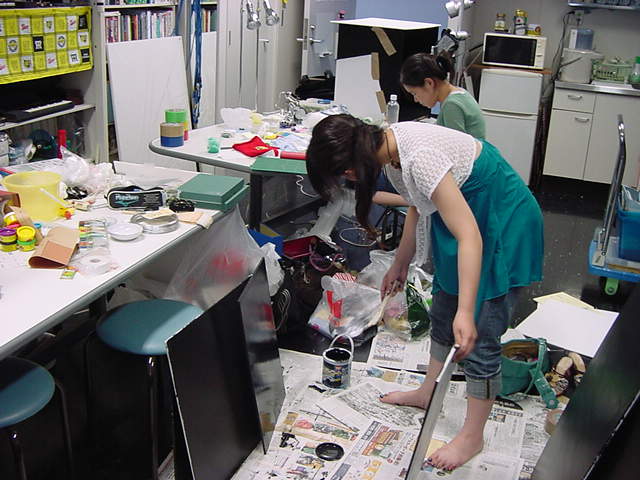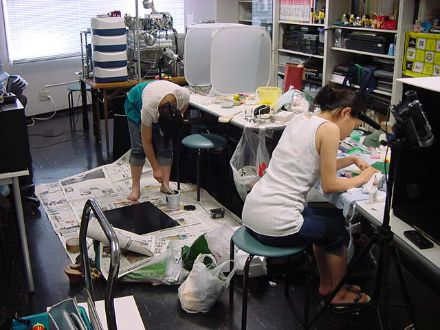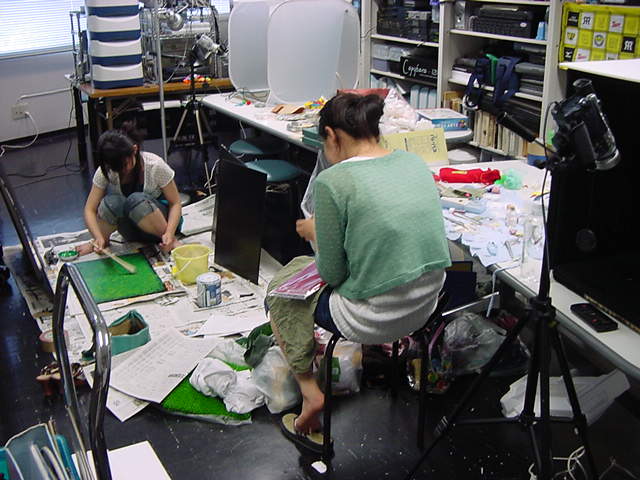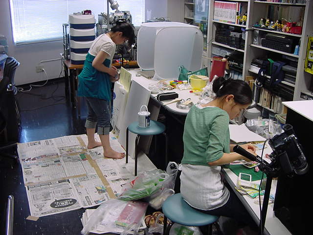 23期・虎の穴「アニメーションに挑戦」の4日目、8月15日です。お盆のバイトに捕まった石川さんは今日と明日はお休みということで、 この日は岩本さんと遠藤さんの2人で、ひたすらアニメのための準備制作に没頭しました。 午前中に100分ほど、カーマに材料の買い出しに行きました(この部分はカット)が、 9時から18時まで頑張った その模様です。 自分のこだわりアニメを作るんだ、という意欲が伝わってくる集中力です。 SUACが開学して以来、7年目に入った1106研究室ですが、 ここまで足の踏み場の無い修羅場となったのは初めてです(^_^;)。