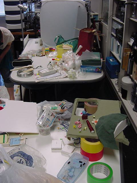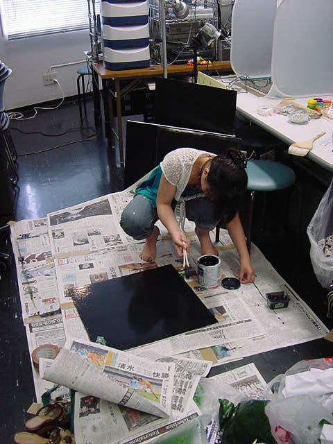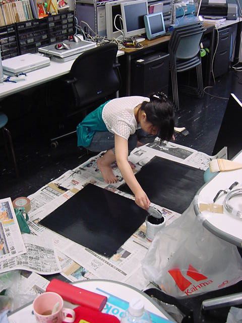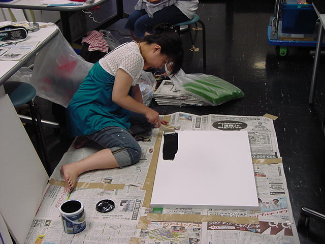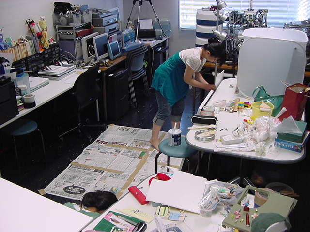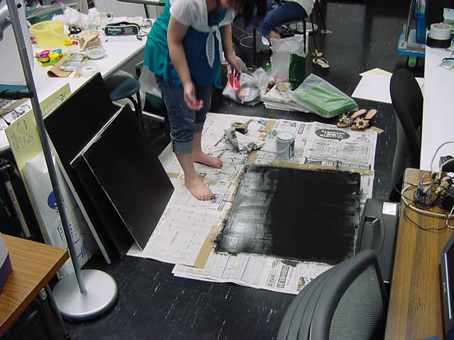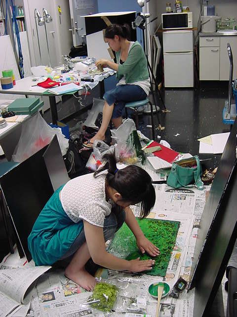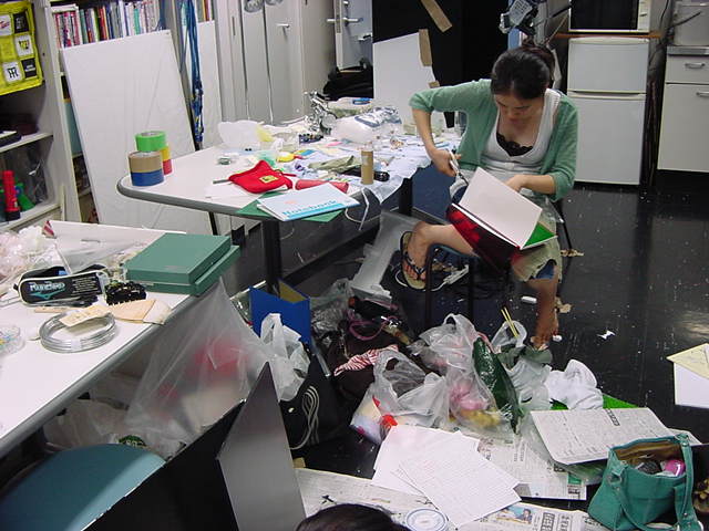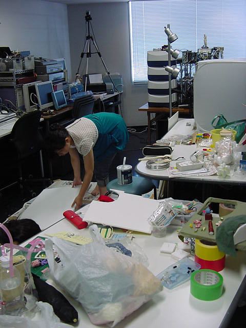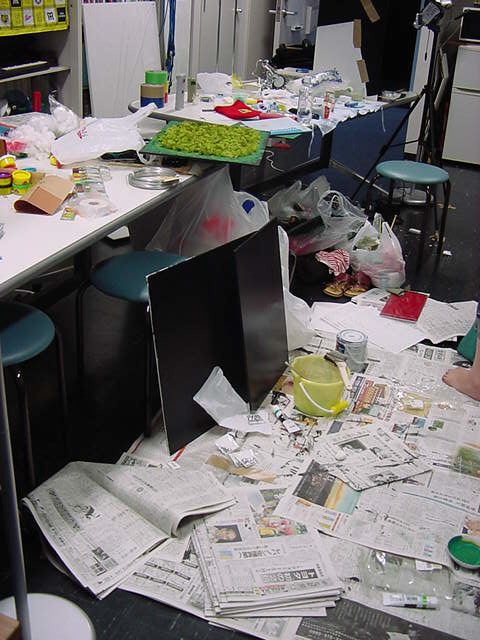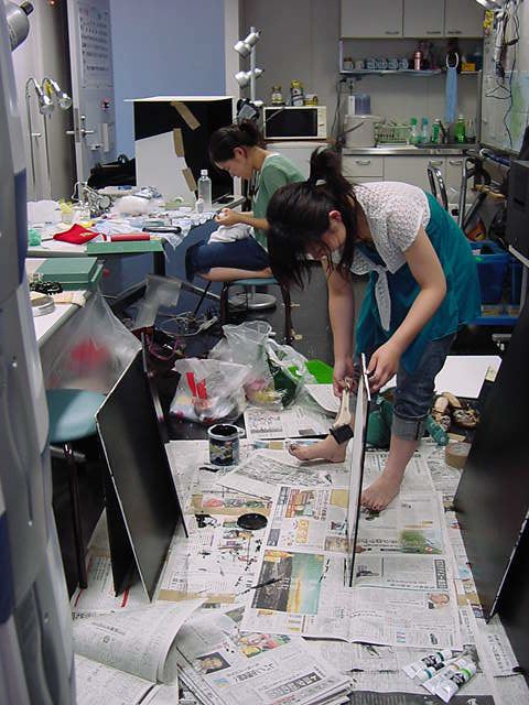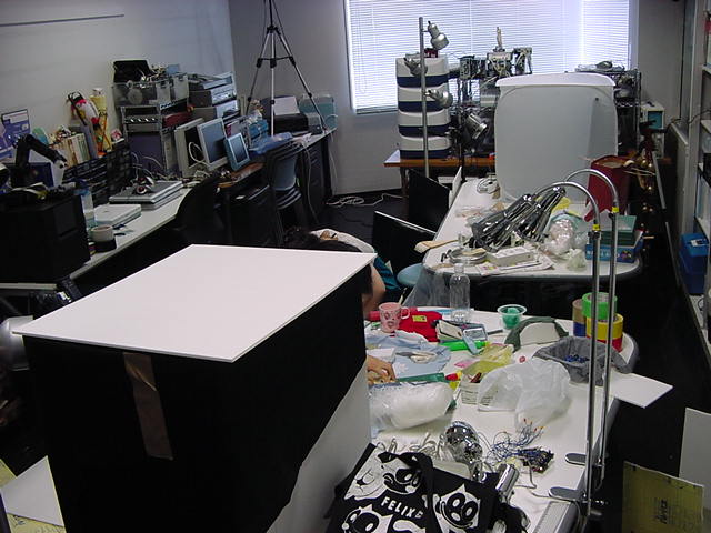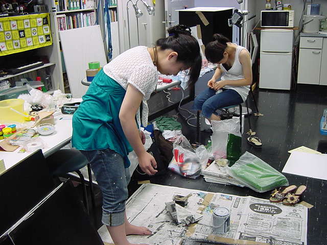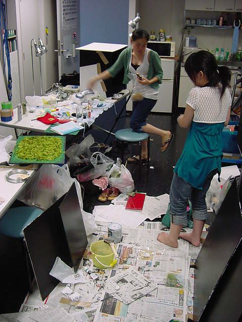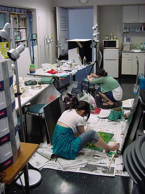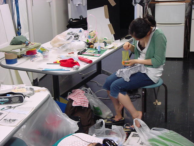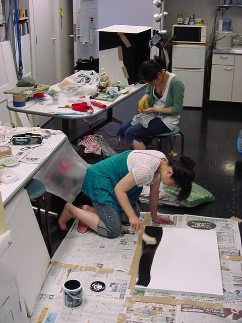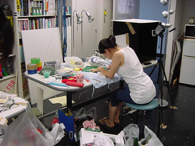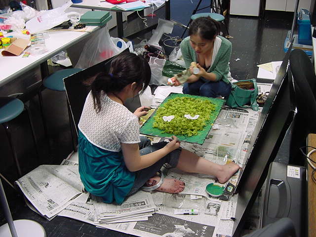 23期・虎の穴「アニメーションに挑戦」の4日目、8月15日です。お盆のバイトに捕まった石川さんは今日と明日はお休みということで、 この日は岩本さんと遠藤さんの2人で、ひたすらアニメのための準備制作に没頭しました。 午前中に100分ほど、カーマに材料の買い出しに行きました(この部分はカット)が、 9時から18時まで頑張った その模様です。 自分のこだわりアニメを作るんだ、という意欲が伝わってくる集中力です。 SUACが開学して以来、7年目に入った1106研究室ですが、 ここまで足の踏み場の無い修羅場となったのは初めてです(^_^;)。