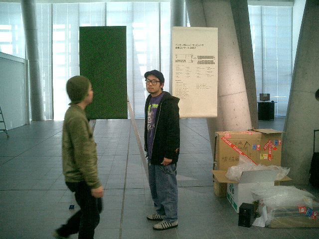 多摩美でのインターカレッジ2007に参加しました。 SUACからの発表者は、M2の嶋田クン、4回生の山口クン、3回生の山田さんの3人で、 計6作品を発表展示・公演しました。 以下、なんとなく撮影した記録です。 途中で山田さんにカメラを預けたので、学食とか猫とか、僕が関知しないものも映っています。 今回は半分以上が山田さんの撮影でした。 ムービーは別途にありますが、講義の中で紹介します。 ・・・お疲れさまでした。