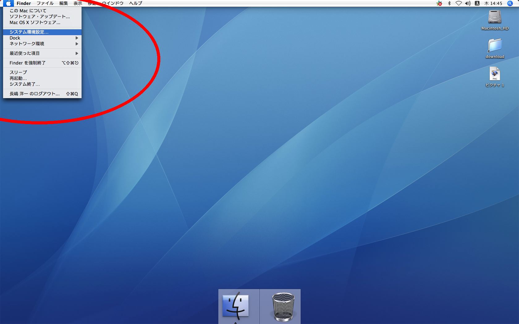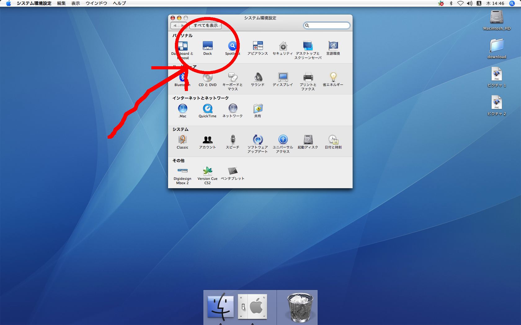 - デスクトップ中央下部にあるのが「DOCK」です。これがソフトを使う場合に邪魔になる場合には、 アップルマークの下のメニューから「システム環境設定」を選んで