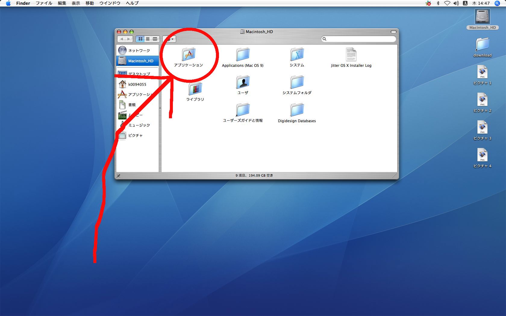 - アプリケーションはエイリアス(ショートカット)をデスクトップに置いたり、DOCKに並べたりして いません。このため、アプリケーションは以下のように呼び出します。 まず、デスクトップ右上の「Macintosh_HD」をダブルクリックで開き、その中の「アプリケーション」を 開きます。