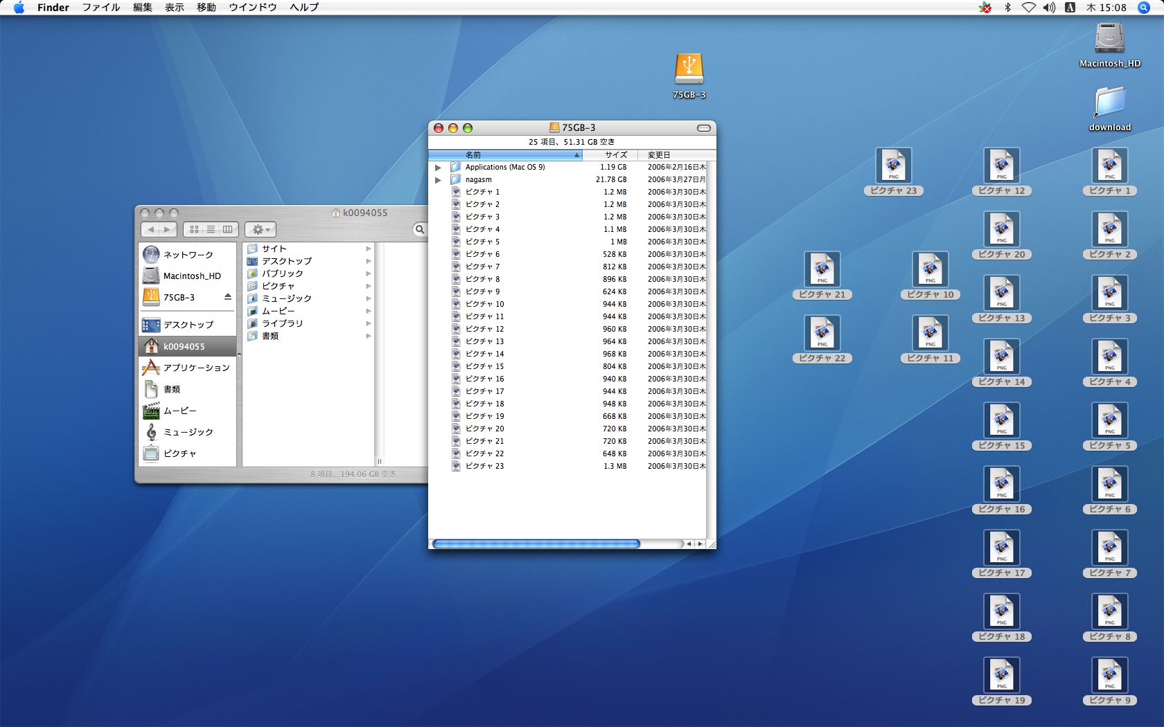 - デスクトップにアイコンが現れる(マウントされる)ので、必要なデータをドラッグしてコピーします。 以下は、デスクトップにある多数の「ピクチャ」というデータを全て選んで、マウントされた 「75GB-3」というHDDにコピーした模様の例です。