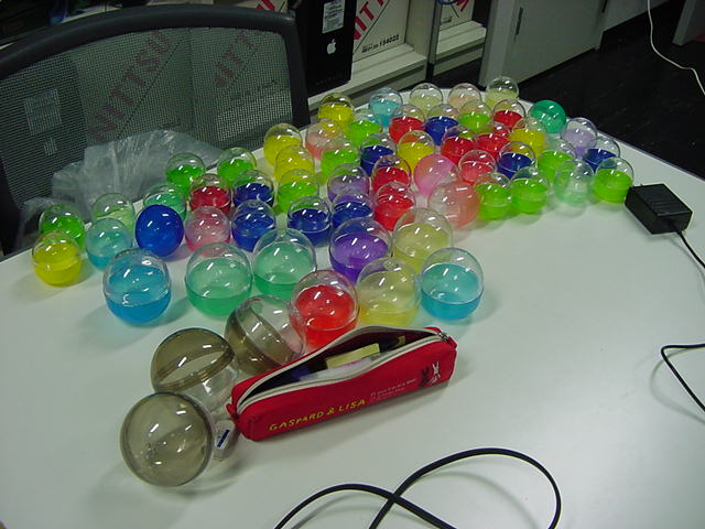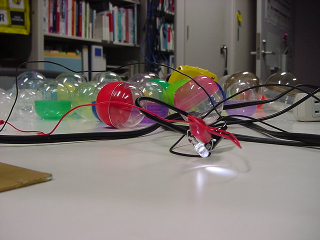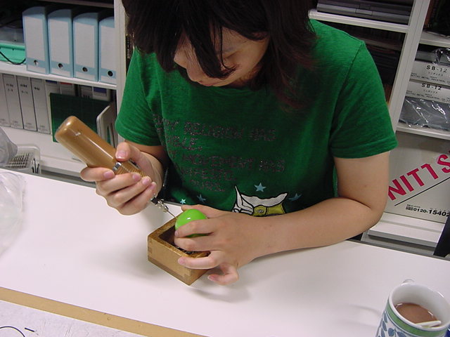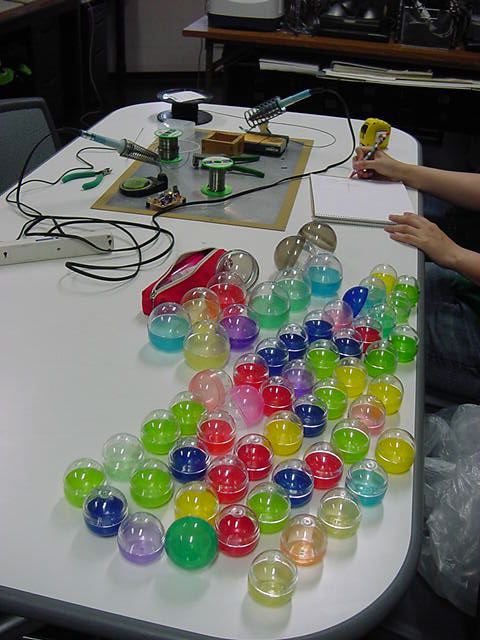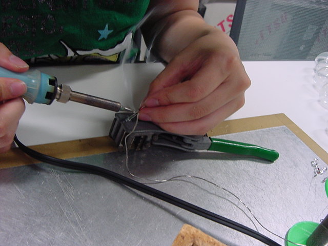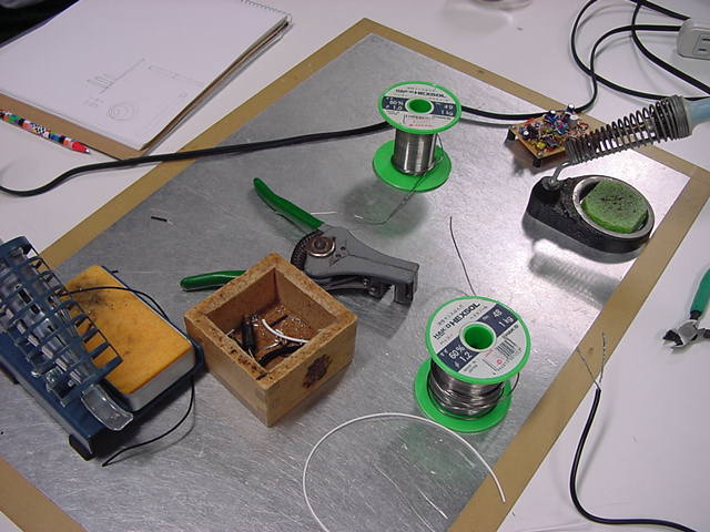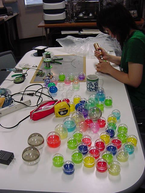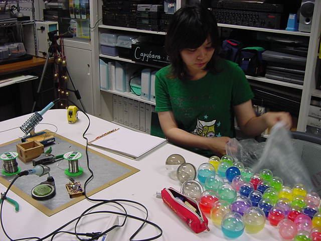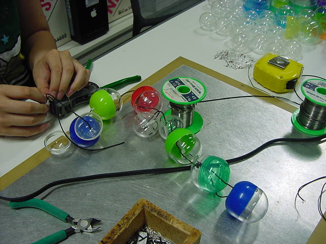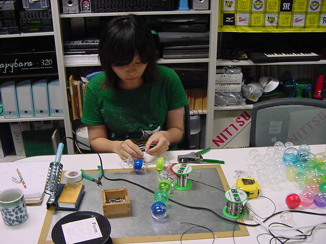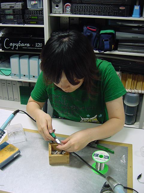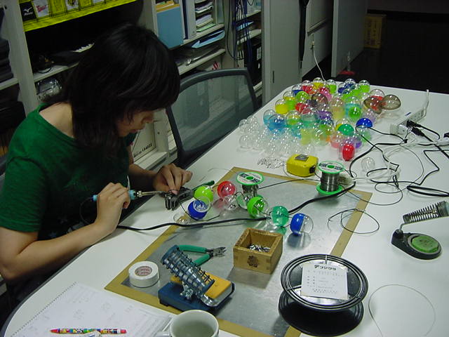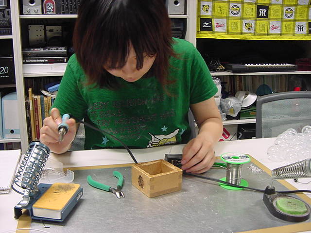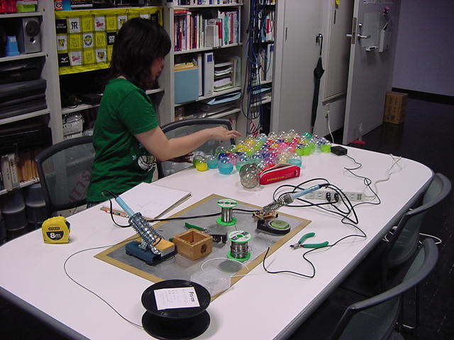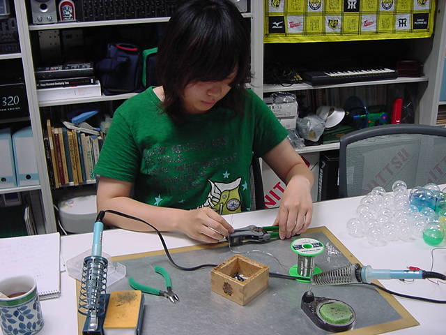 岡元ハンダ 2006年7月 長嶋洋一 前日の プログラマー山田 に続いて、22虎の岡元さんは、インスタレーションの中核となる、 白色LEDのハンダ付けの一日を過ごしました。 まだ作業は最初の段階ですが、あとはオープンキャンパスでの作品展示をお楽しみに。(^_^)