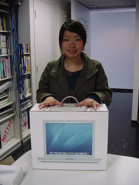 西沢 iBookG4 が来た(^_^) 2006年5月 長嶋洋一 技術造形学科1回生の西沢さんが、遂に下宿用にiBookG4を買いました。 これから浜松まつりの映像編集とかに挑戦するので、 その準備も兼ねて、セットアップを1106で手伝いました。 Classicモードとかもあれこれ入れて、もうこれであとはデザインあるのみ。頑張ろう(^_^)。