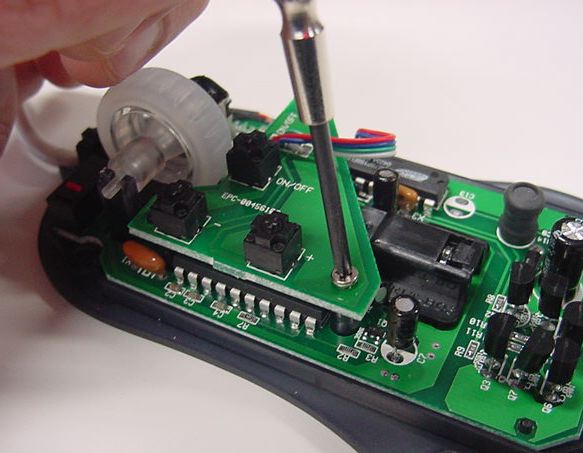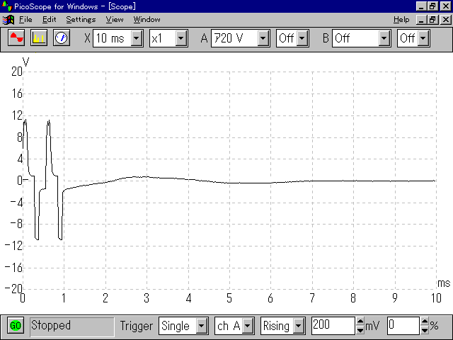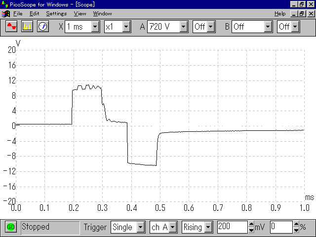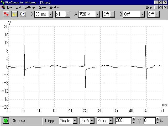 ここでお約束のオシロを出して、ピリピリの電気信号を計測してみました。