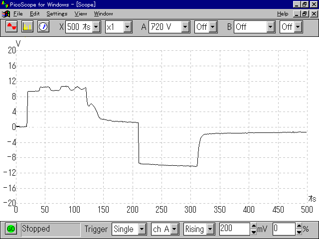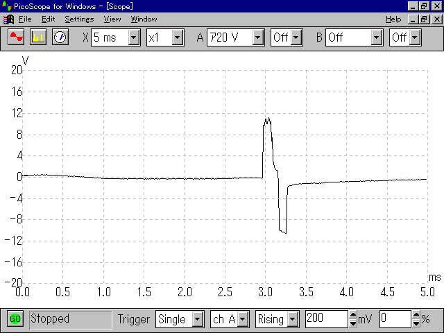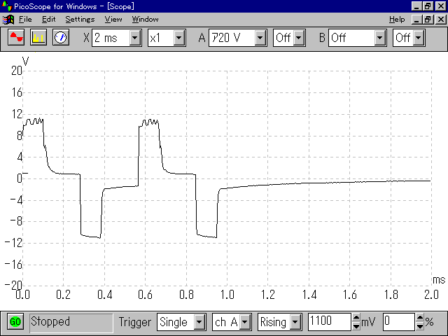 ここでお約束のオシロを出して、ピリピリの電気信号を計測してみました。