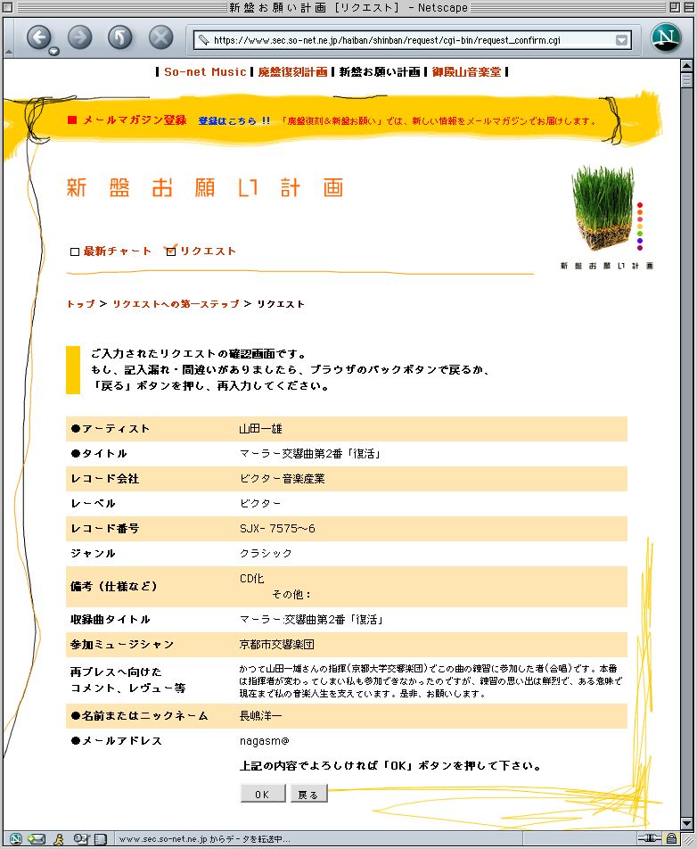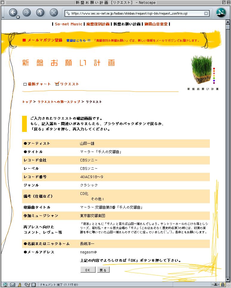 このページに行って、 いちばん下にある リクエストのページに、 以下をコピペしてリクエストに協力していただければ、とっても嬉しいです。★交響曲第2番「復活」をリクエストする場合★ ●アーティスト 山田一雄 ●タイトル マーラー交響曲第2番「復活」 ●レコード会社 ビクター音楽産業 ●レーベル ビクター ●レコード番号 SJX- 7575〜6 ●ジャンル クラシック ●備考(仕様など) CD化 ●収録曲タイトル マーラー:交響曲第2番「復活」 ●参加ミュージシャン 京都市交響楽団 ●再プレスへ向けたコメント、レヴュー等の意気込み等お書きください! ●名前またはニックネームをお書きください。 ●メールアドレスをお書きください。 ★交響曲第8番「千人の交響曲」をリクエストする場合★ ●アーティスト 山田一雄 ●タイトル マーラー「千人の交響曲」 ●レコード会社 CBSソニー ●レーベル CBSソニー ●レコード番号 40AC918〜9 ●ジャンル クラシック ●備考(仕様など) CD化 ●収録曲タイトル マーラー:交響曲第8番「千人の交響曲」 ●参加ミュージシャン 東京都交響楽団 ●再プレスへ向けたコメント、レヴュー等の意気込み等お書きください! ●名前またはニックネームをお書きください。 ●メールアドレスをお書きください。こんなカンジにお願いします。