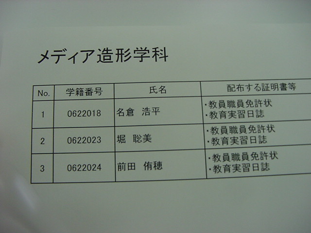 今年もまた、オークラを上がっていく、このパターンとなりました。 後半の写真は関係者以外はパスして下さい(^_^;)。 講堂・卒業式 メディア造形学科・卒業証書授与式 出会いの広場 記念写真撮影 1次会 ホテルオークラ4階 2次会 ホテルオークラ30階 3次会 ホテルオークラ42階スイート古田ルーム ちょっと恐い写真(^_^;) ちょっと恐い写真(^_^;) ちょっと恐い写真(^_^;)