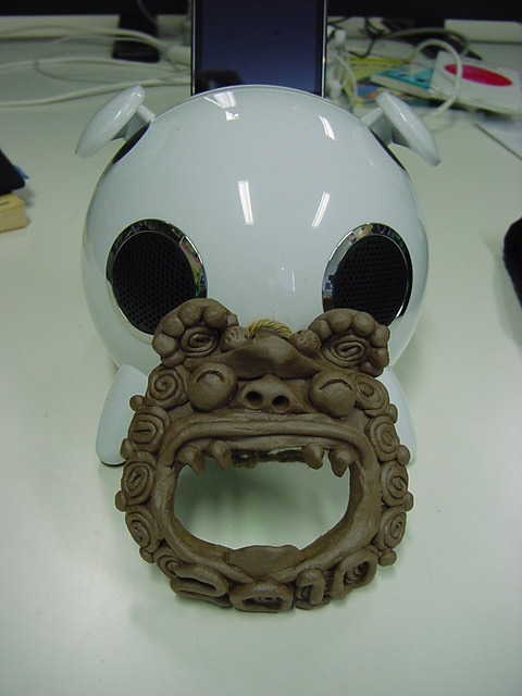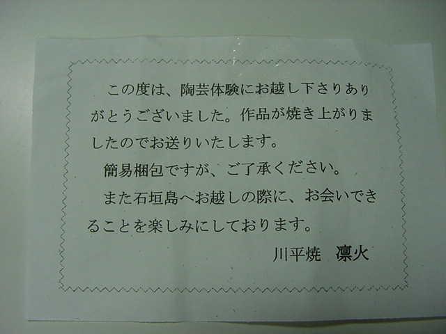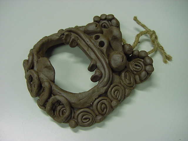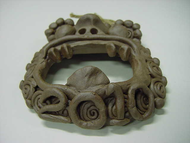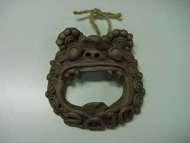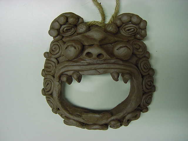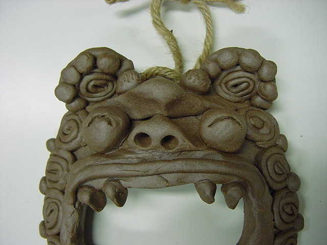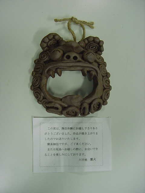 初めての陶芸作品(^_^;) 2010年3月 長嶋洋一 この2月に 石垣島 に行った時に、雨が降ってきたために、時間つぶしに「陶芸体験工房」に行きました。 そこで作った、壁掛けシーサーが、焼かれて送られてきました。 恥ずかしながら、生まれて初めての40-50分ほどの陶芸体験でした。