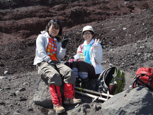 このように半年前から準備をして、 ゼミ4回生の伊熊さん・田畑さんとともに、3度目となる富士山登山に挑戦しました。 前回は12年前でしたが、 ルートはいつもの富士宮口(新5合目)からとして、今回は9合目「万年雪山荘」に泊まりました。 狙いすました平日ということで、道路も登山道も山荘も空いていました。 そして驚くほどの好天に恵まれましたが、そのために強烈に日焼けしました。